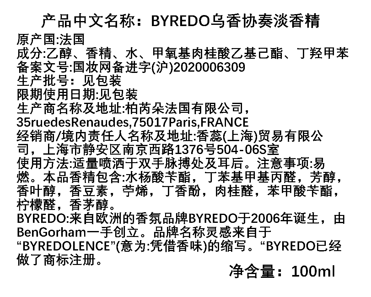 BYREDO百瑞德/柏芮朵 和谐沉香/乌香协奏香水