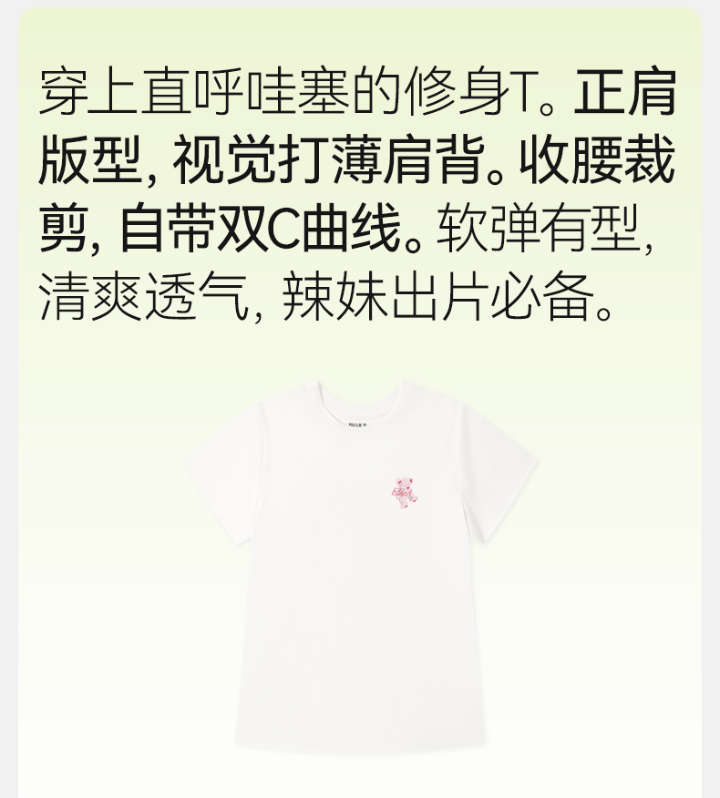 「棉的美学」极简修身粉色小熊印花T恤夏季新款收腰显瘦百搭上衣
