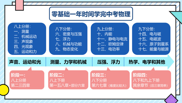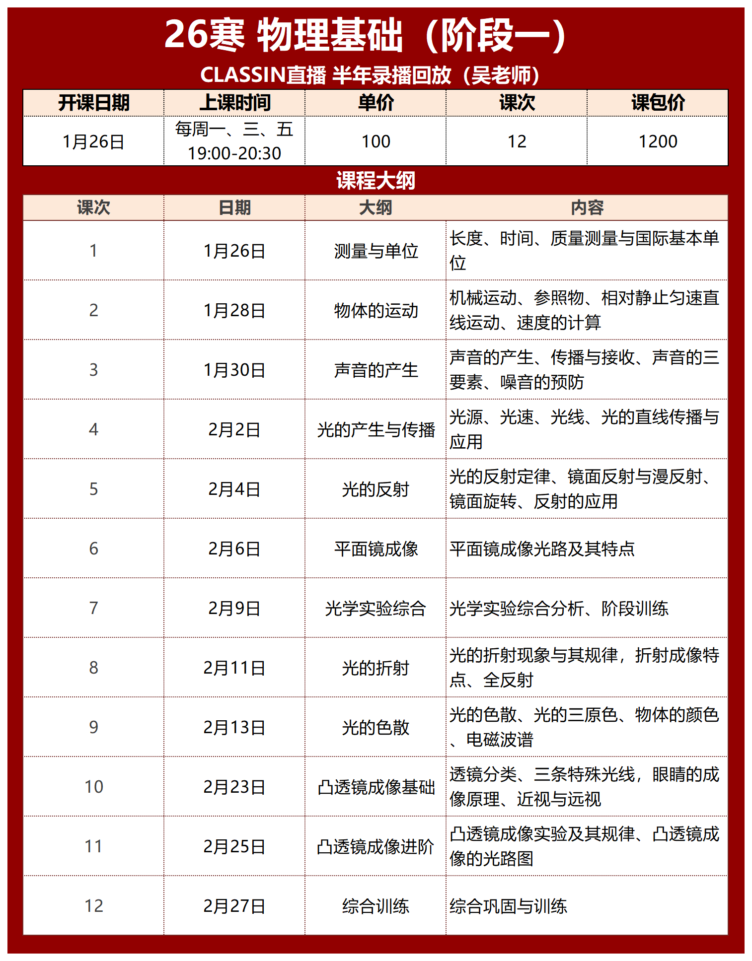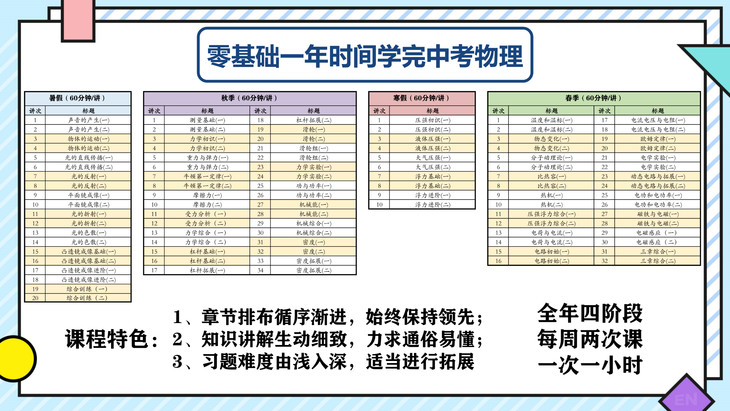 此课程分三期(寒假、春季、暑假)学完整个校内初中物理基础内容,跟校内知识点完全匹配,可作为校内物理的提前预习