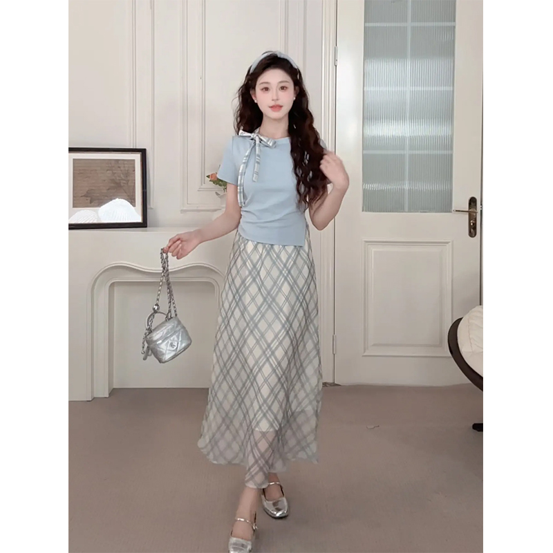 鹿向南「翩翩少女」法式格子假两件女连衣裙夏季高腰显瘦A字长裙