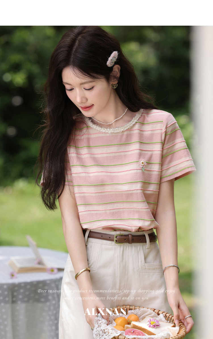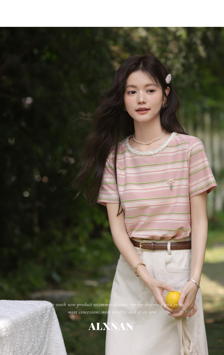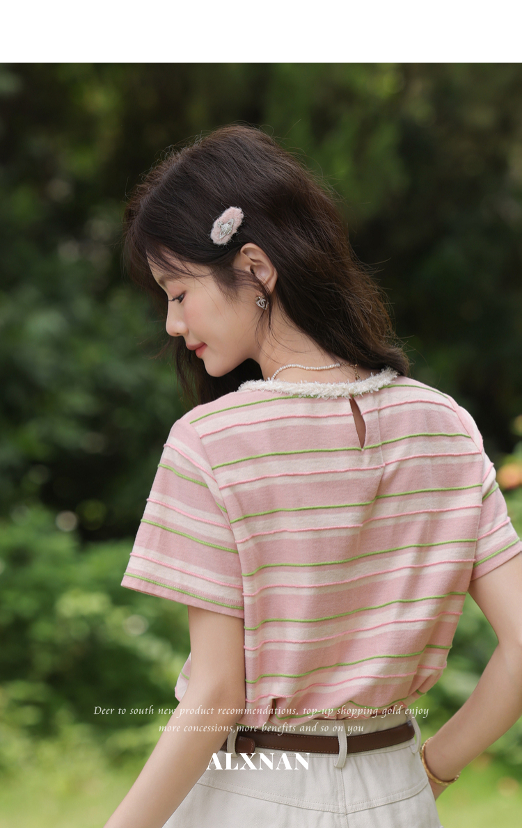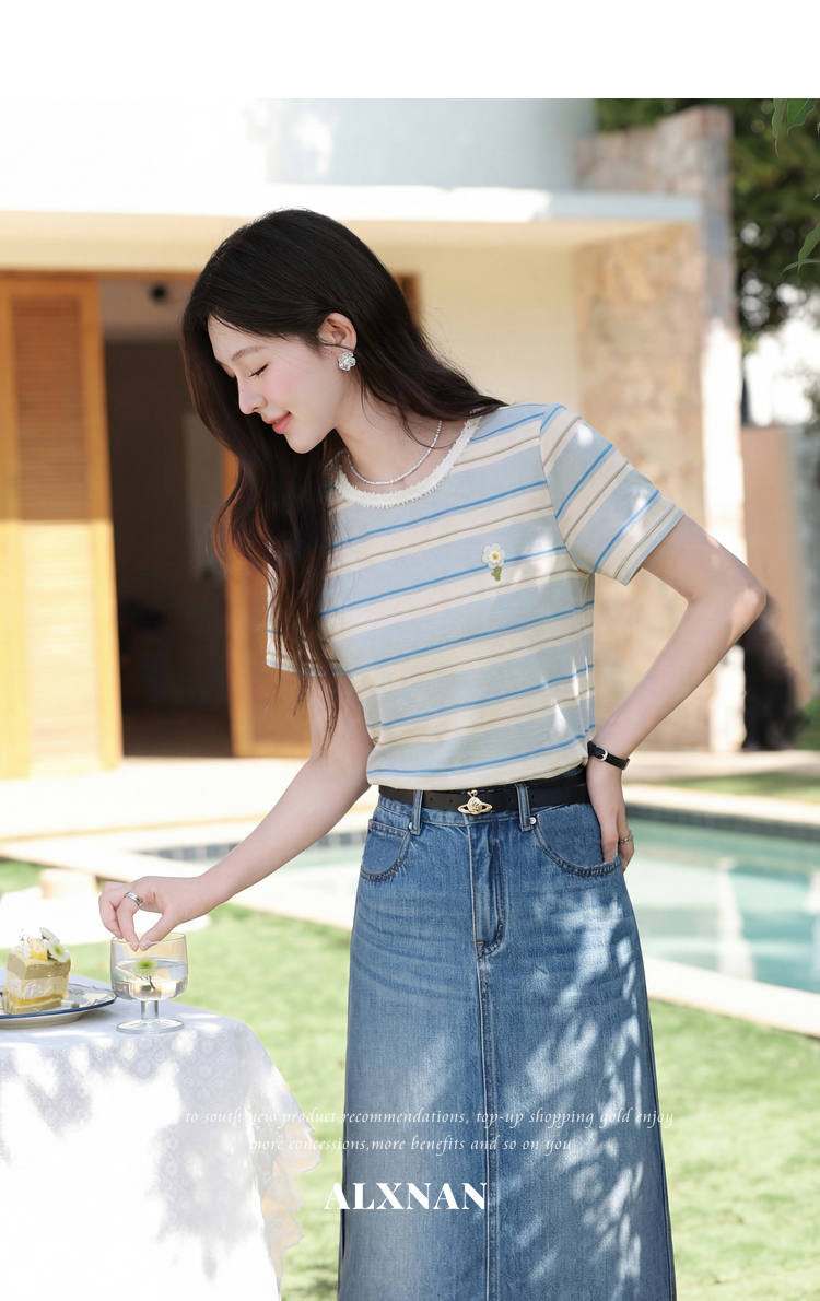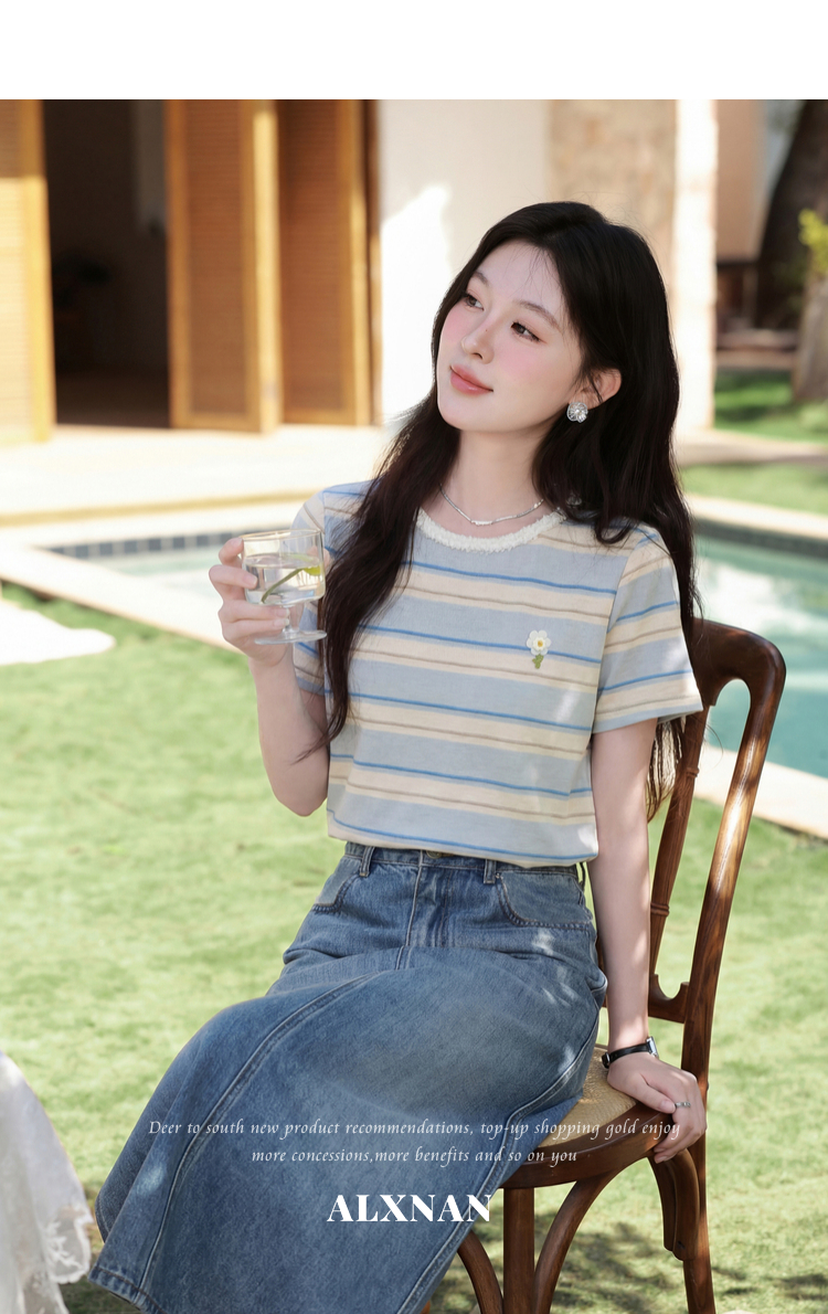 鹿向南「蓝沁冰茶」气质蓝色条纹T恤女夏季新款法式洋气短袖上衣