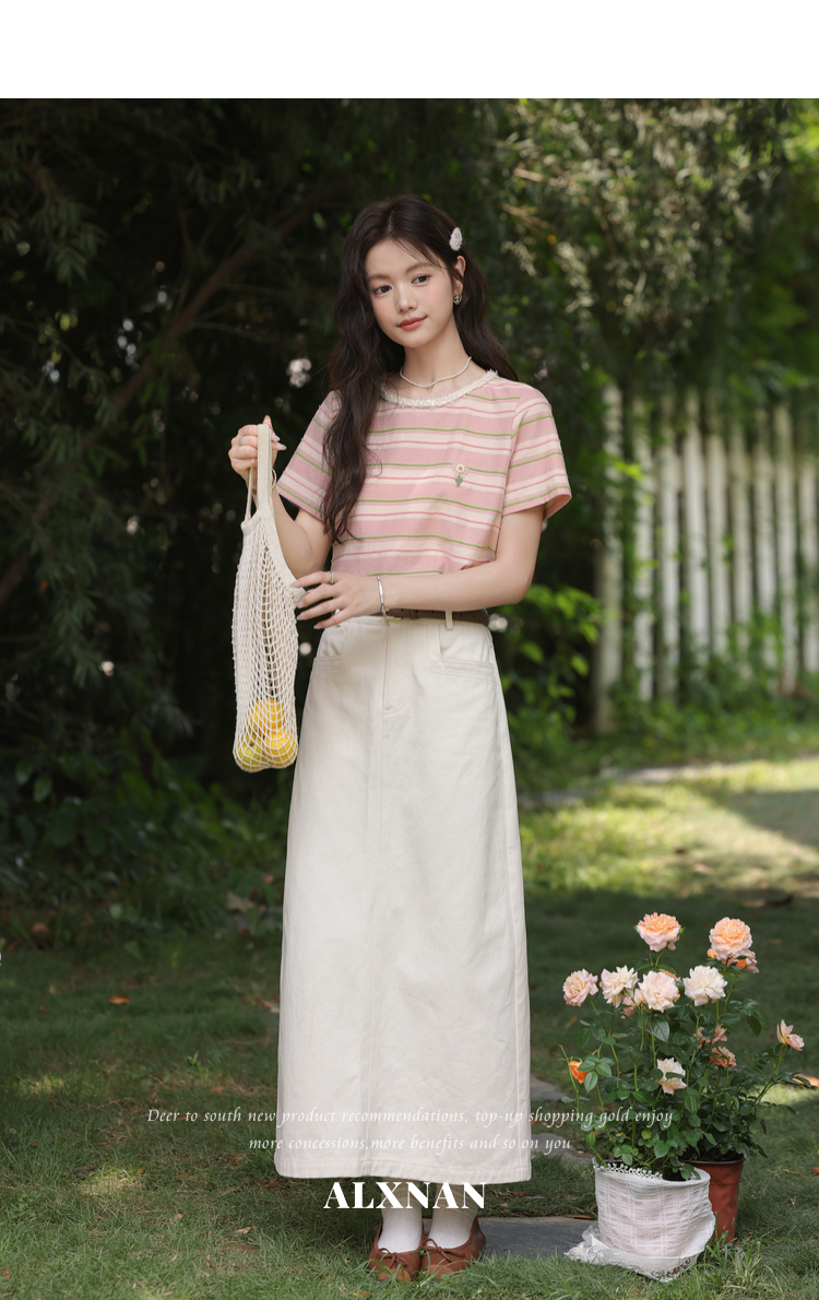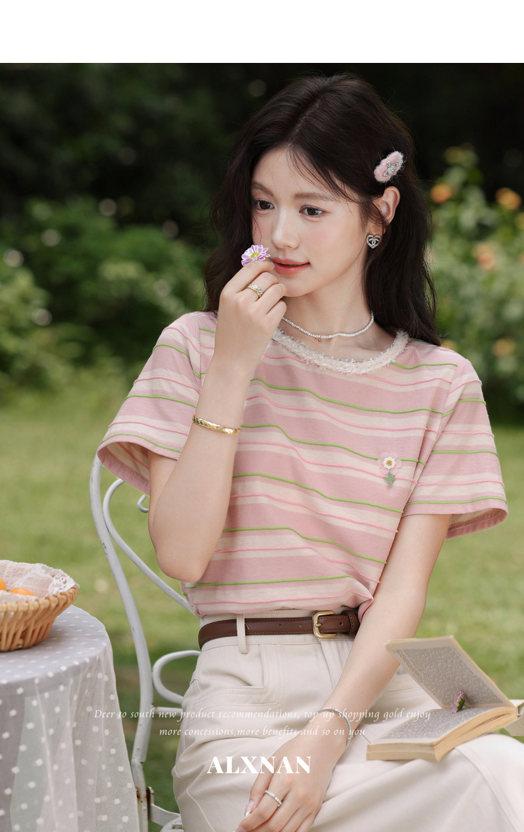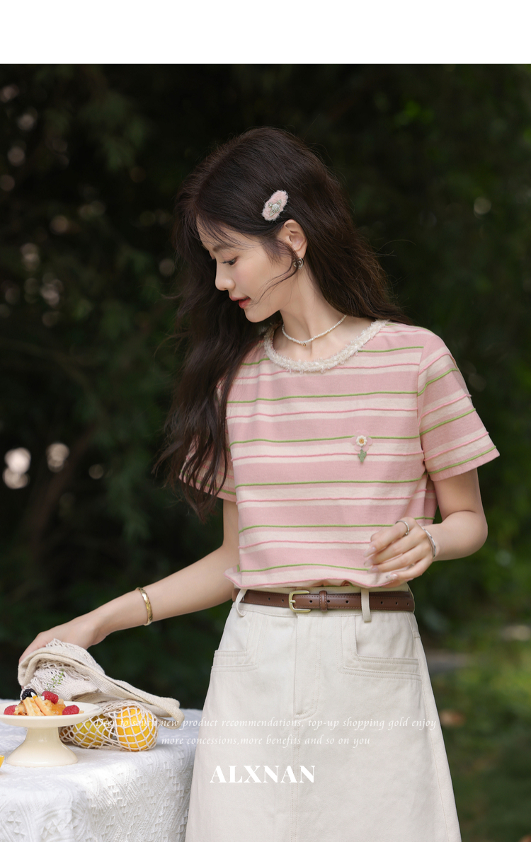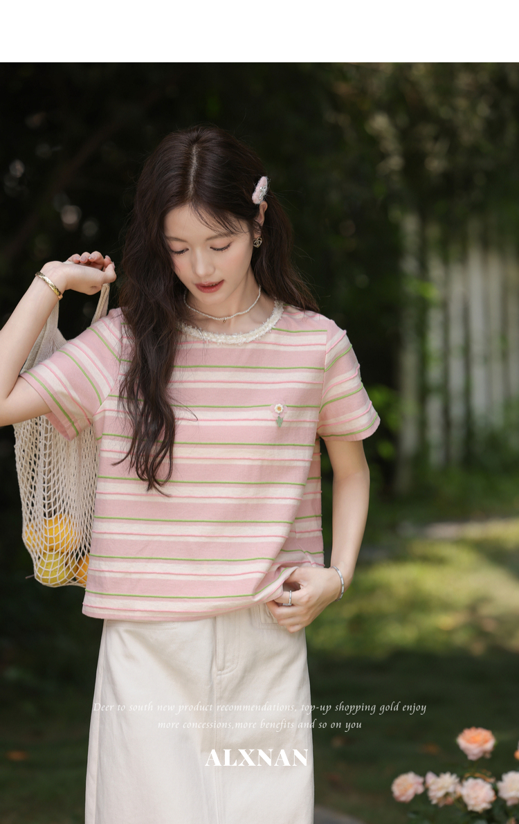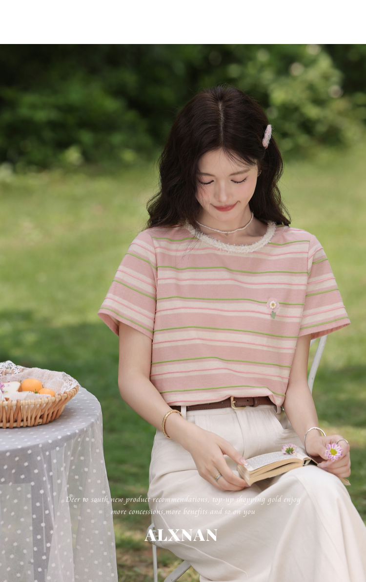 鹿向南「蓝沁冰茶」气质蓝色条纹T恤女夏季新款法式洋气短袖上衣