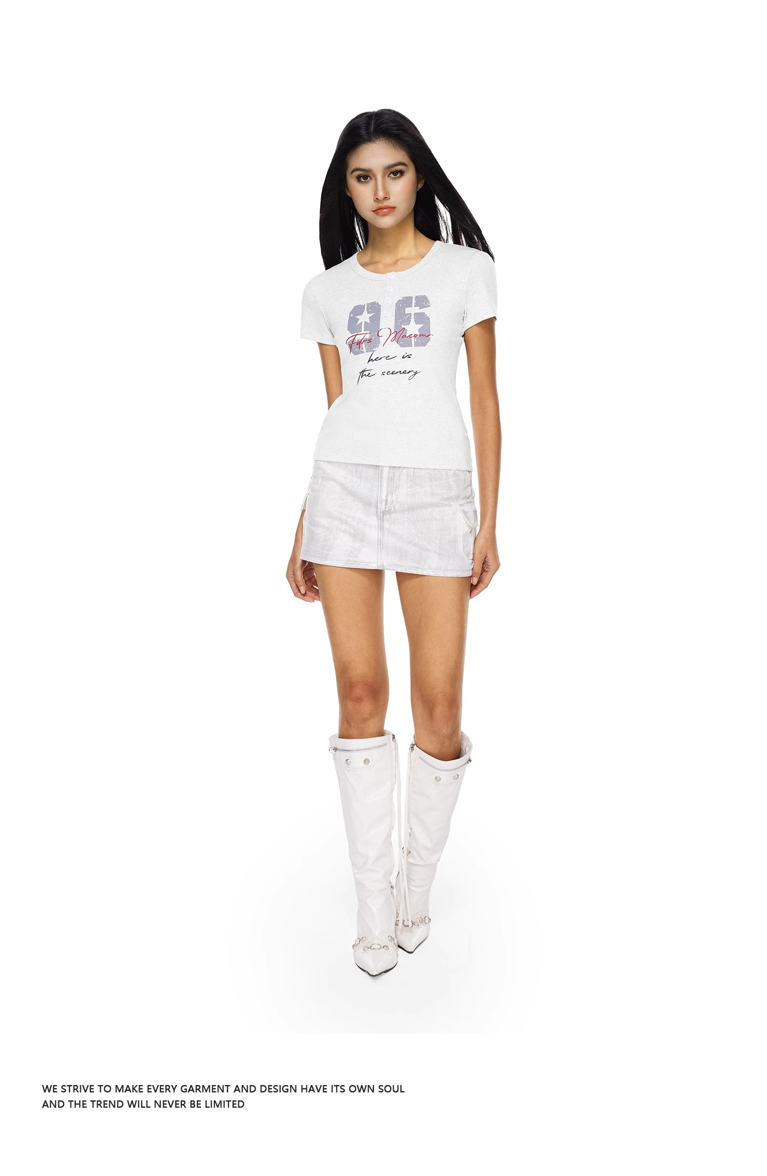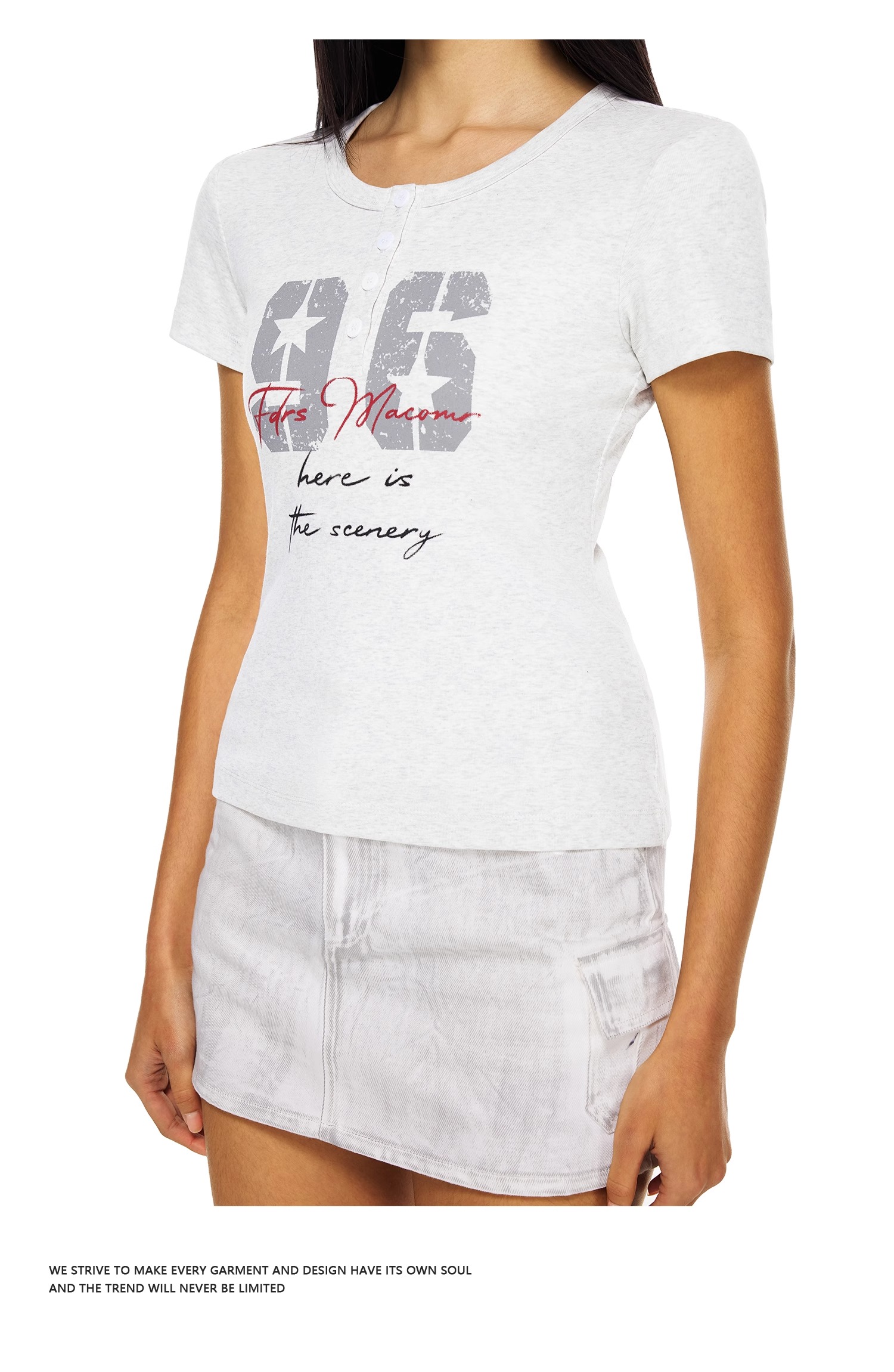 FDR官方店 V领纽扣手写字母短袖t恤女夏季辣妹修身显瘦体恤上衣