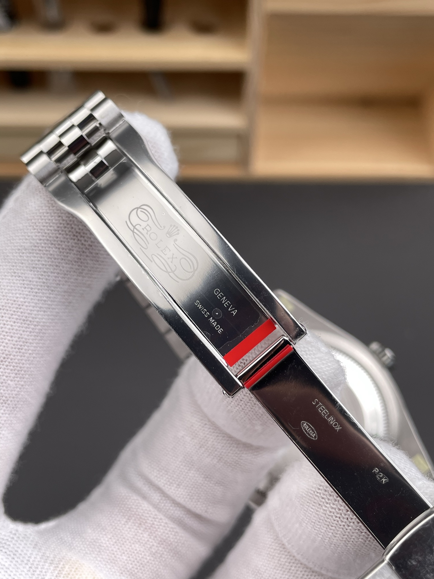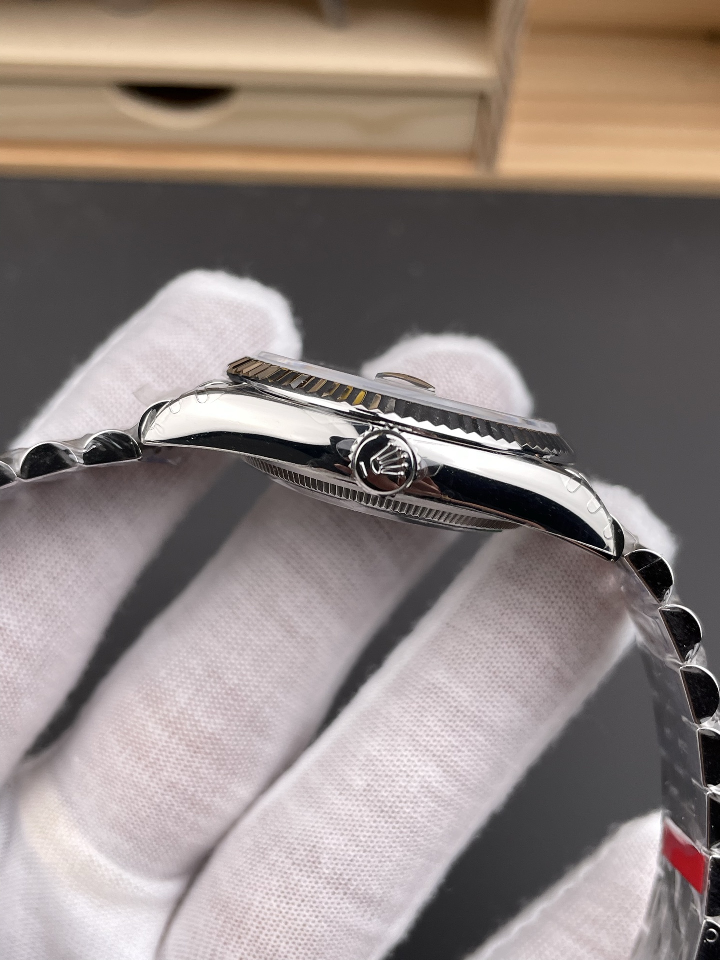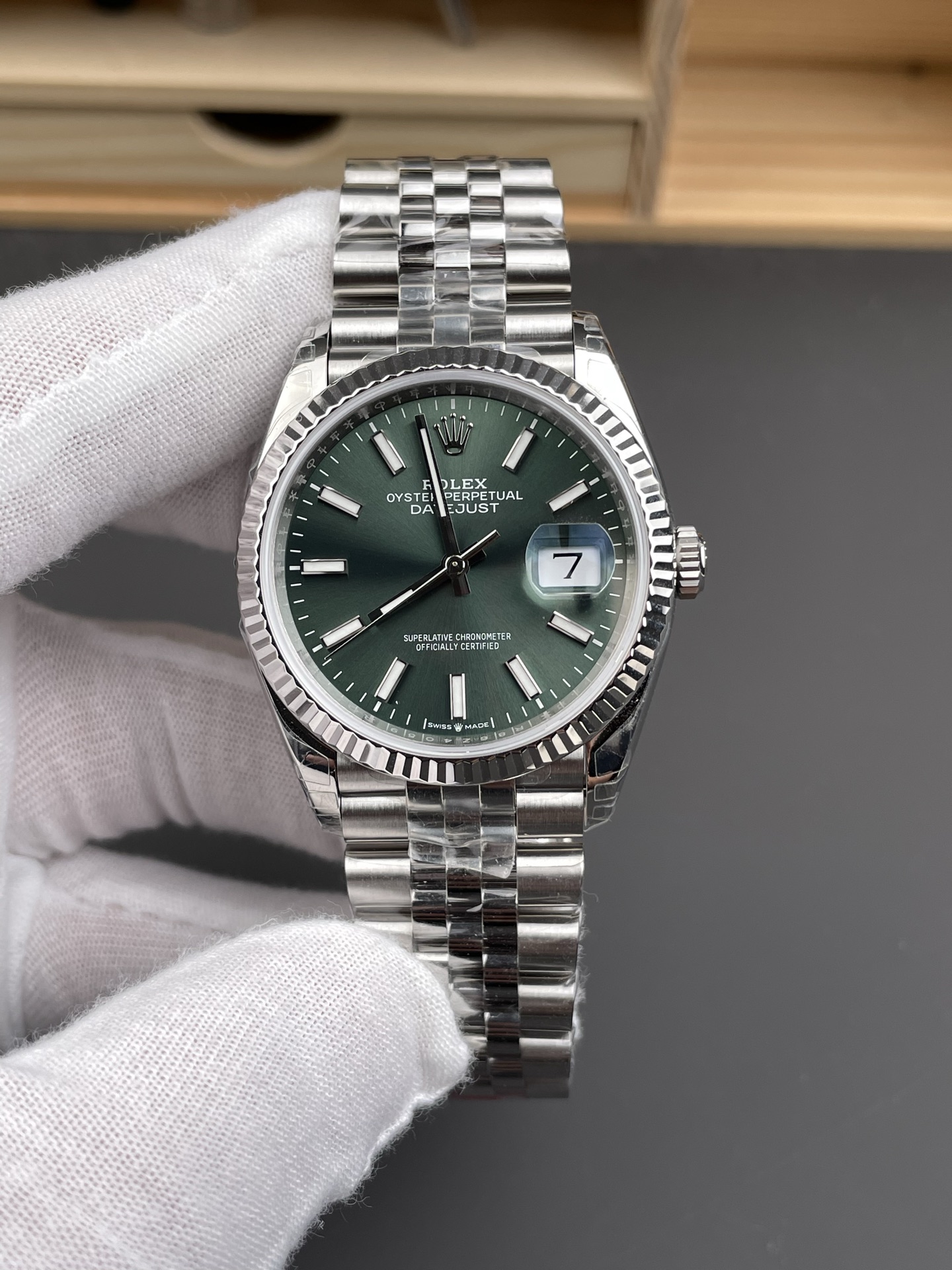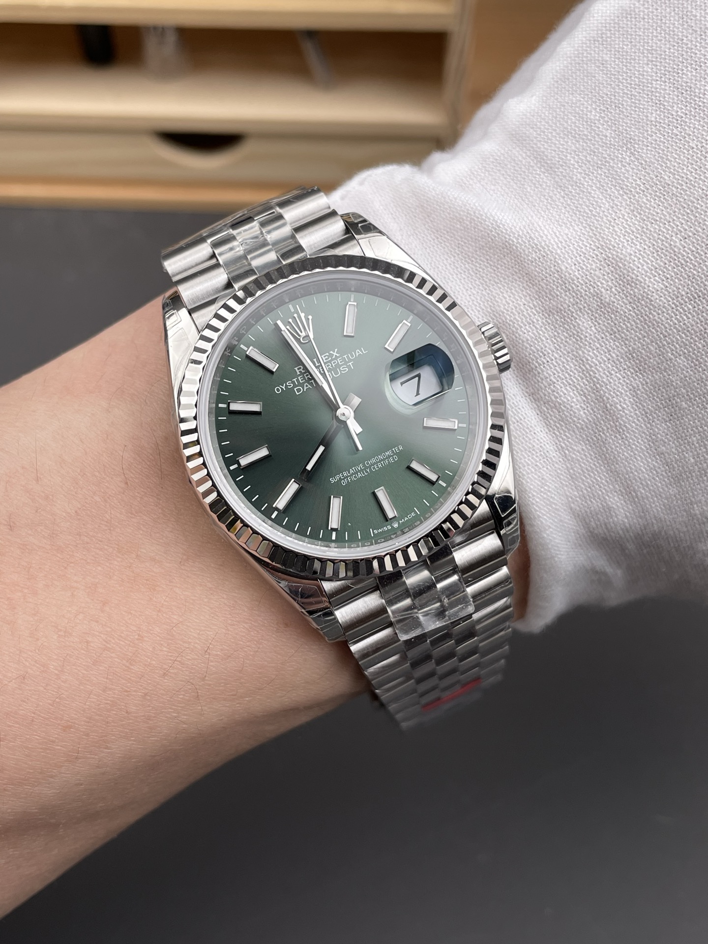 表盘颜色为薄荷绿色,清新独特,在光线照射下质感细腻。表圈采用18K白色黄金制成的三角坑纹外圈,是劳力士的经典元素,闪耀且辨识度高。表带为蚝式钢材质的纪念型五格链节表带,搭配摺叠蚝式带扣并配有5毫米易调链节延展系统,坚固耐用且佩戴舒适