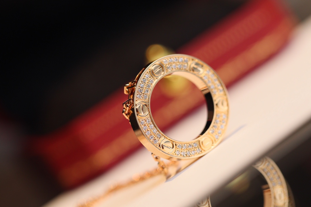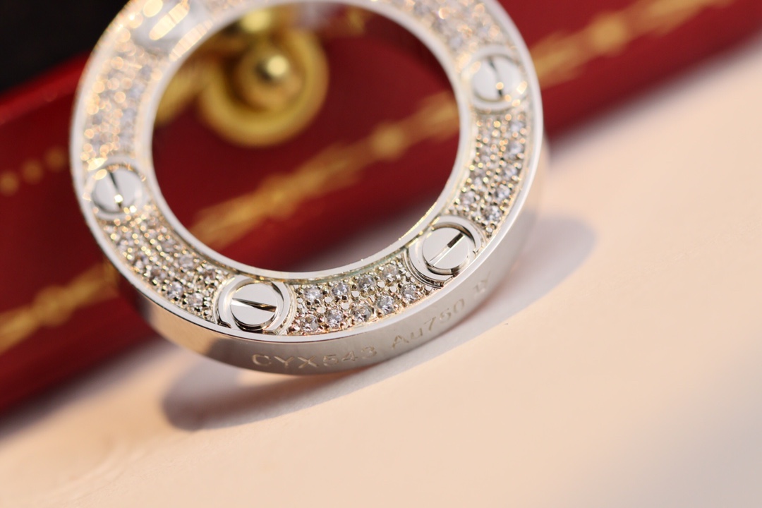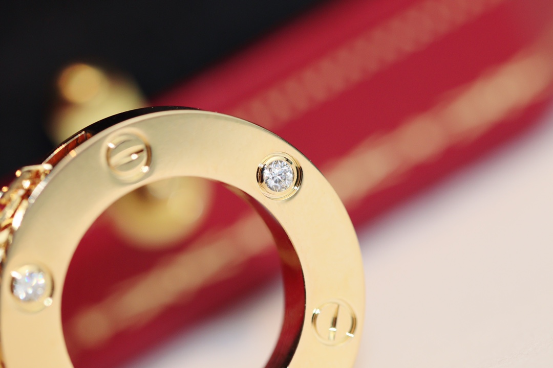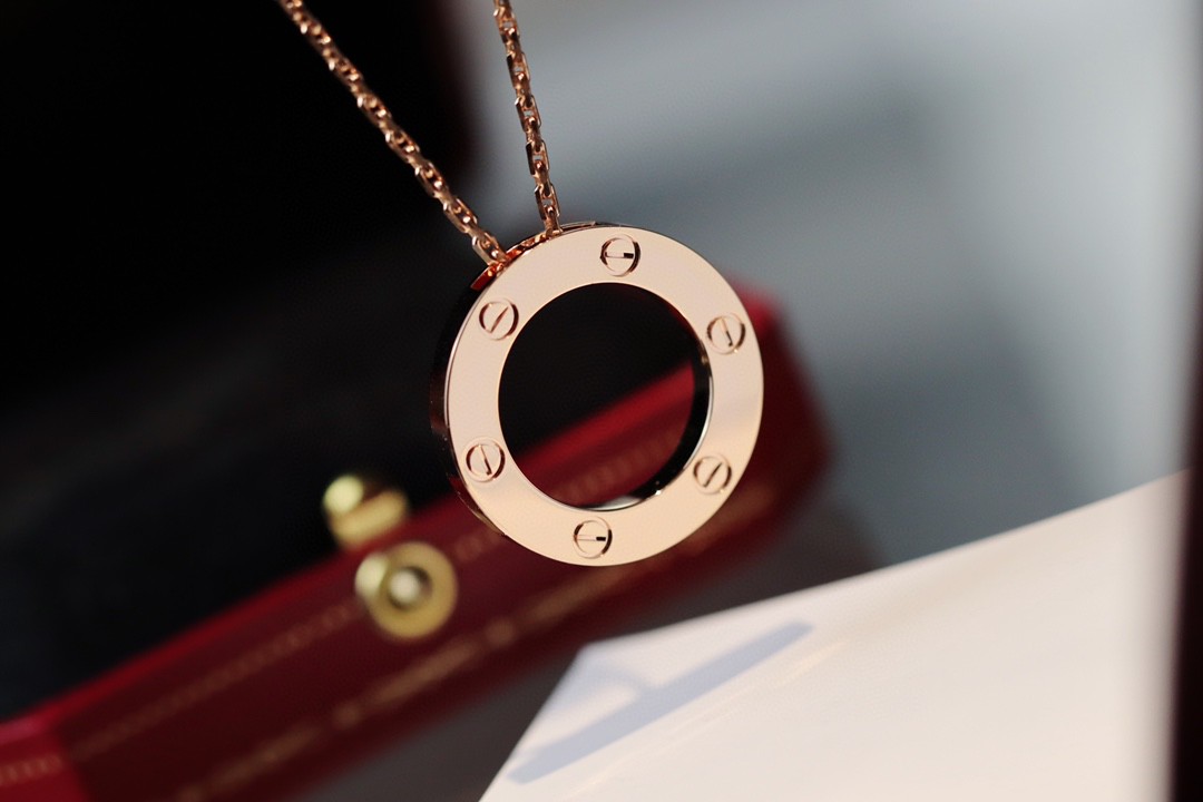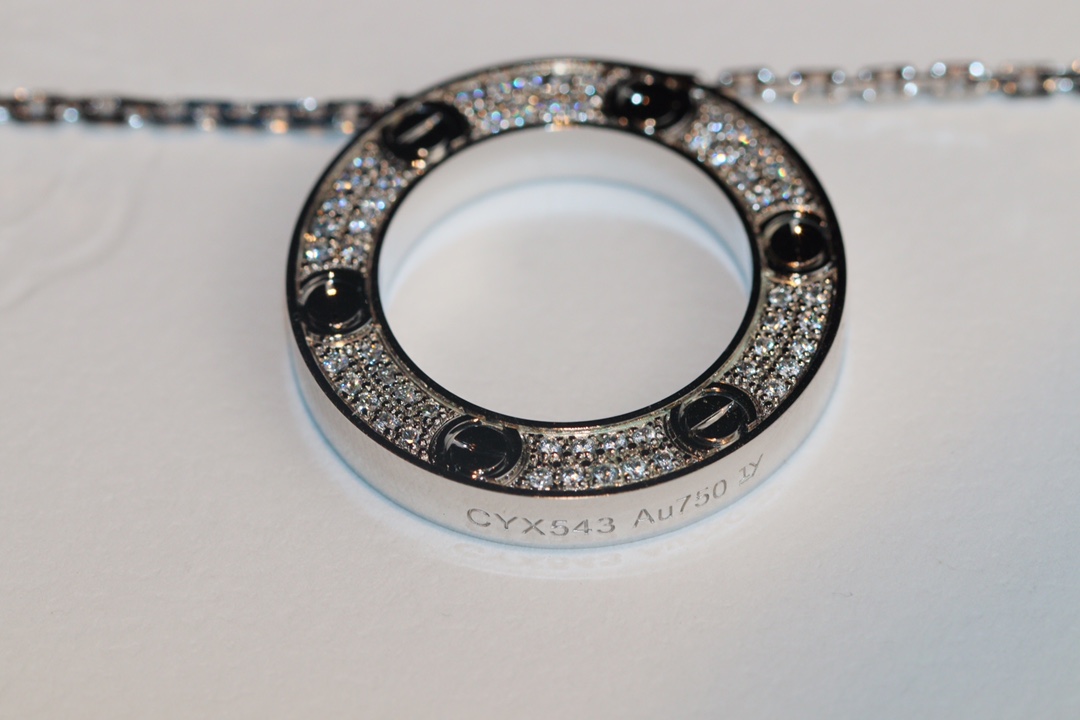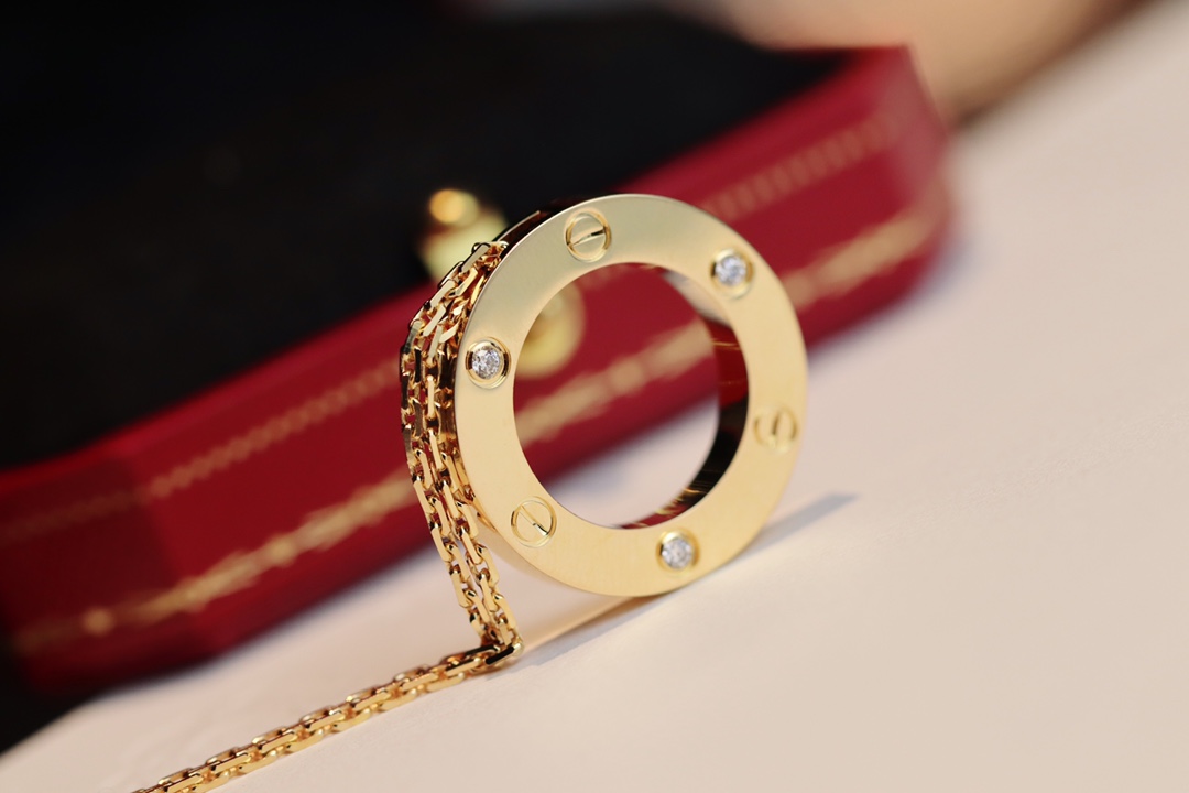 卡家LOVE大圆饼项链重磅出炉!独家定制!zp开发!3钻项链,经典的螺丝设计意味着爱情的永恒,专柜4W+,非常奢华大牌!一面镶钻,一面刻有LOVE字母,有厚度有分量!我们采用V金2代材质 ,厚金1咪,love系列不管是手镯戒指还是项链,边缘的棱角一定是分明的不得了,甚至用手去摩擦会有一丢丢锋利感!项链的螺丝面刻痕非常多而且深邃,很难拿捏,只有采用CNC精雕出来的效果才是最对版的