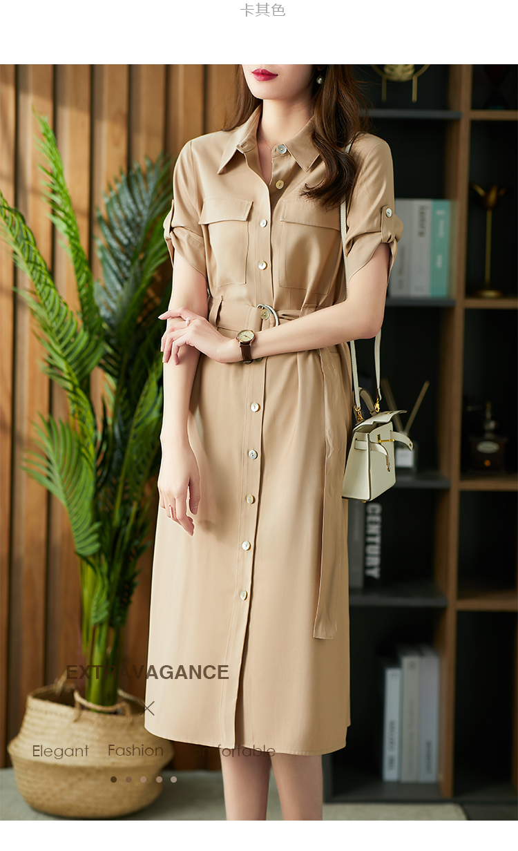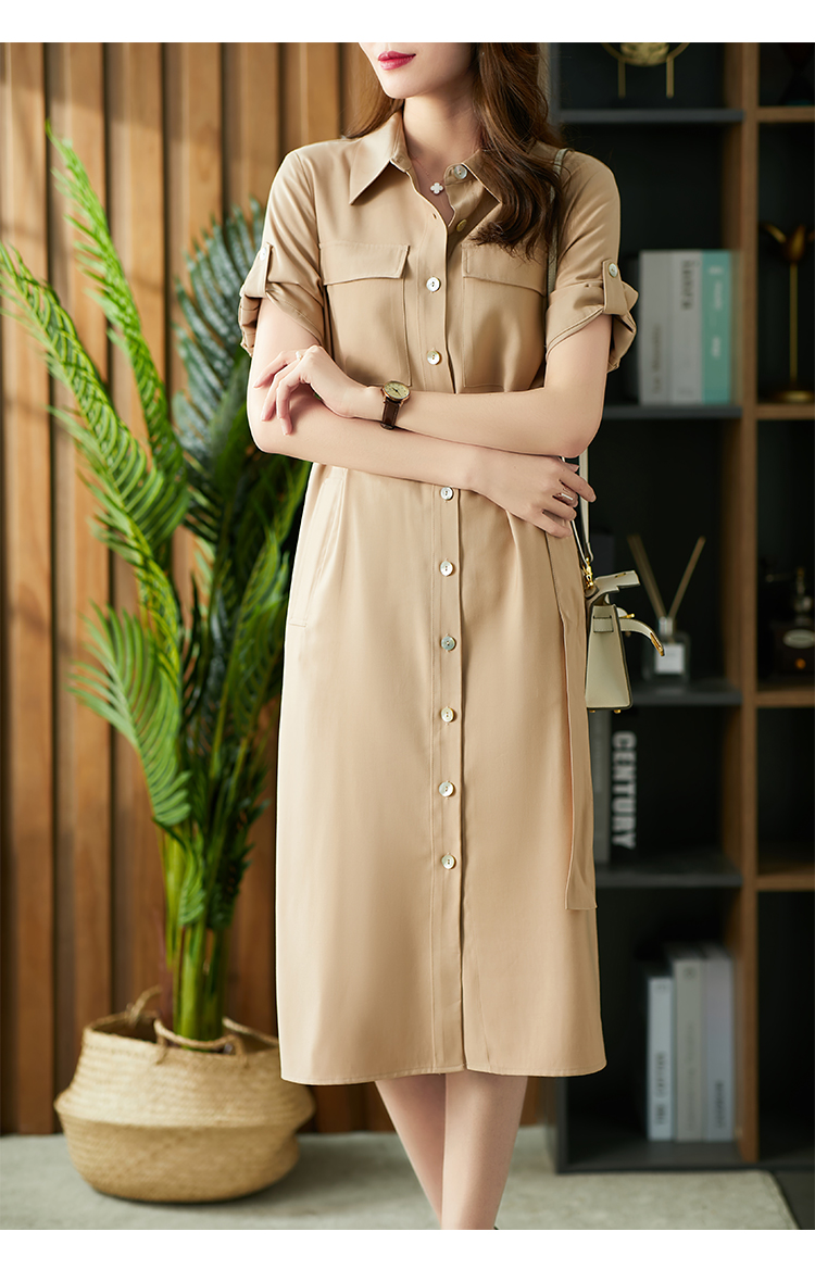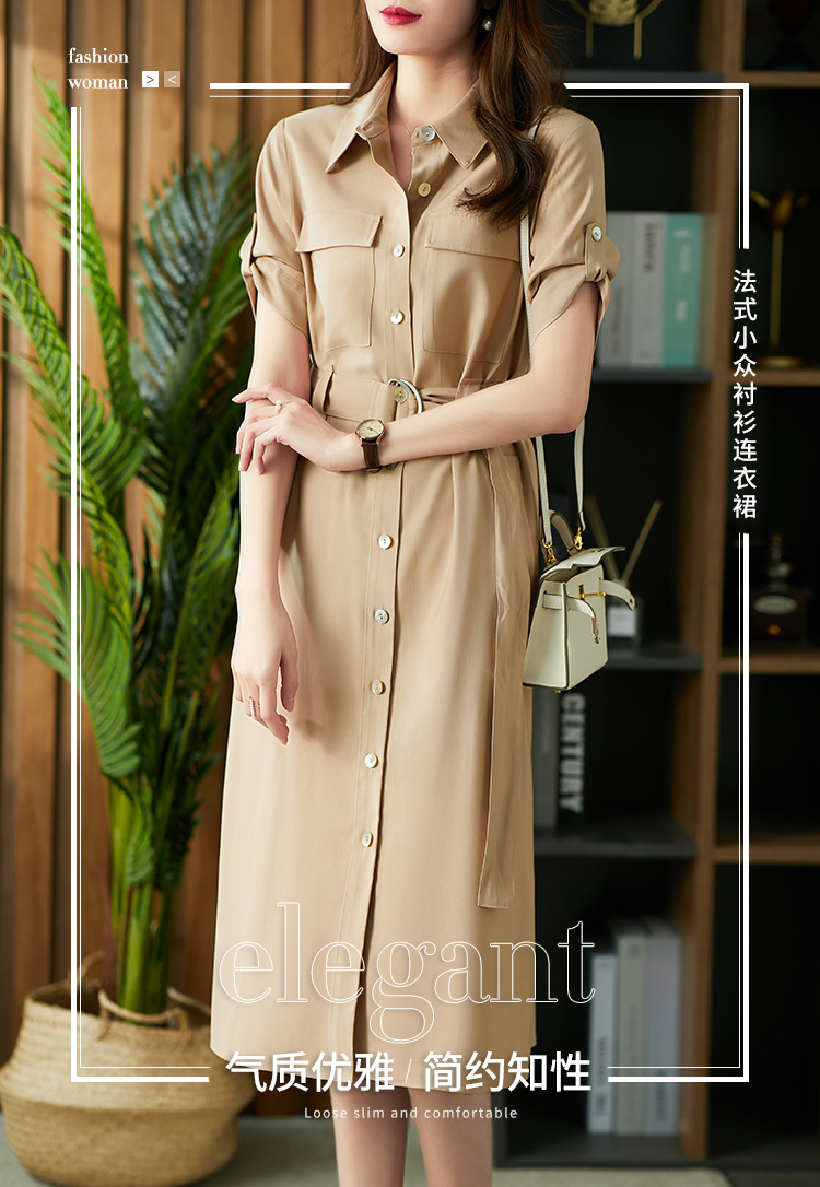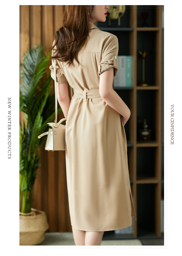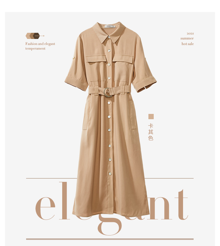 70169原形气质卡其色连衣裙女2024春夏季新款收腰中长款显瘦过膝裙子