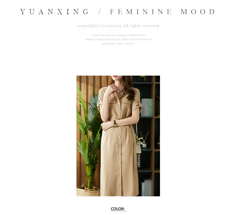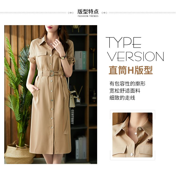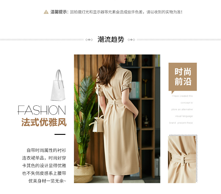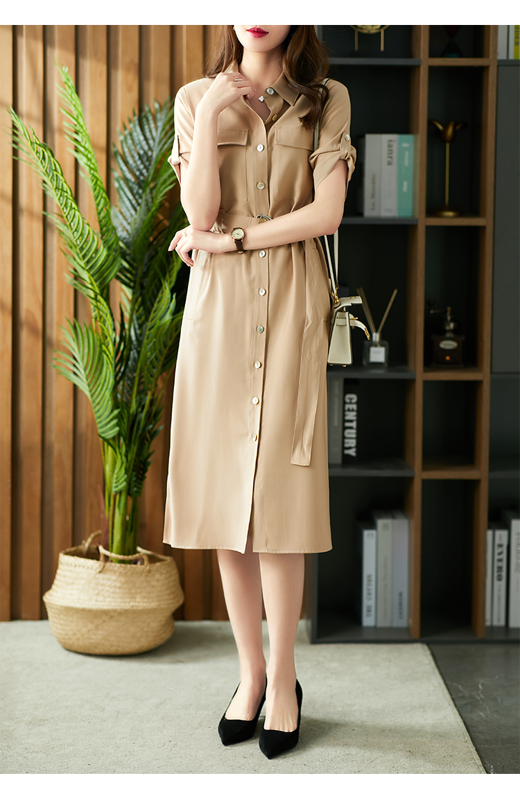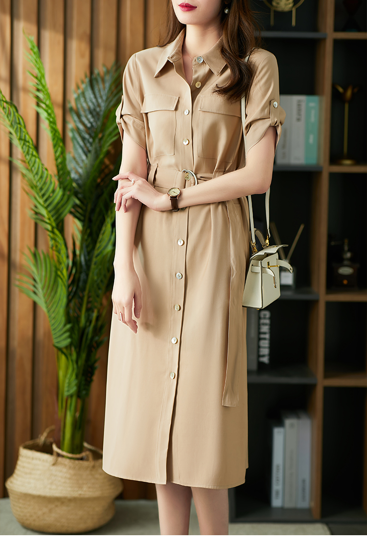 70169原形气质卡其色连衣裙女2024春夏季新款收腰中长款显瘦过膝裙子