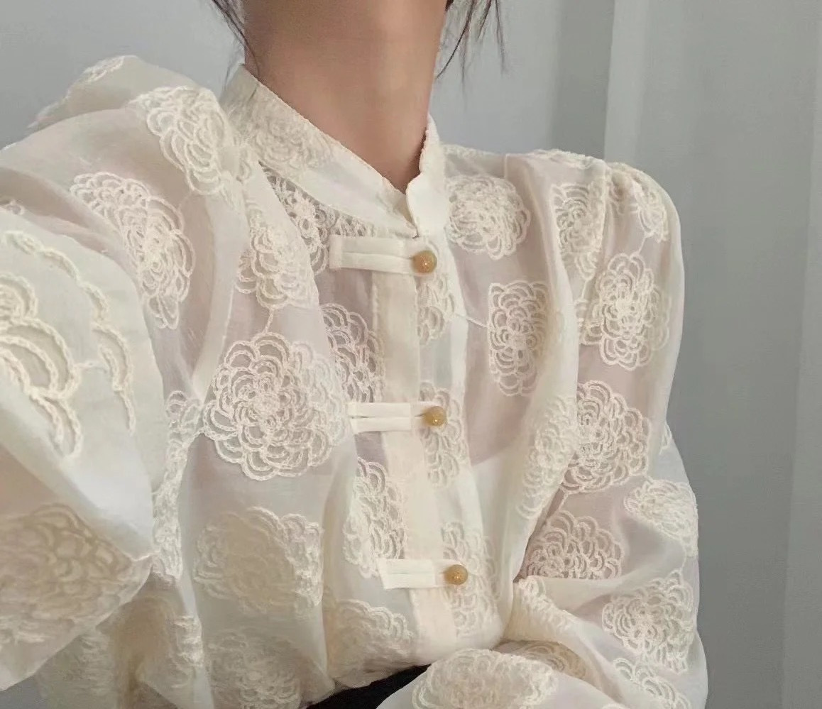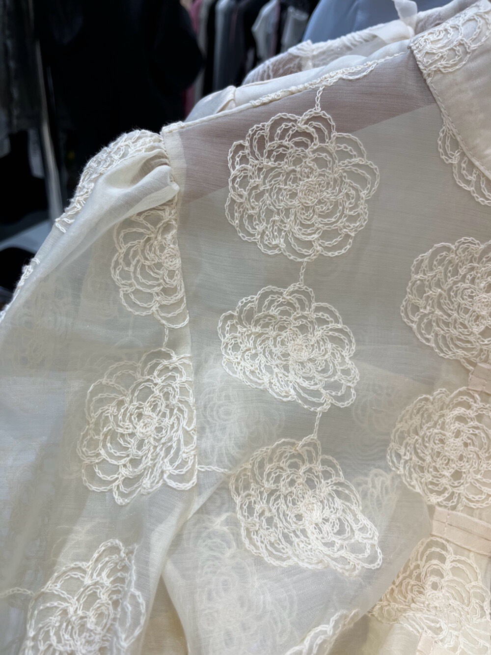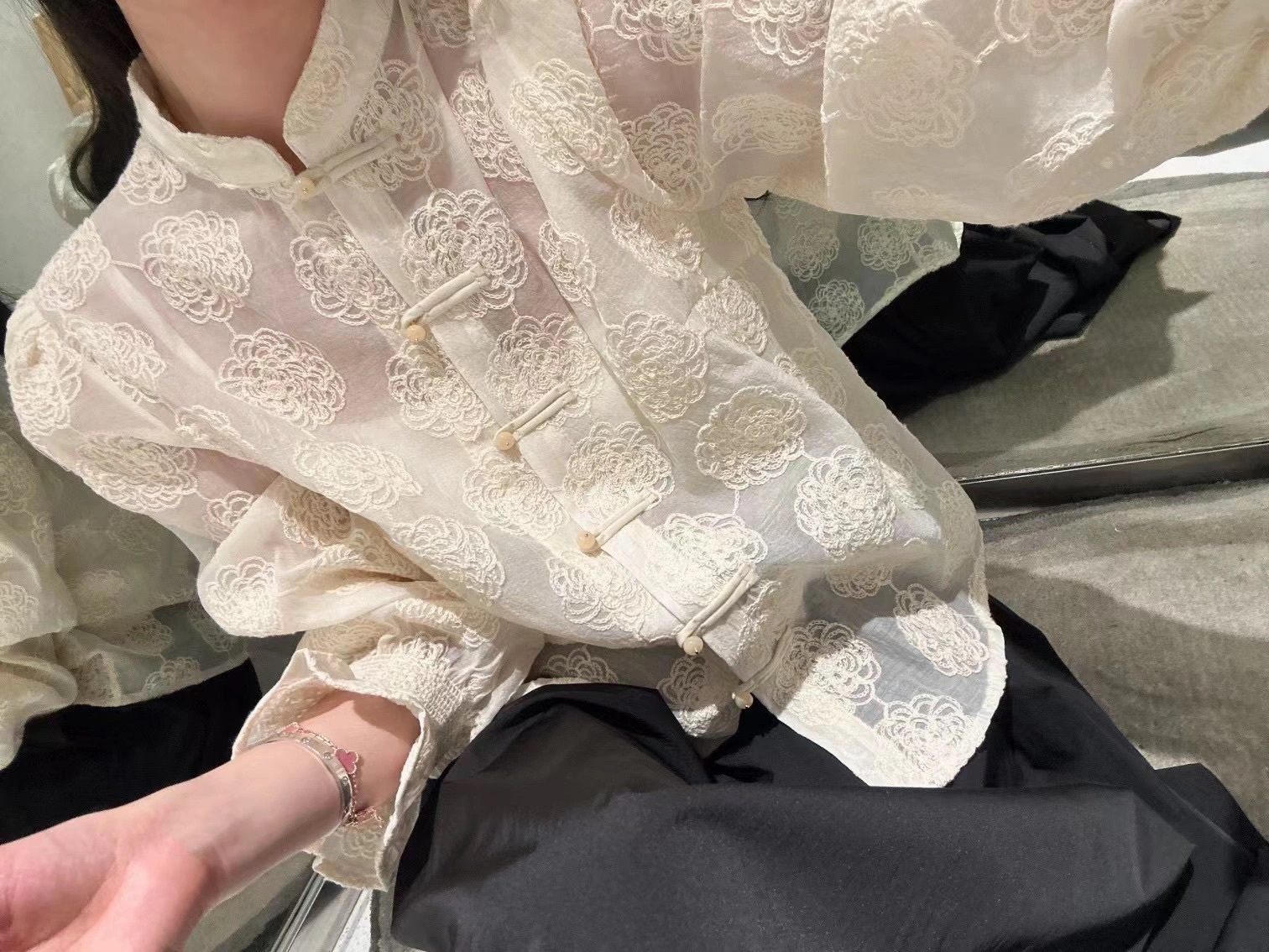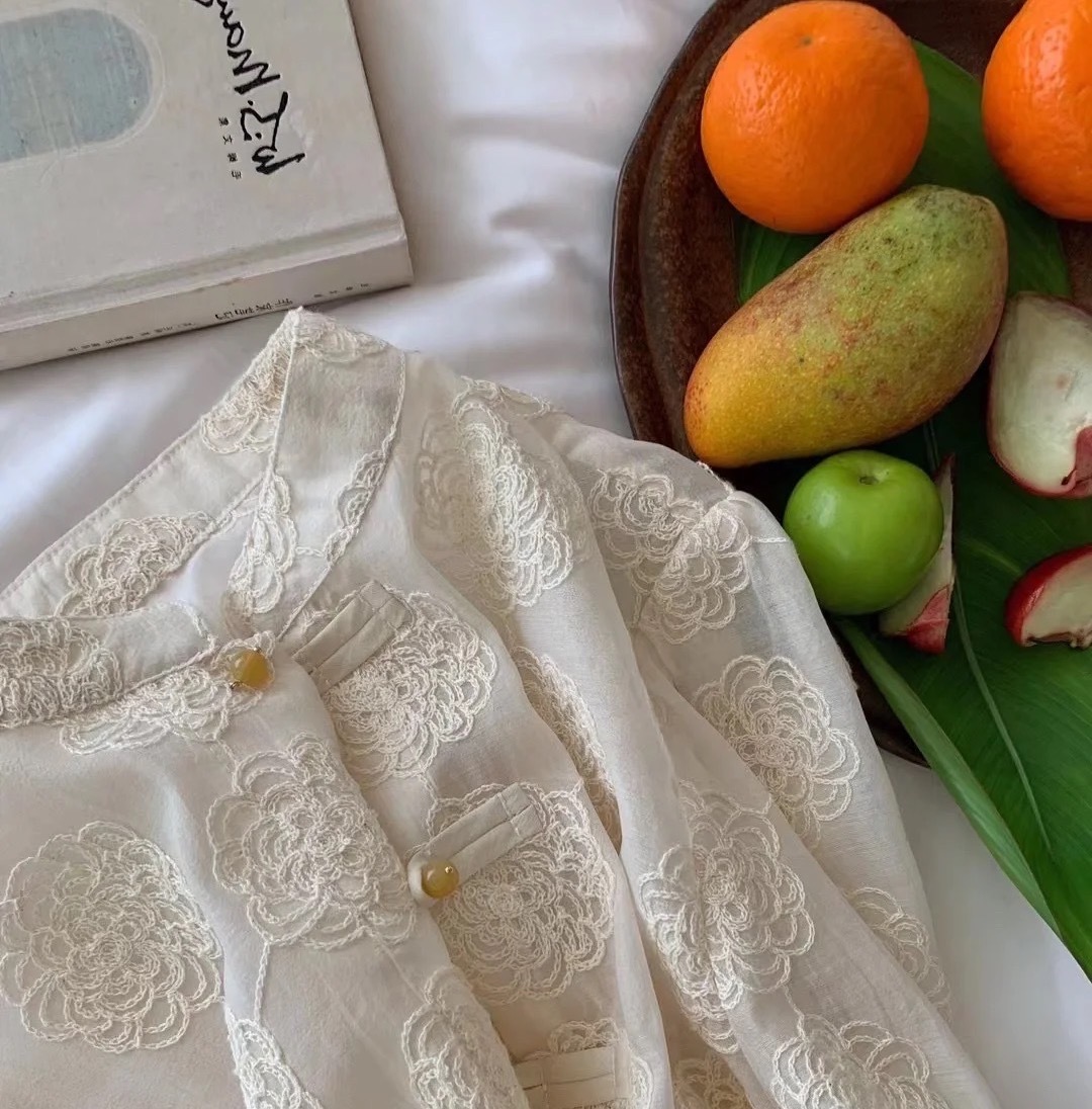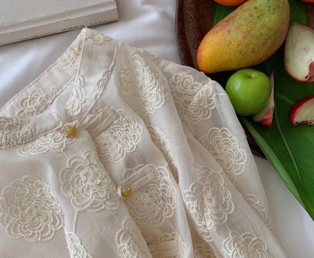 【产品名称】AR山茶花刺绣花朵镂空琥珀扣小衫