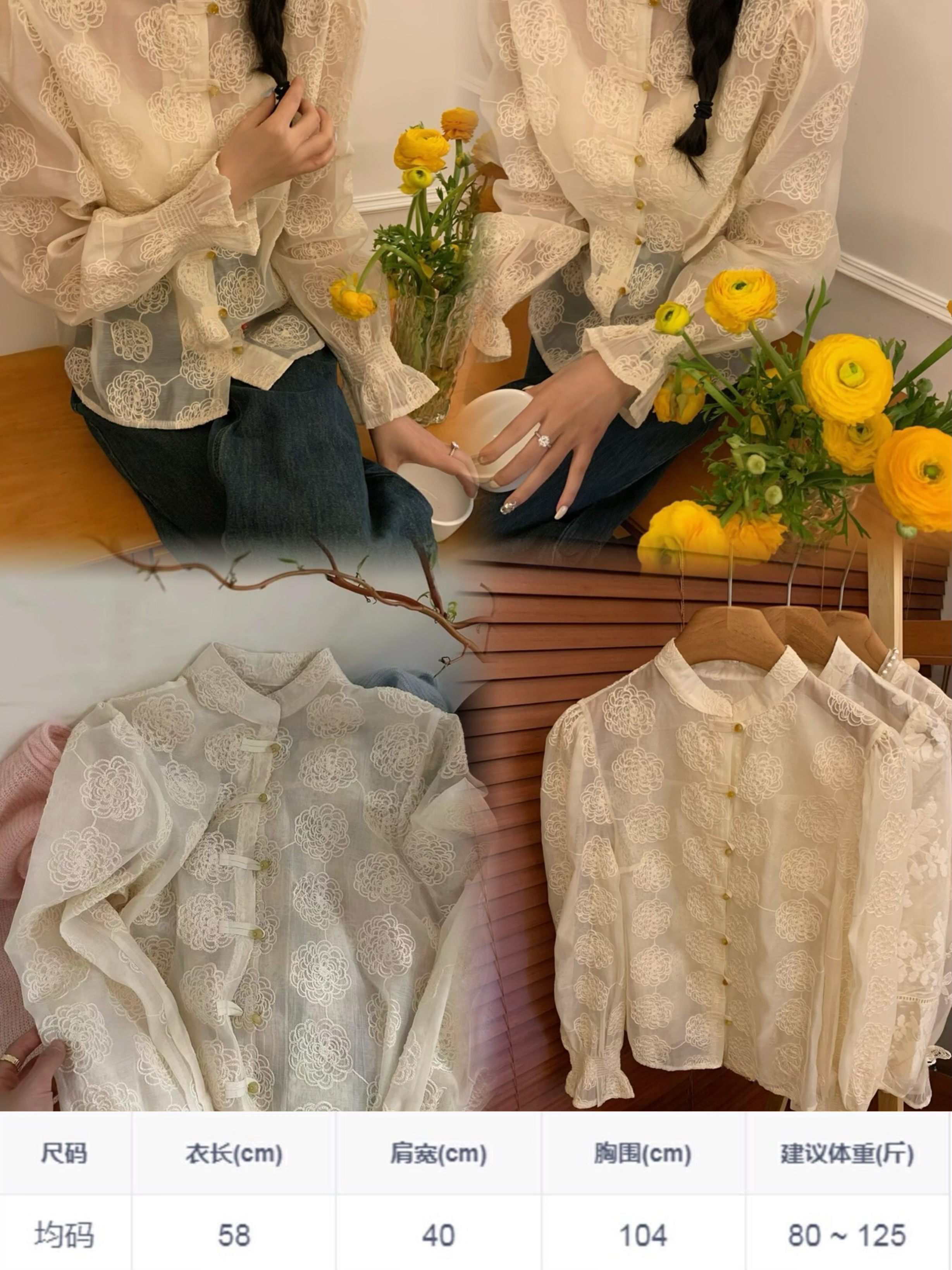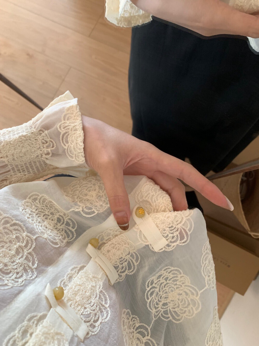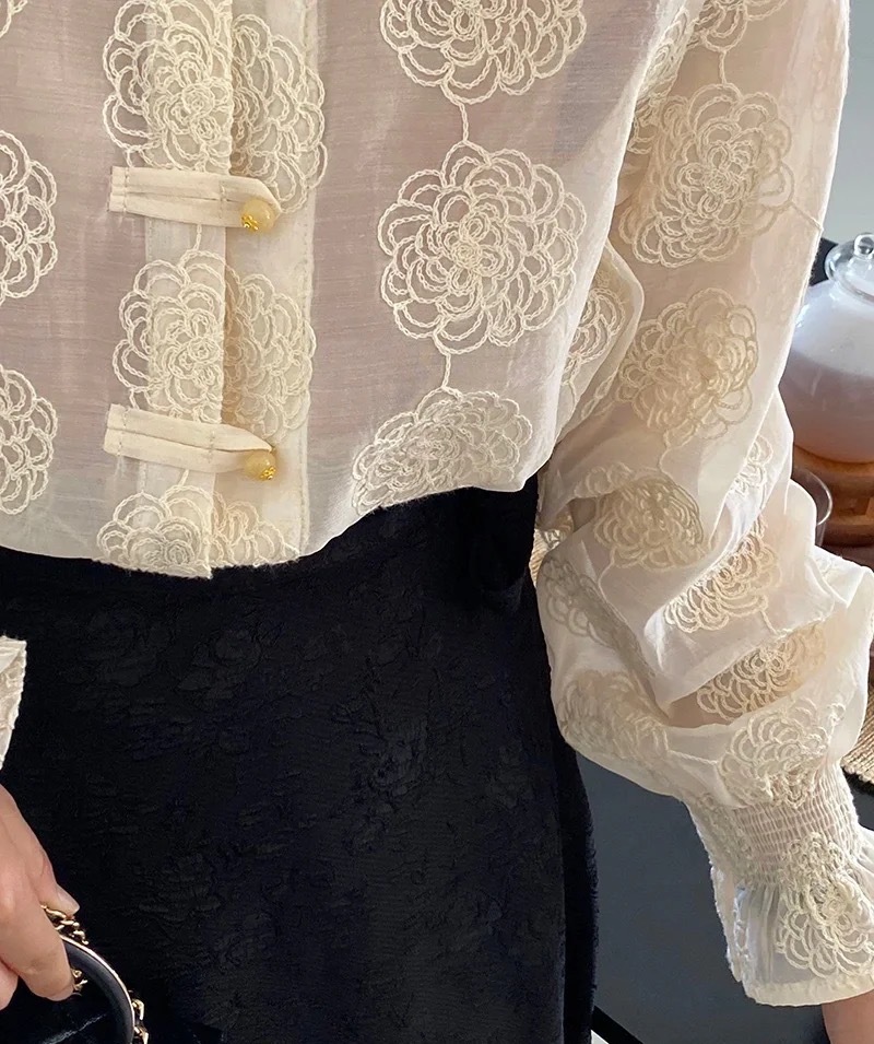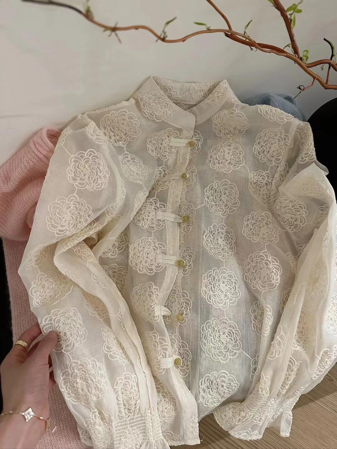 【产品名称】AR山茶花刺绣花朵镂空琥珀扣小衫