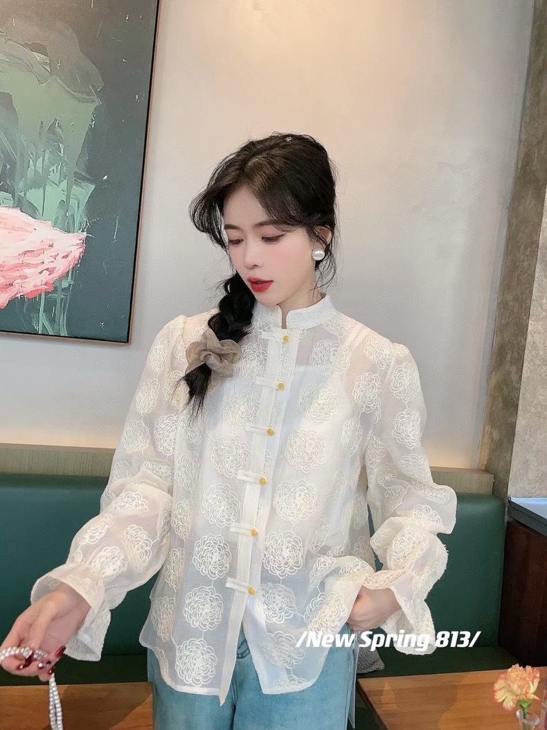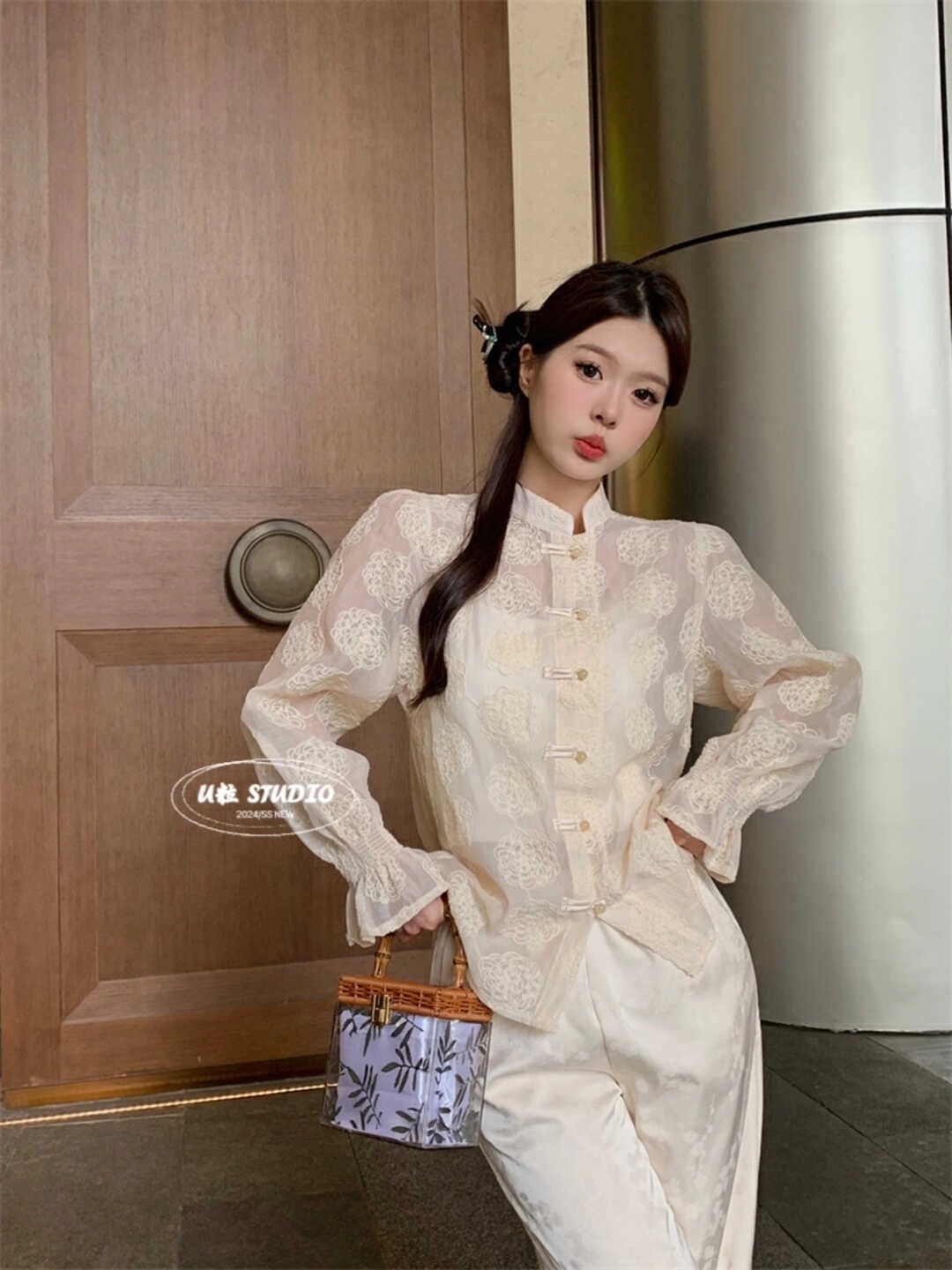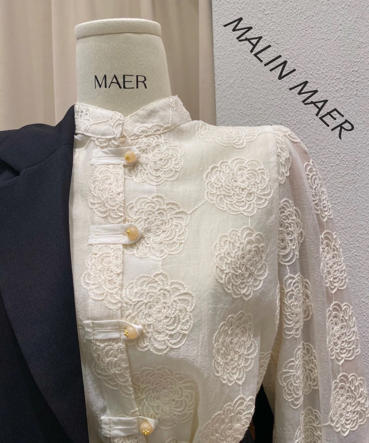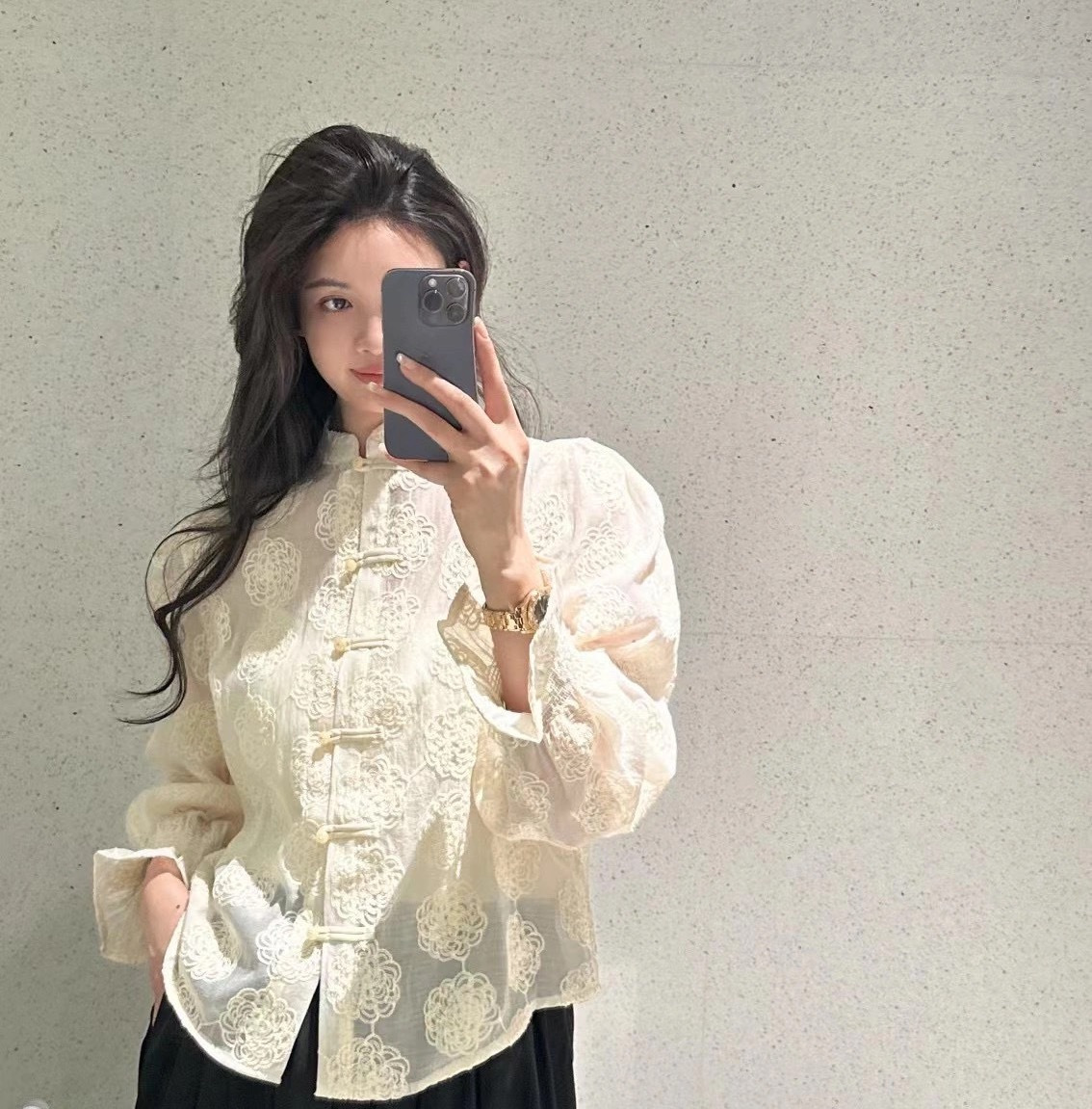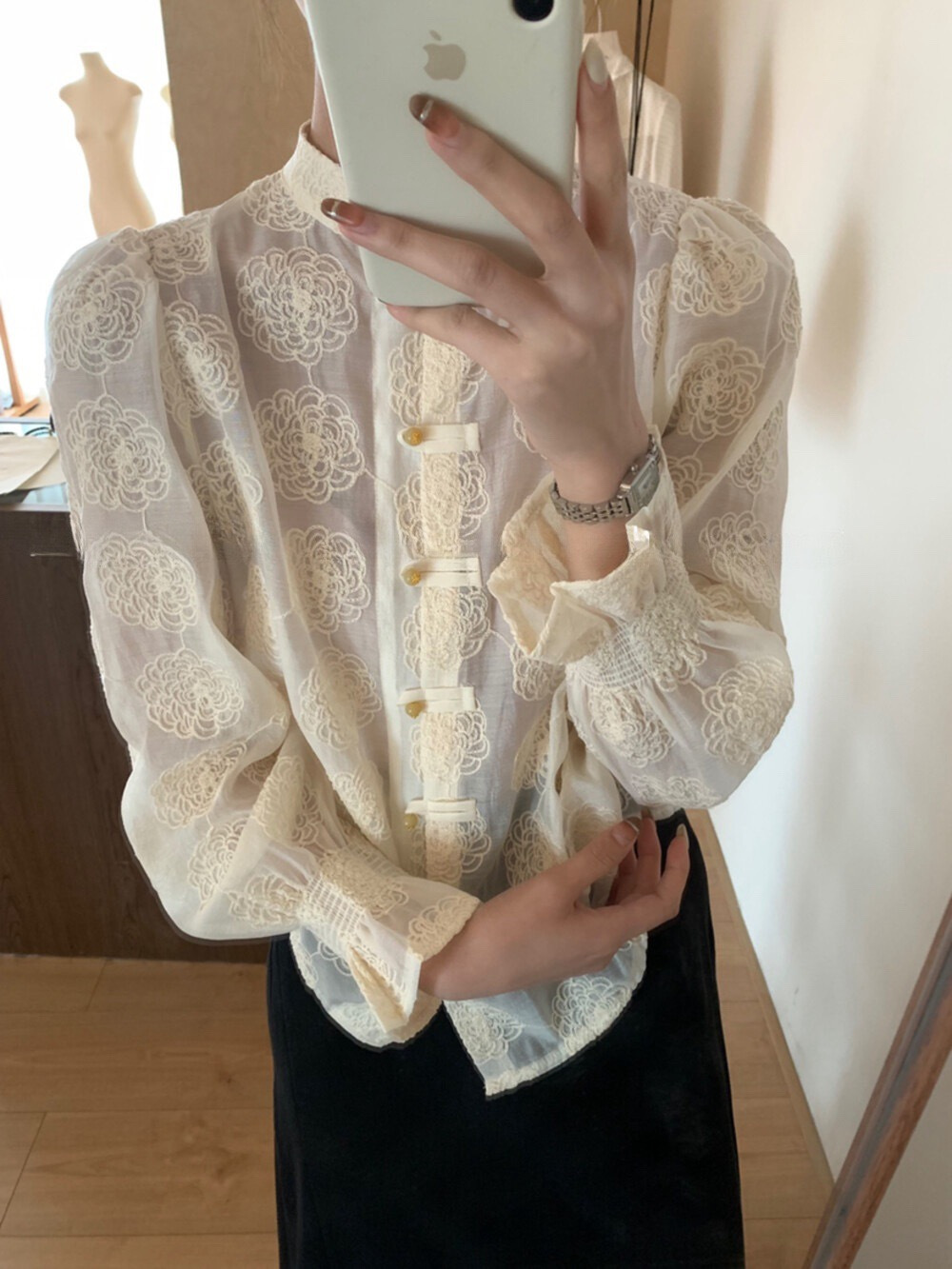 【产品名称】AR山茶花刺绣花朵镂空琥珀扣小衫