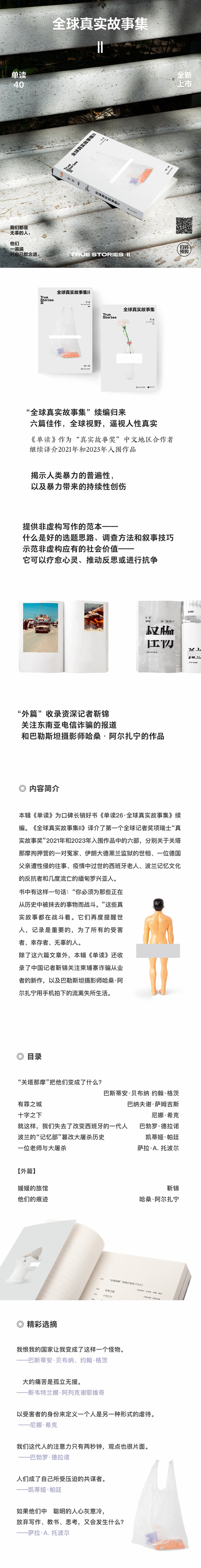 ★ 作为第一个全球记者奖项瑞士“真实故事奖”的中文地区合作者,《单读》持续关注全球传媒业的动向,继《单读26·全球真实故事集》之后,推出续编《单读40·全球真实故事集Ⅱ》,译介“真实故事奖”2021年和2023年入围作品中的六部。