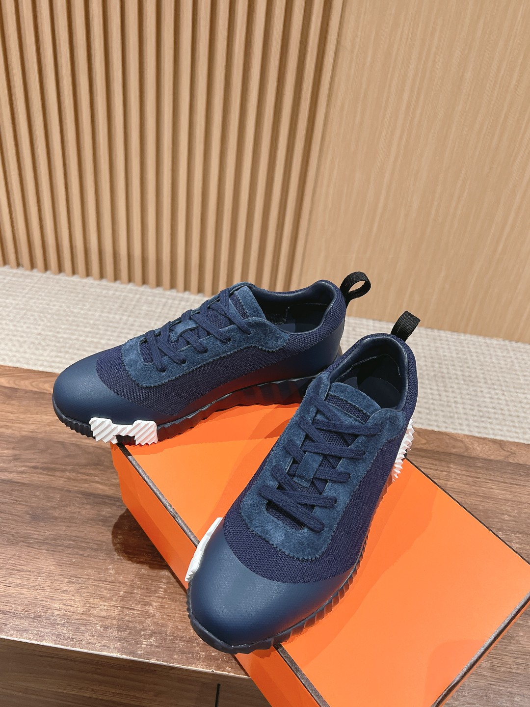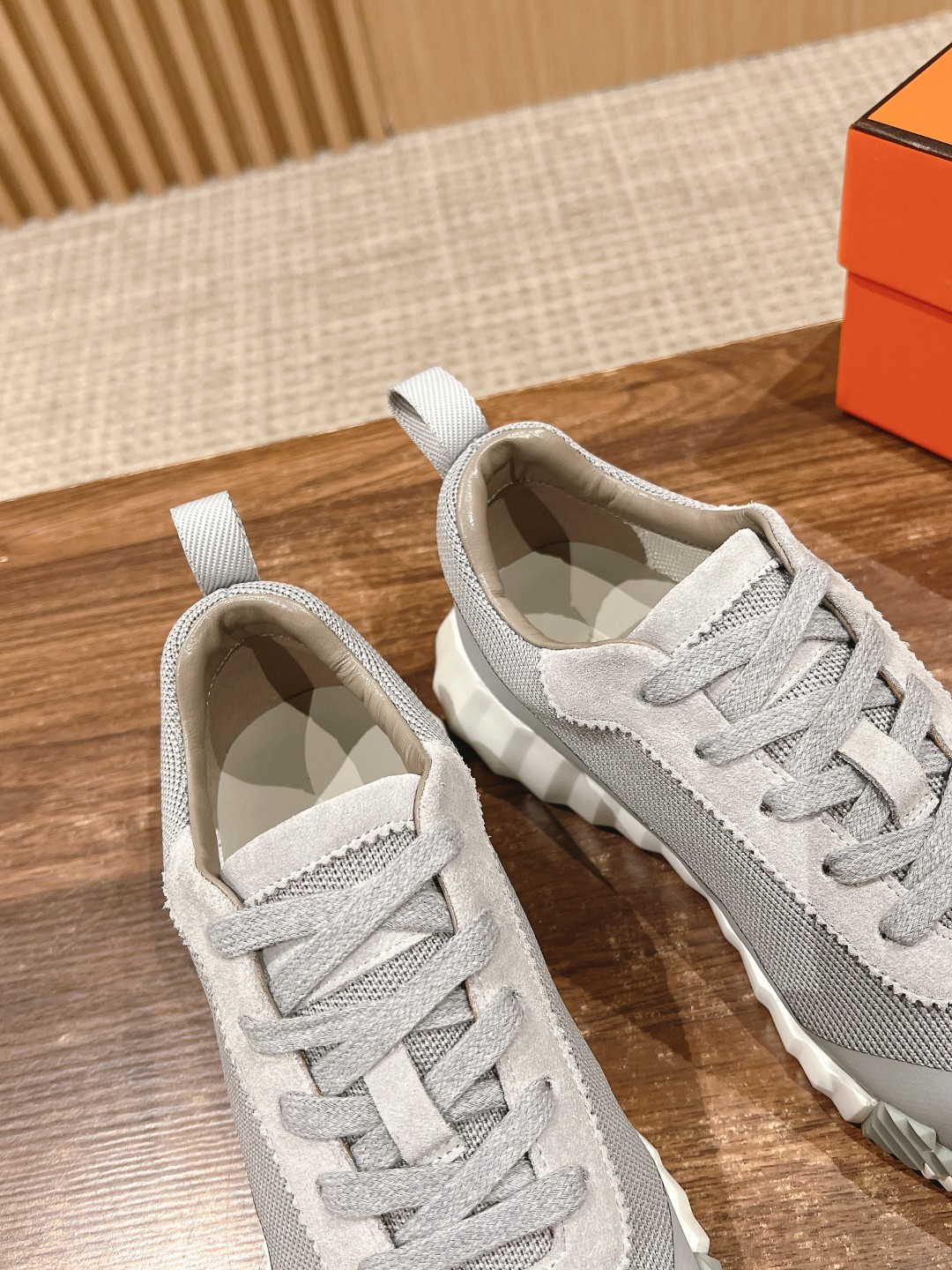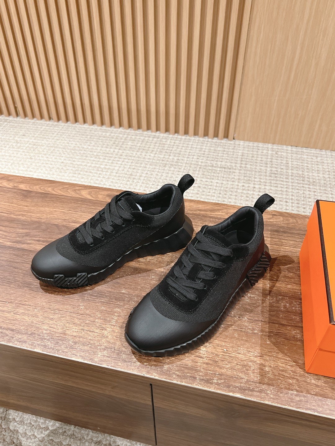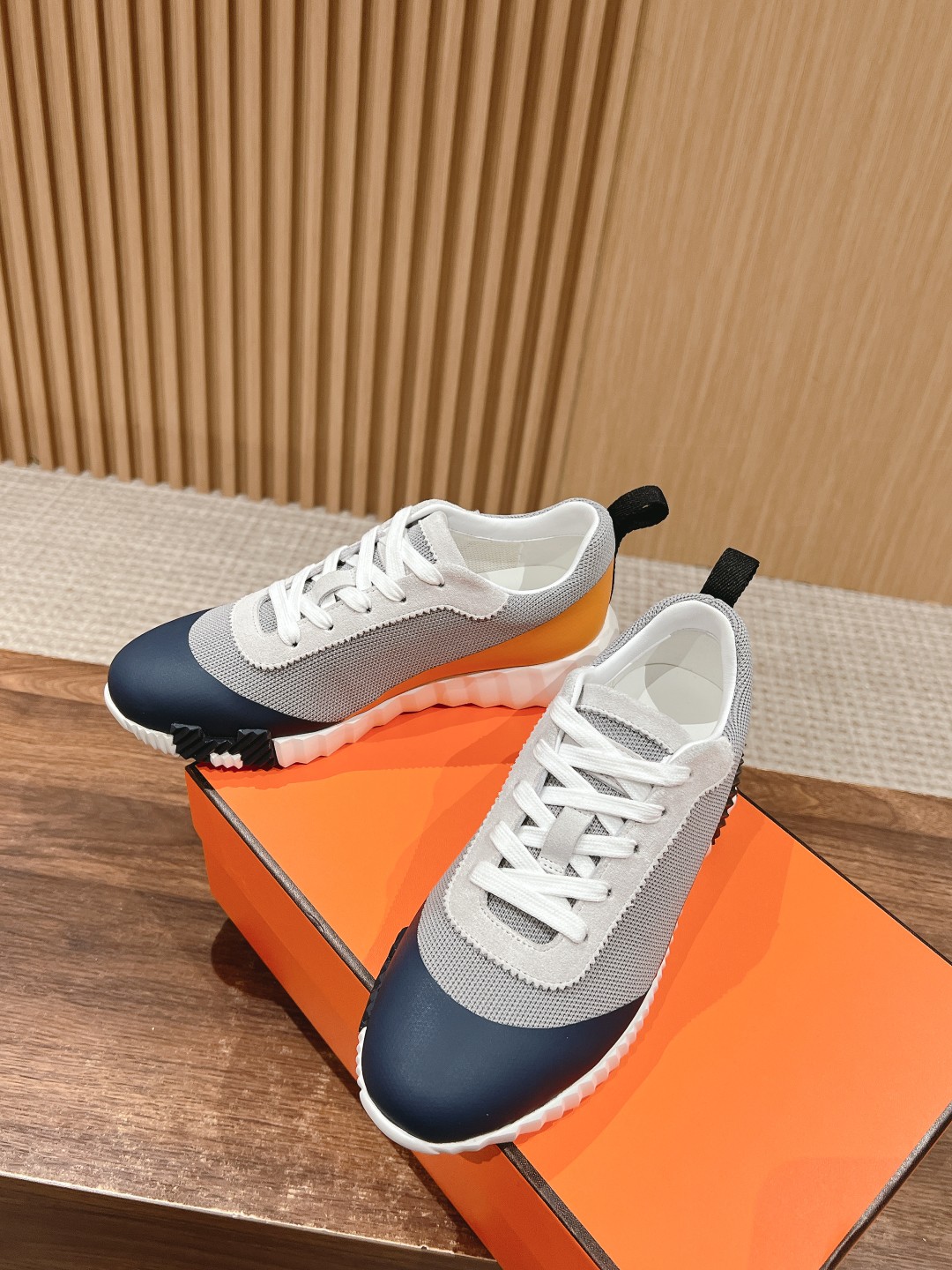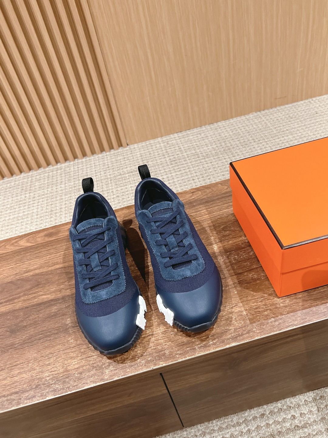 爱马*情侣款休闲鞋 麂皮搭拼接网布运动鞋。