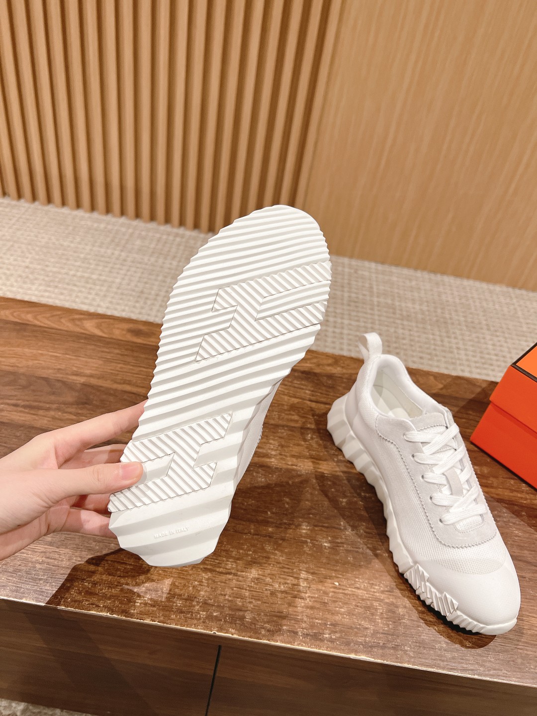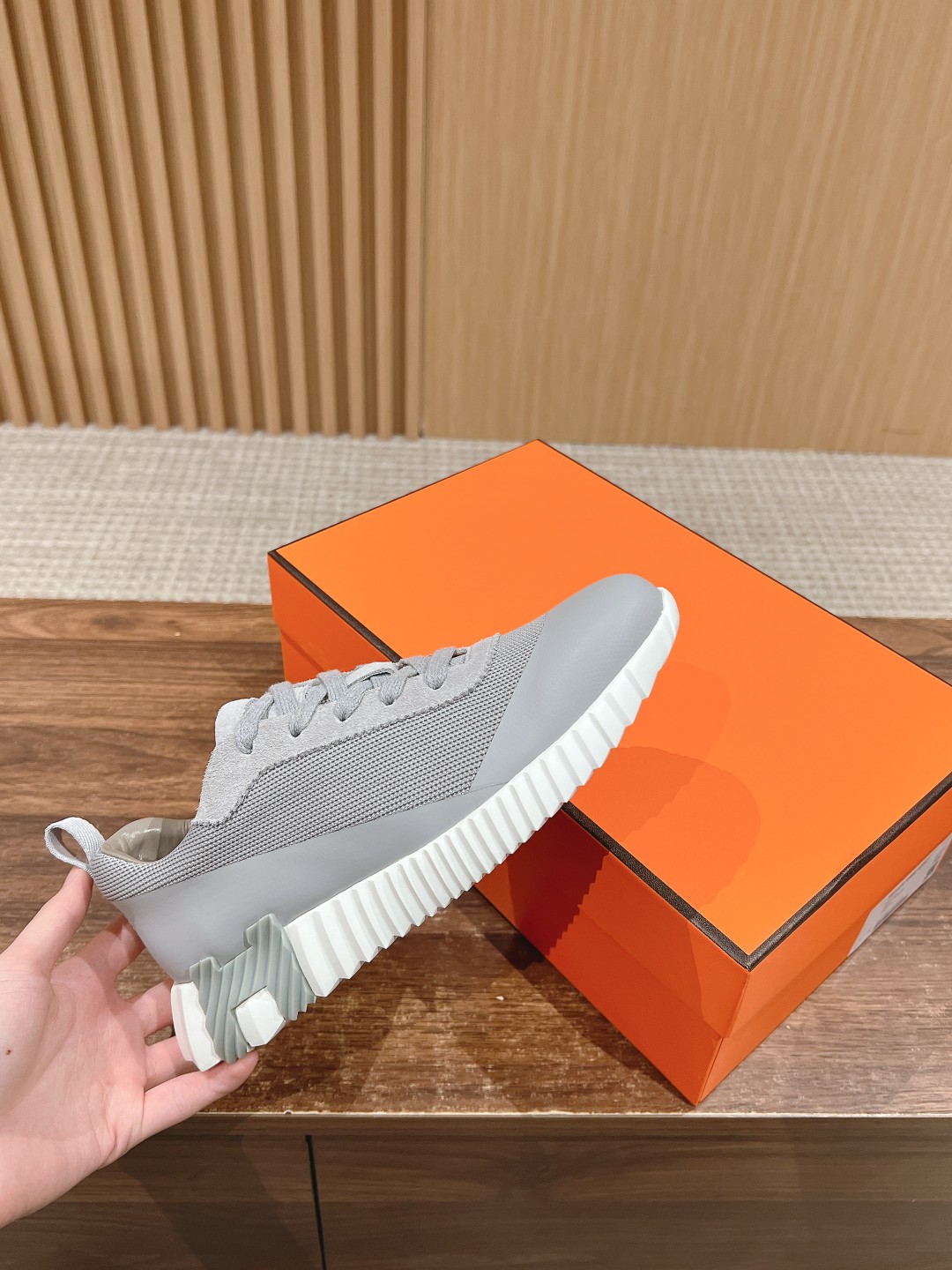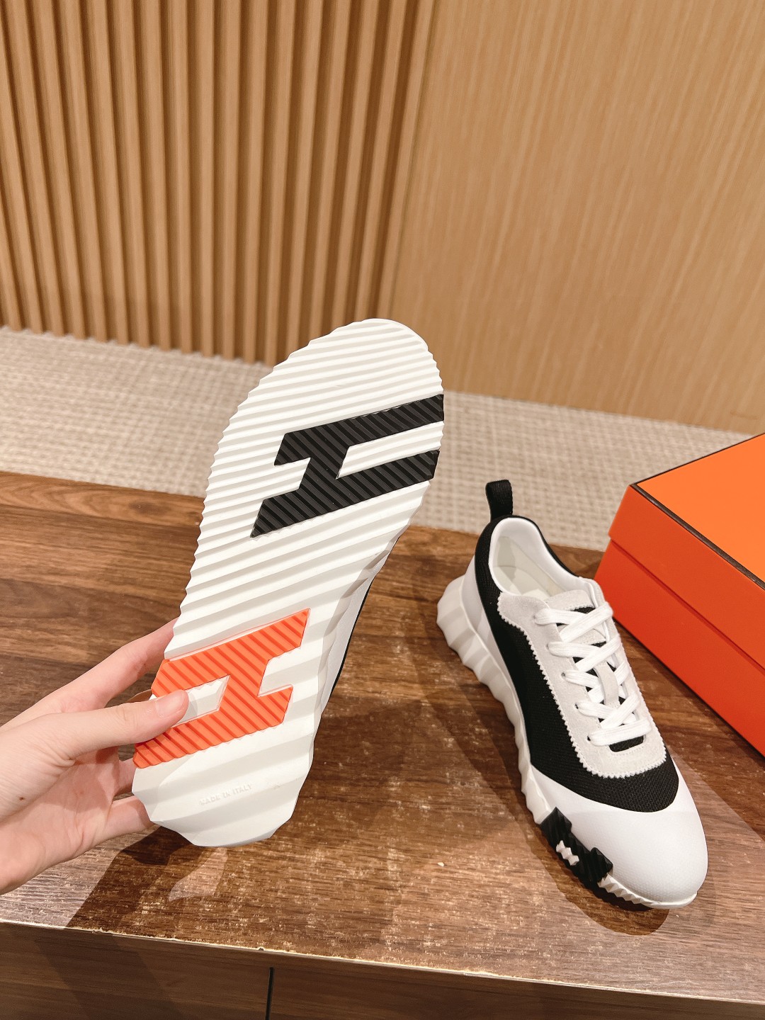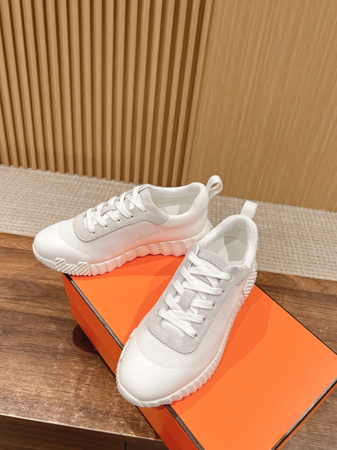爱马*情侣款休闲鞋 麂皮搭拼接网布运动鞋。