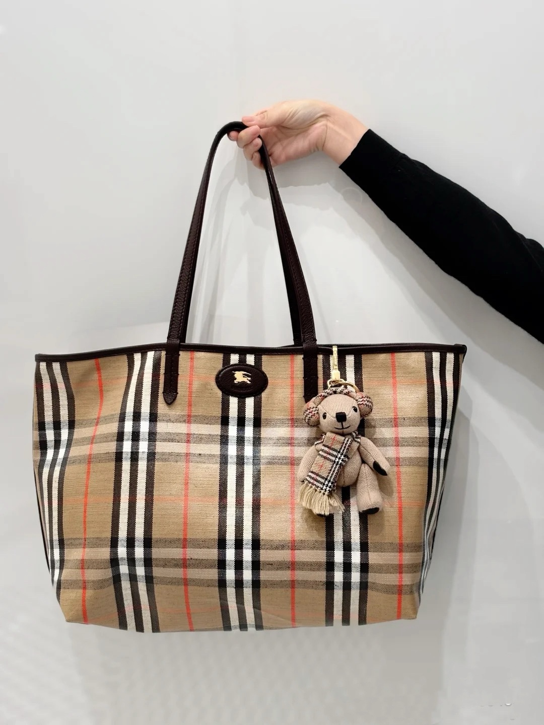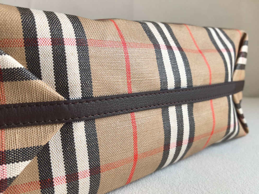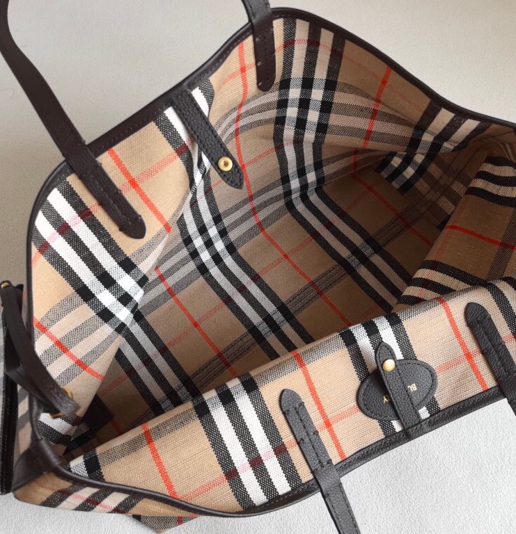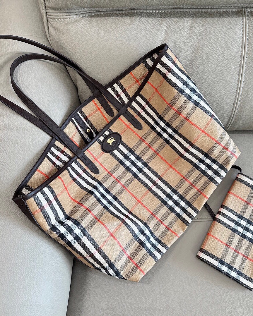 亚麻涂层材料 防水防脏耐磨,新款托特包,汲取户外设计理念打造。选用棉质亚麻混纺面料制成,融入光滑小牛皮装饰。装饰提花精纺的 Burberry格纹,设有风衣灵感涂层饰面。无内衬款式点缀骑士印章,源自1980 年代品牌包款的典藏图案。正面饰有马术骑士徽标(EKD) 尺寸38× 16.5 x 28cm.
