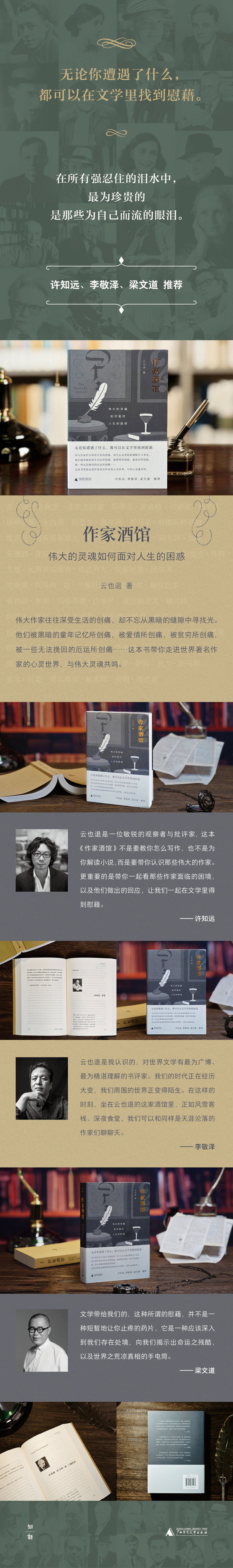 跟随我,我将带你去见一见,最近一百多年间的很多位文人,他们是小说家或是诗人,他们都在史上留名,他们有大名鼎鼎的作品,也有不是很知名但依然有趣的种种文字;我也会告诉你,在这些文字的背后,是怎样一些对生活、对他人、对世界充满疑惑,甚至为此而挣扎的人,他们不是凭天才写作,而是以自己的血肉生命炼出灵感。在这间酒馆里,作家们离开了殿堂,成为一些坐在我身边,小酌几杯,徐徐倾诉衷肠的老朋友。