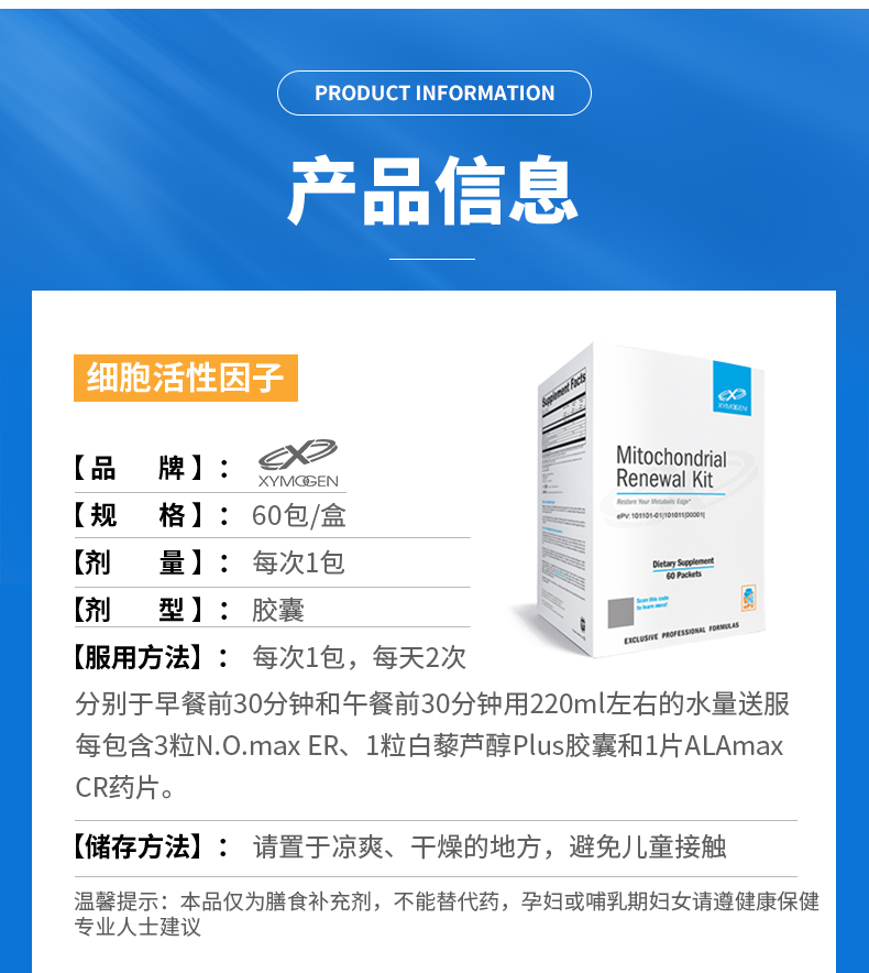 【效期至26年11月】细胞活性因子胶囊 XYMOGEN Mitochondrial Renewal Kit 60包/盒