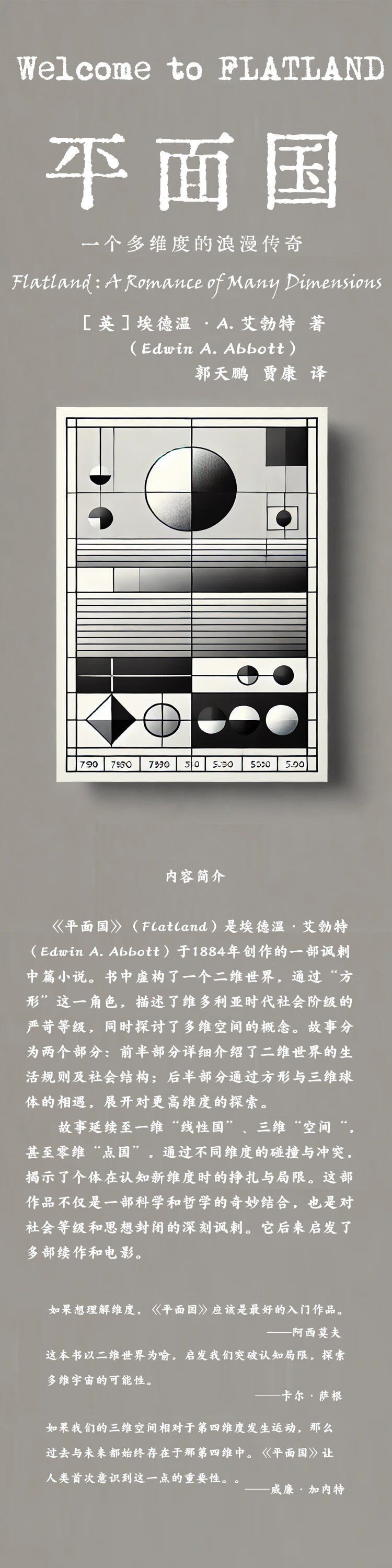 《平面国》是一部由艾勃特创作的经典哲学科幻小说,以二维世界的奇妙视角,探讨空间、维度与社会阶层的关系。通过主角方形的经历,揭示了狭隘视角的局限性及突破思维边界的重要性。这部作品兼具科学思辨与社会隐喻,是一场关于空间几何与哲学思想的双重探索,适合任何热爱奇思妙想的读者品读。