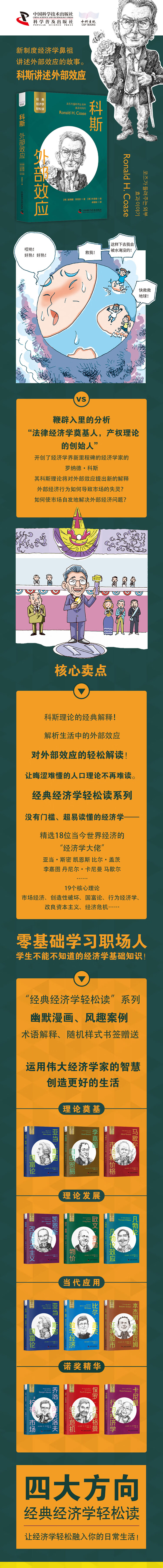 罗纳德·科斯(Ronald H. Coase,1910-2013)作为开拓法律经济学、新制度经济学、交易费用经济学领域的英国经济学家。他为市场经济引进了交易成本的概念,并且通过在市场失灵的情况下也不需要政府介入的“科斯理论”获得了1991年诺贝尔经济学奖。科斯主张通过经济主体当事人之间的协商,无需法律干预便可以解决外部效应。罗纳德·科斯会在这本书中向我们讲解他的经典理论,给我们新的启发。外部效应是指某种经济主体的行为给其他经济主体带来意外好处或损失,而无需为此付出代价或获得报酬。这种效应可以通过市场机制来解决,也可以通过政府干预来解决。外部效应可以分为积极的外部效应和负面的外部效应。积极的外部效应是指某个经济主体的行为给其他经济主体带来好处,例如环保技术的推广;而负面的外部效应是指某个经济主体的行为给其他经济主体带来损失,例如污染。