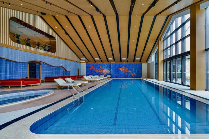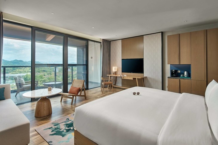 度假村整体设计以江南秀水,国风立意,新中式的室内装潢融合当地“山”与“水”的元素,以暖色作为基调,勾勒出精致而活力的建筑线条,一共222间客房,包含17间湖景套房和7间家庭套房,每一间客房拥有精致典雅的装潢,缓缓步入阳台欣赏湖山风景,给予宾客轻松自在的下榻体验。