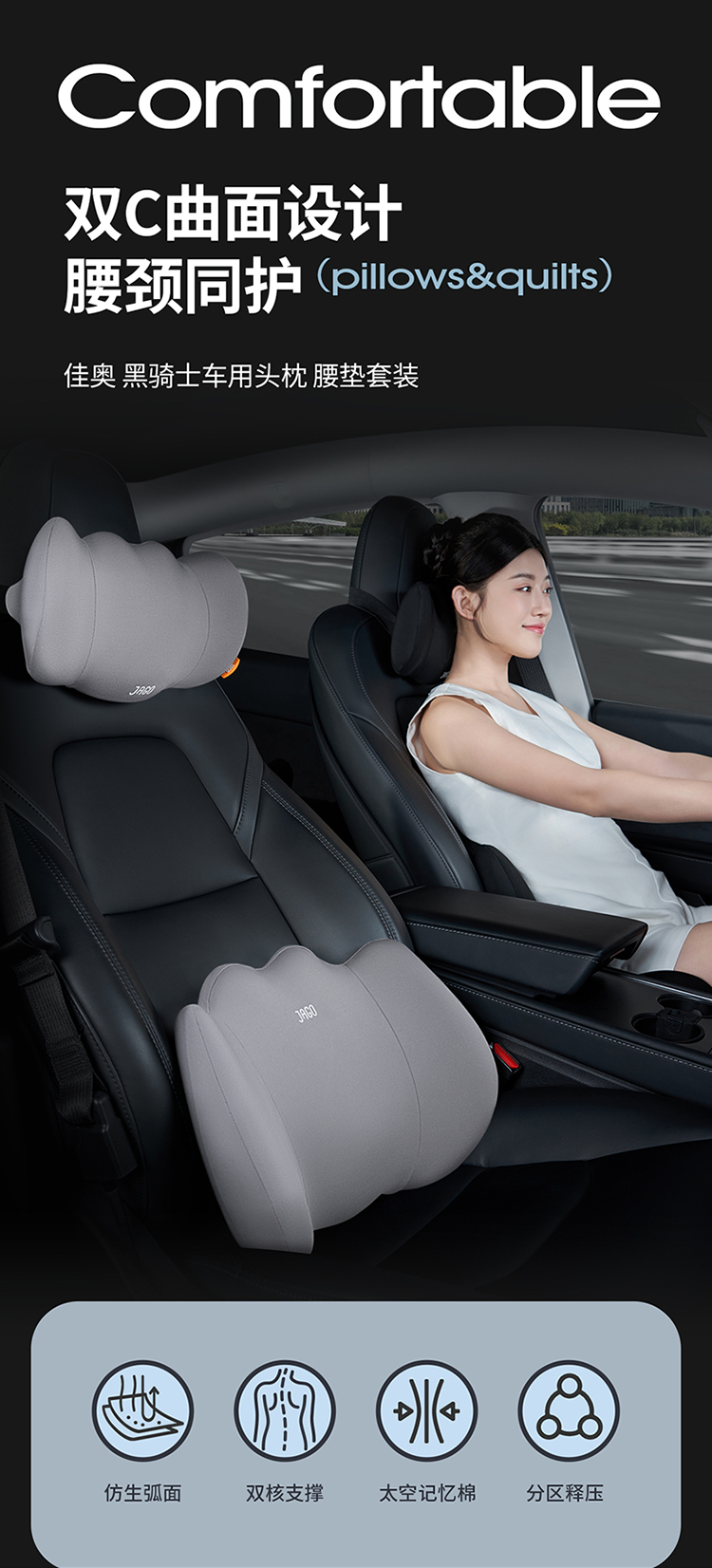 佳奥 黑骑士车内头枕护颈枕 车用腰靠垫 记忆棉套装