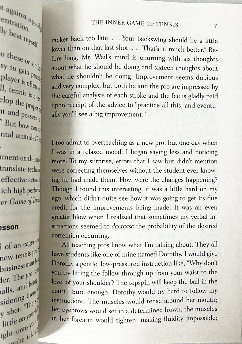 A phenomenon when first published in 1972, the Inner Game was a real revelation. Instead of serving up technique, it concentrated on the fact that, as Gallwey wrote, "Every game is composed of two parts, an outer game and an inner game." The former is played against opponents, and is filled with lots of contradictory advice; the latter is played not against, but within the mind of the player, and its principal obstacles are self-doubt and anxiety. Gallwey's revolutionary thinking, built on a foundation of Zen thinking and humanistic psychology, was really a primer on how to get out of your own way to let your best game emerge. It was sports psychology before the two words were pressed against each other and codified into an accepted discipline.