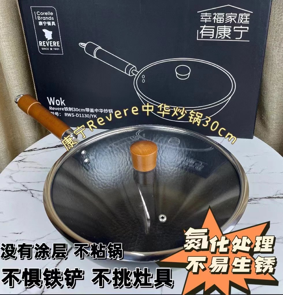 京东卖499❗️3折薅羊毛❗️【康宁Revere中华铁锅30cm带锅盖】做菜香有锅气👉各种煎炸焖煮爆炒都可以👌氮化处理不易生锈,无涂层更健康😁耐磨、耐腐蚀、耐高温;不惧铁铲、钢丝球,随心所欲