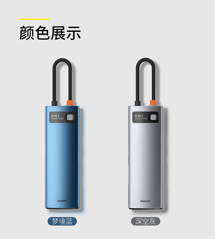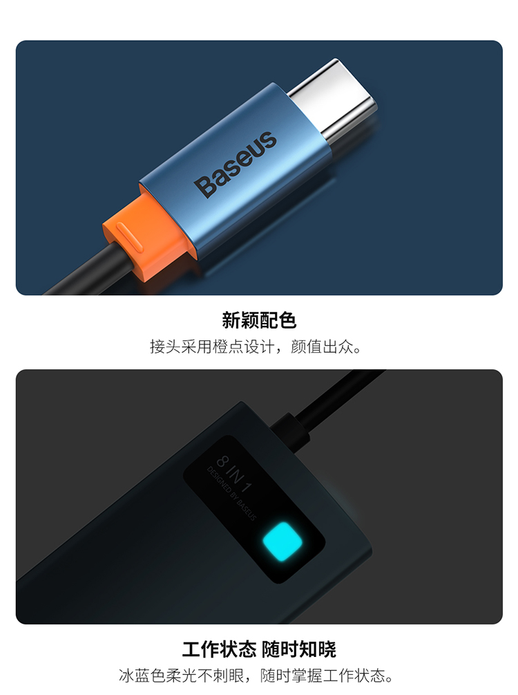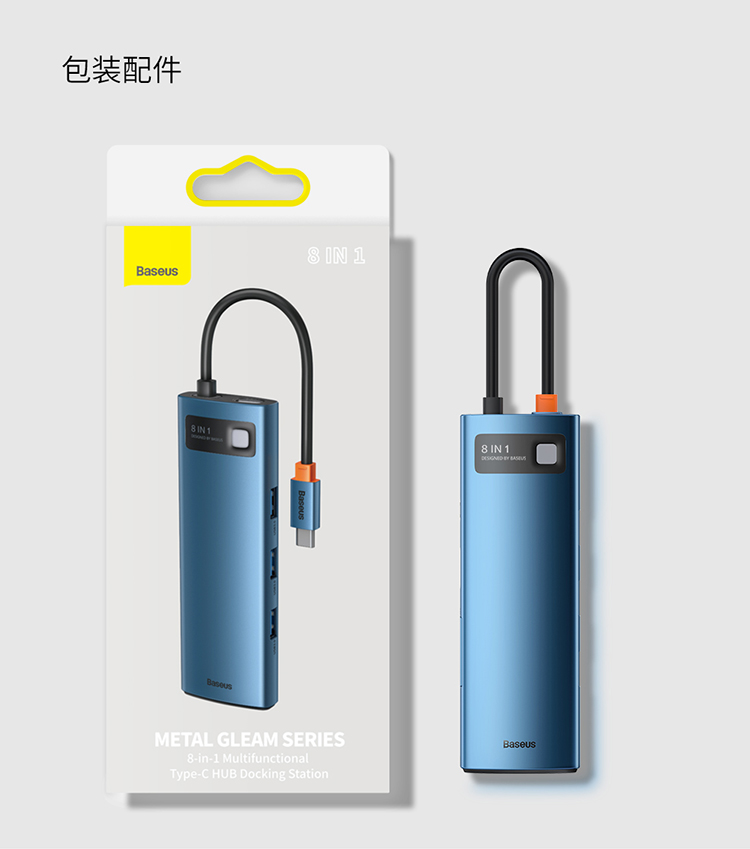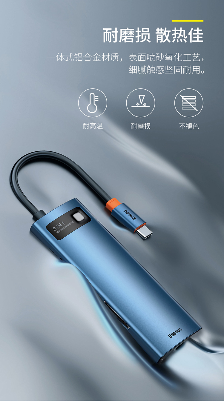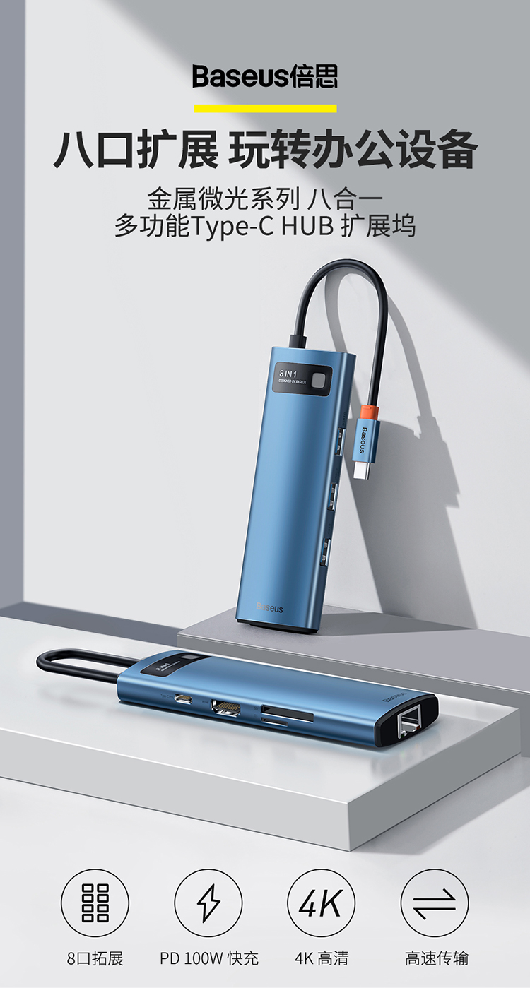 倍思 金属微光系列 八合一多功能Type-C HUB 扩展坞 梦境蓝(Type-C to HDMI*1+USB3.0*3+PD*1+RJ45*1+SD/TF*1)