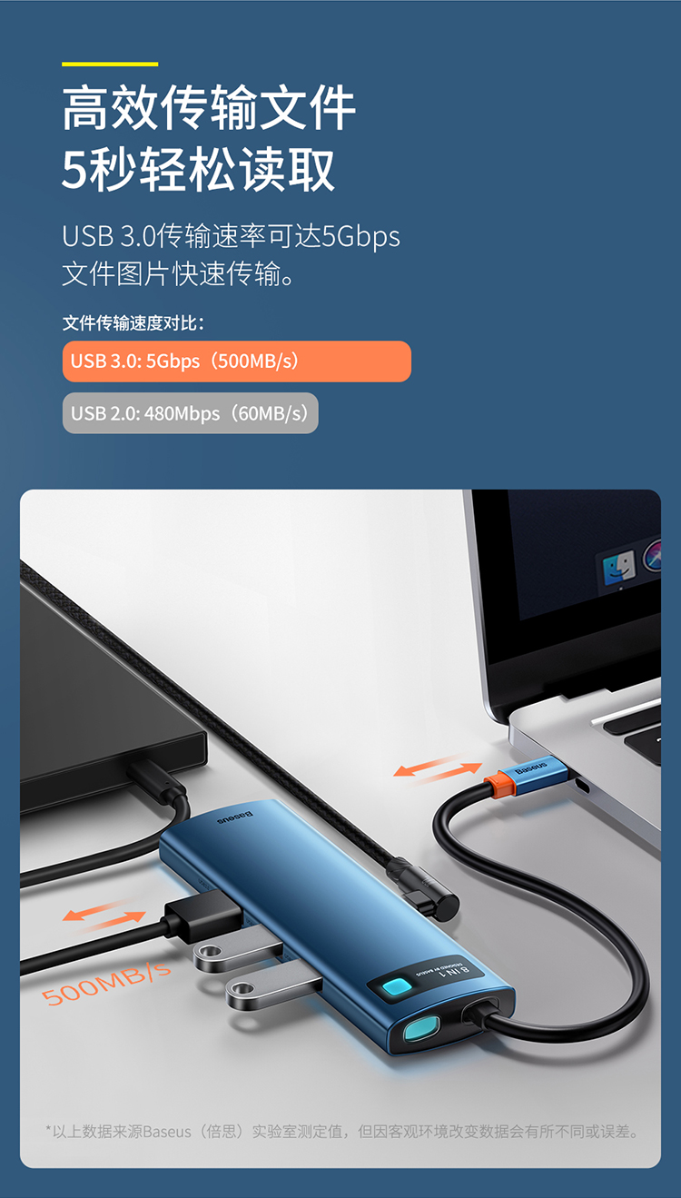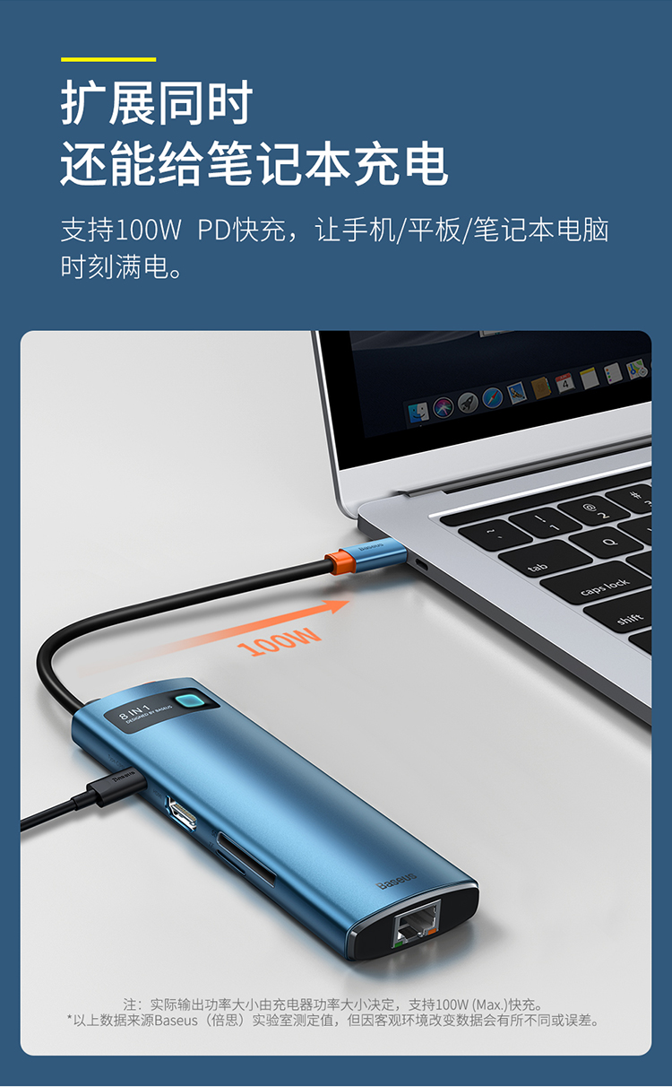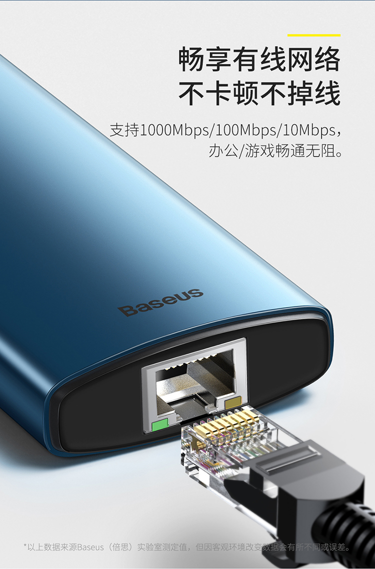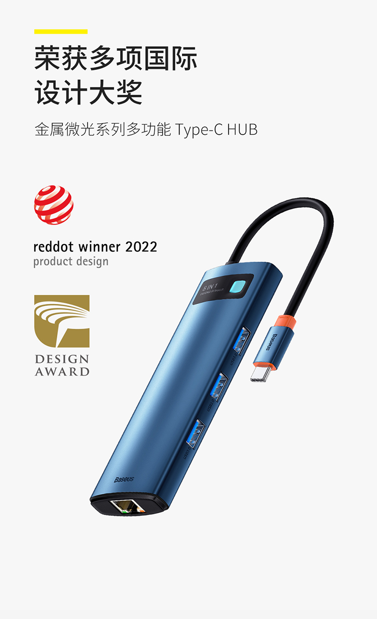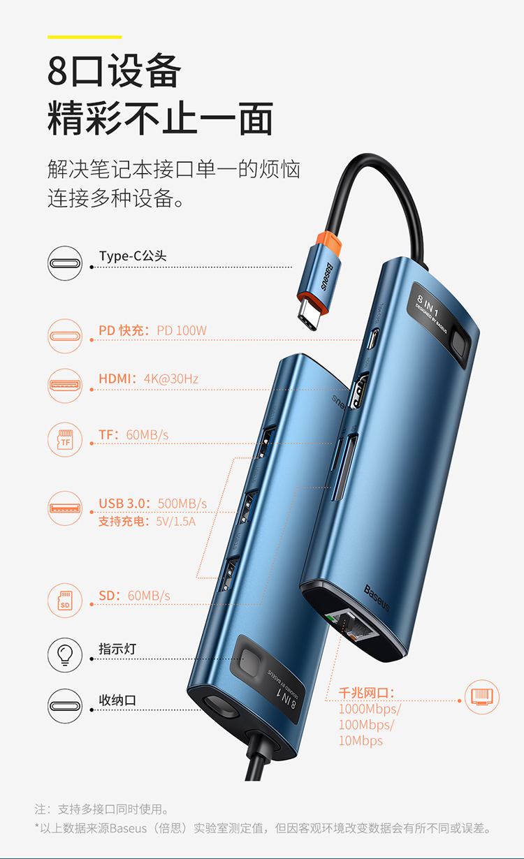 倍思 金属微光系列 八合一多功能Type-C HUB 扩展坞 梦境蓝(Type-C to HDMI*1+USB3.0*3+PD*1+RJ45*1+SD/TF*1)