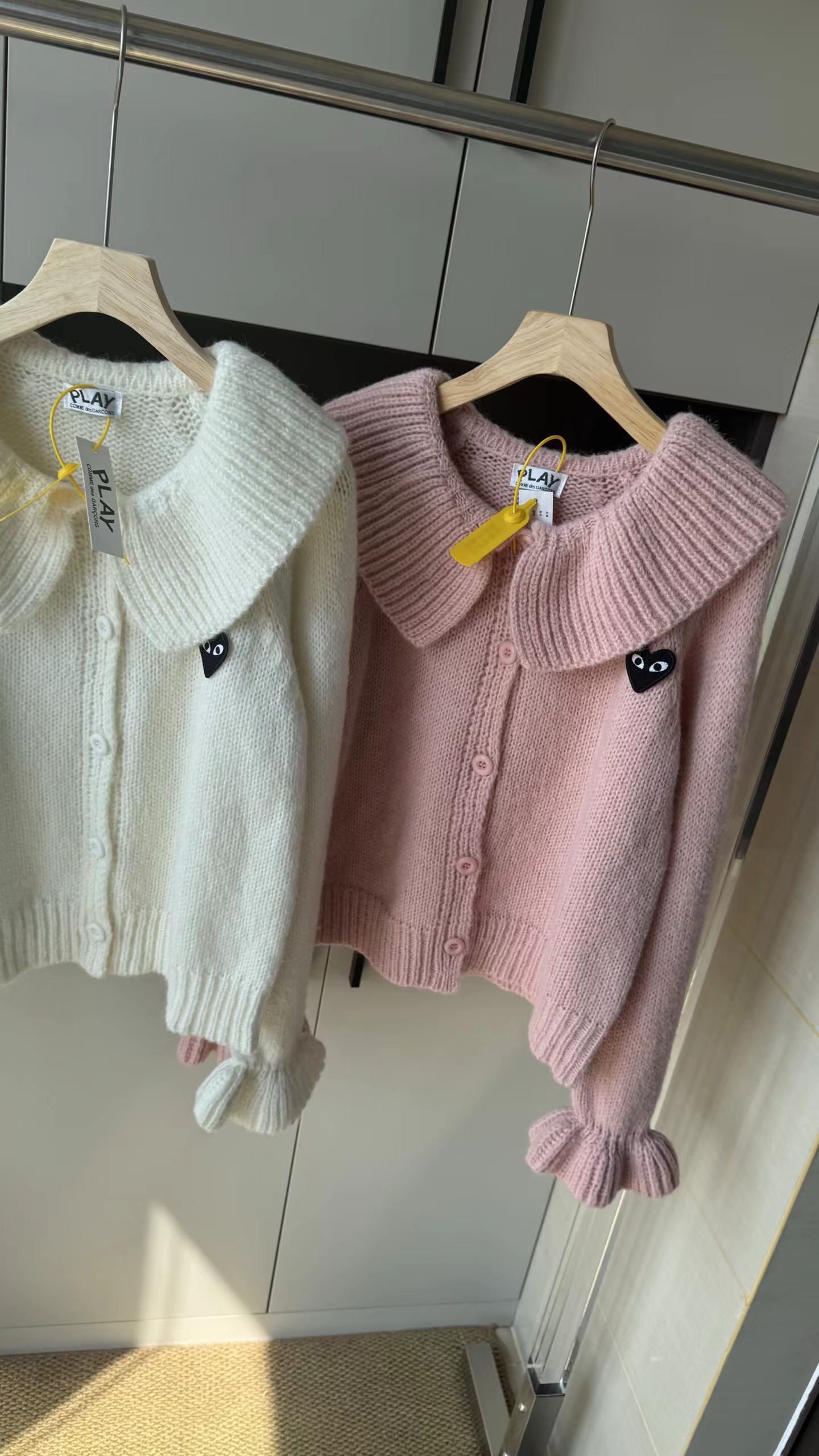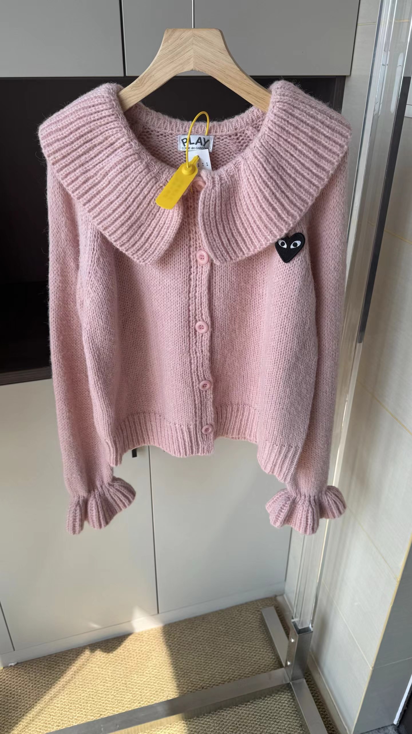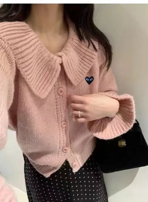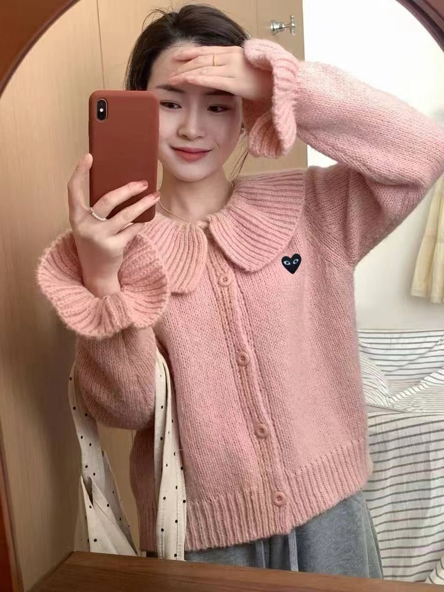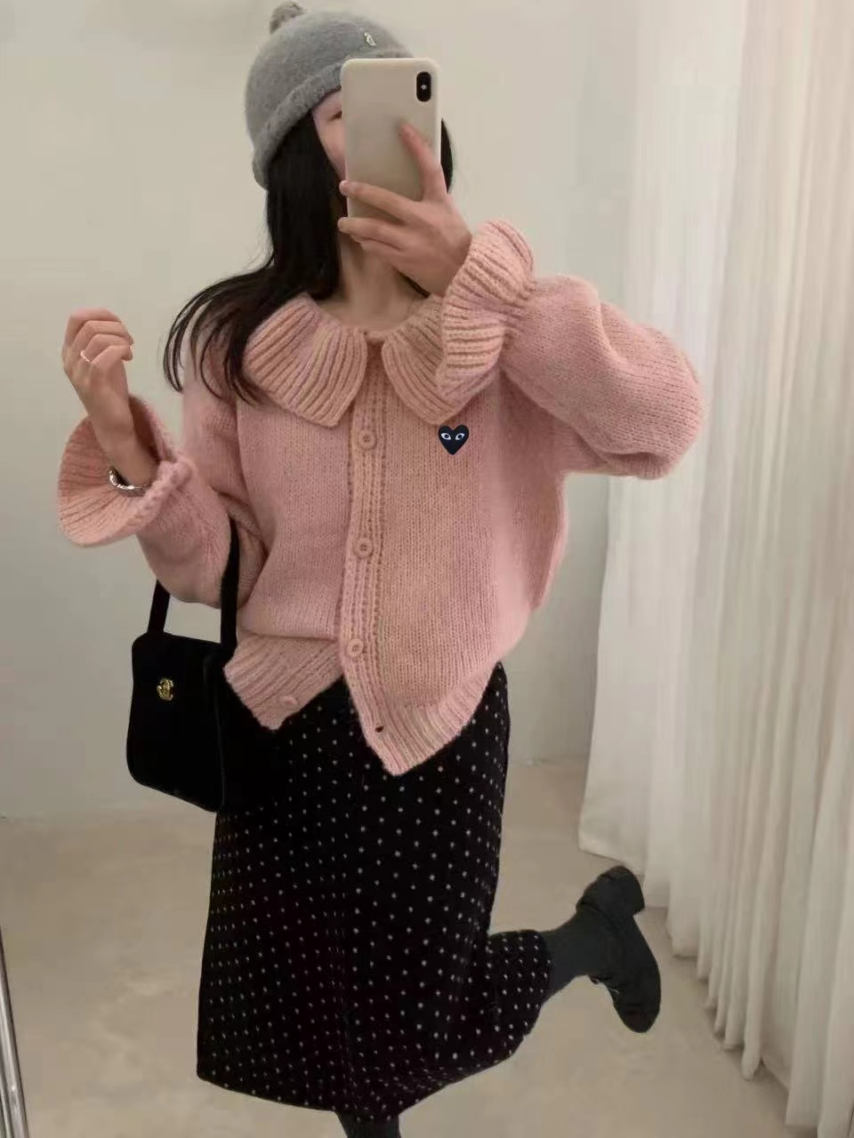 大翻领针织开衫温柔甜美的日系少女风,软糯的色调与版型自带慵懒氛围感,适配约会、通勤、日常出街等多种场景柔和的浅粉色调,低饱和度不挑皮,自带减龄效果。大翻领设计是亮点,宽边针织领型修饰脖颈线条,同时增添复古感与层次感。 宽松落肩版型,对身材包容性强,弱化肩线,营造随性慵懒的氛围。 单排纽扣开合,方便穿脱,也可半开穿着打造随性造型。袖口采用喇叭褶皱设计,增加了甜美感与灵动性,修饰手臂线条。下摆为微短款设计,搭配高腰下装能优化身材比例,显高显瘦。左胸位置点缀黑色爱心刺绣小标,提升了单品辨识度,增添俏皮感。粗针织面料,纹理清晰可见,触感柔软蓬松,保暖性与舒适度俱佳,适合秋冬季节。面料带有轻微空气感,上身轻盈不臃肿,能自然呈现柔和垂坠感