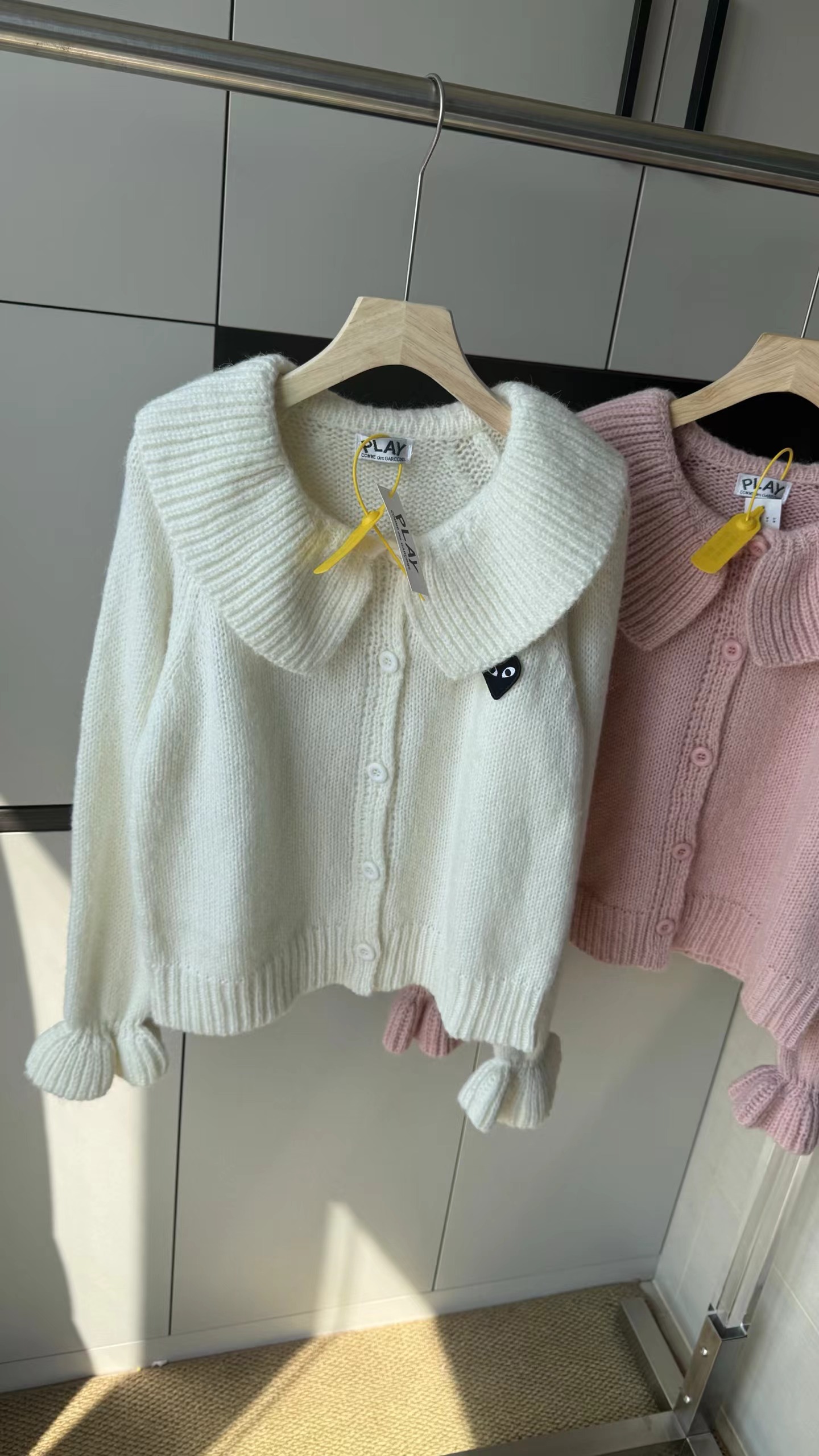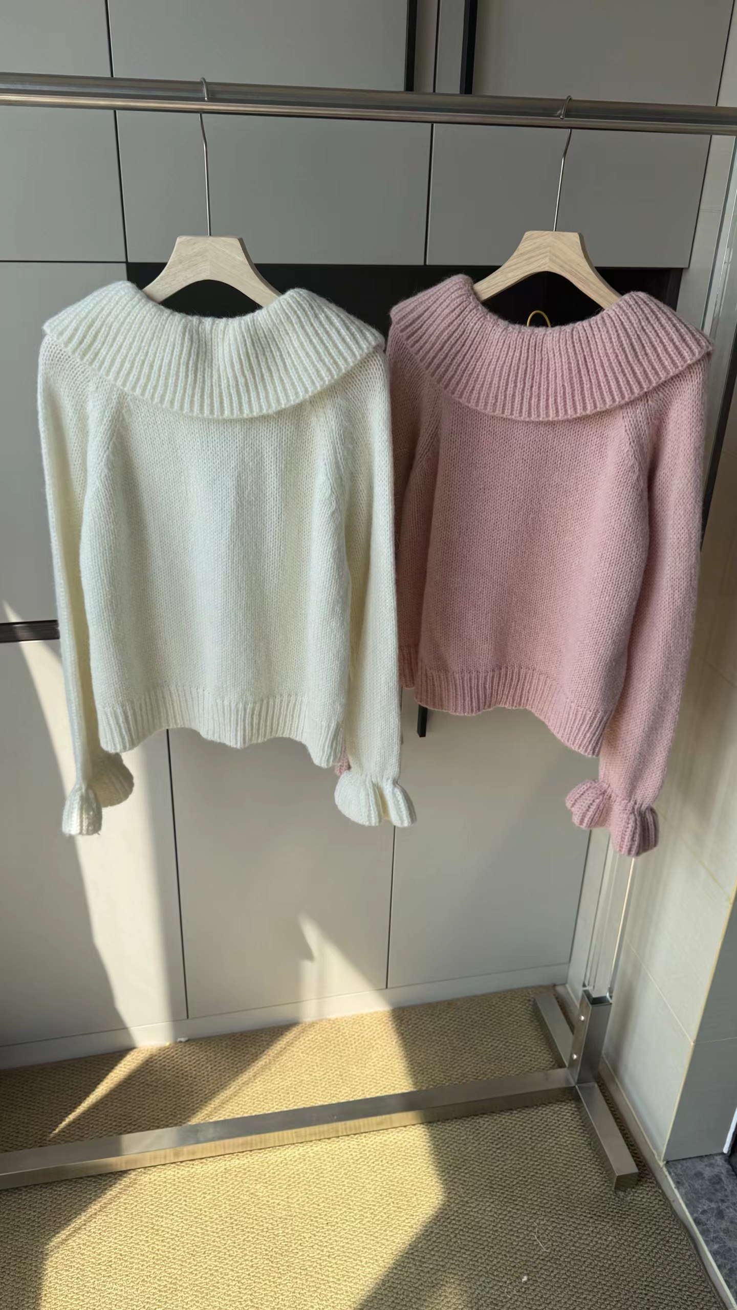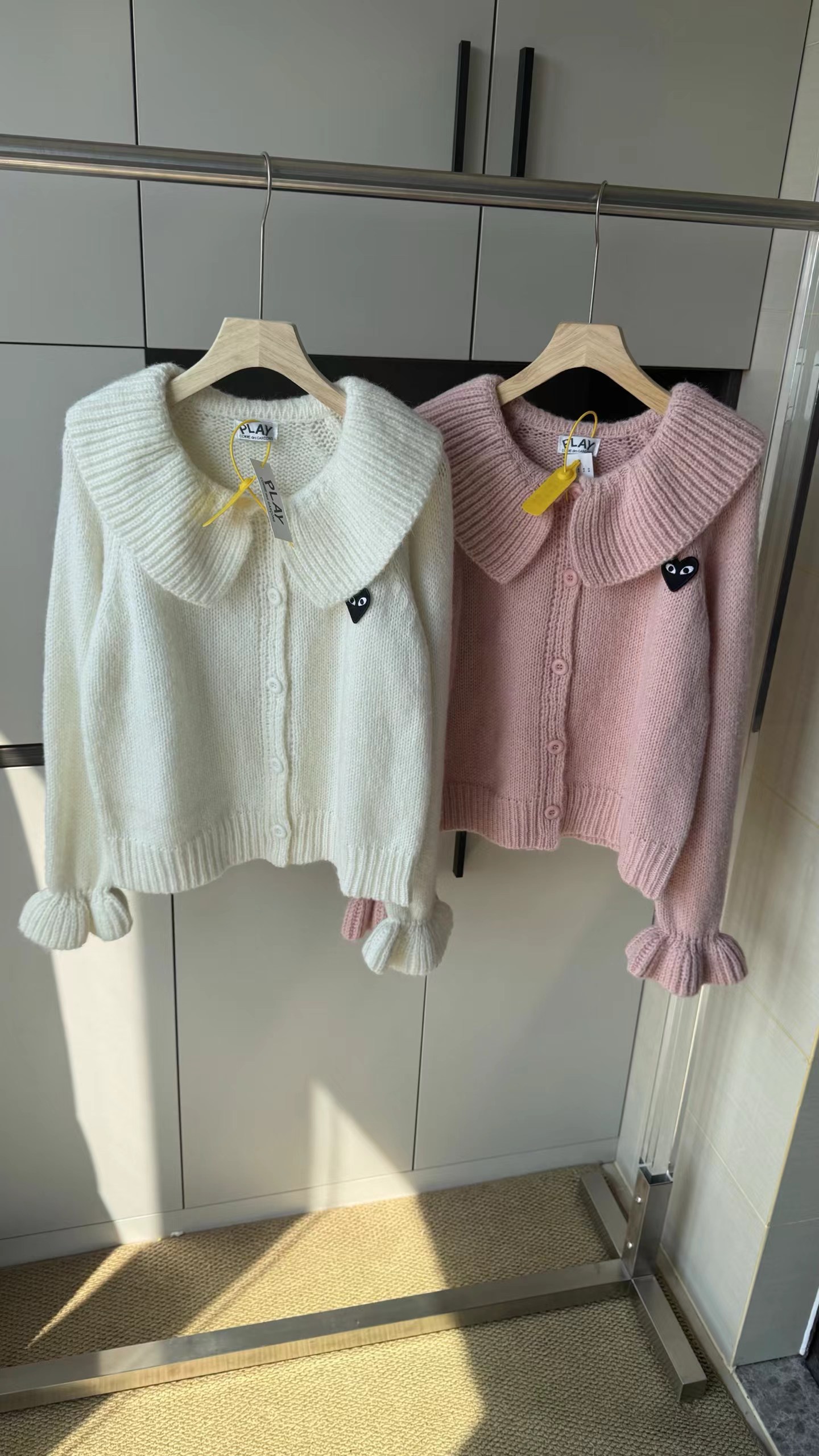 大翻领针织开衫温柔甜美的日系少女风,软糯的色调与版型自带慵懒氛围感,适配约会、通勤、日常出街等多种场景柔和的浅粉色调,低饱和度不挑皮,自带减龄效果。大翻领设计是亮点,宽边针织领型修饰脖颈线条,同时增添复古感与层次感。 宽松落肩版型,对身材包容性强,弱化肩线,营造随性慵懒的氛围。 单排纽扣开合,方便穿脱,也可半开穿着打造随性造型。袖口采用喇叭褶皱设计,增加了甜美感与灵动性,修饰手臂线条。下摆为微短款设计,搭配高腰下装能优化身材比例,显高显瘦。左胸位置点缀黑色爱心刺绣小标,提升了单品辨识度,增添俏皮感。粗针织面料,纹理清晰可见,触感柔软蓬松,保暖性与舒适度俱佳,适合秋冬季节。面料带有轻微空气感,上身轻盈不臃肿,能自然呈现柔和垂坠感