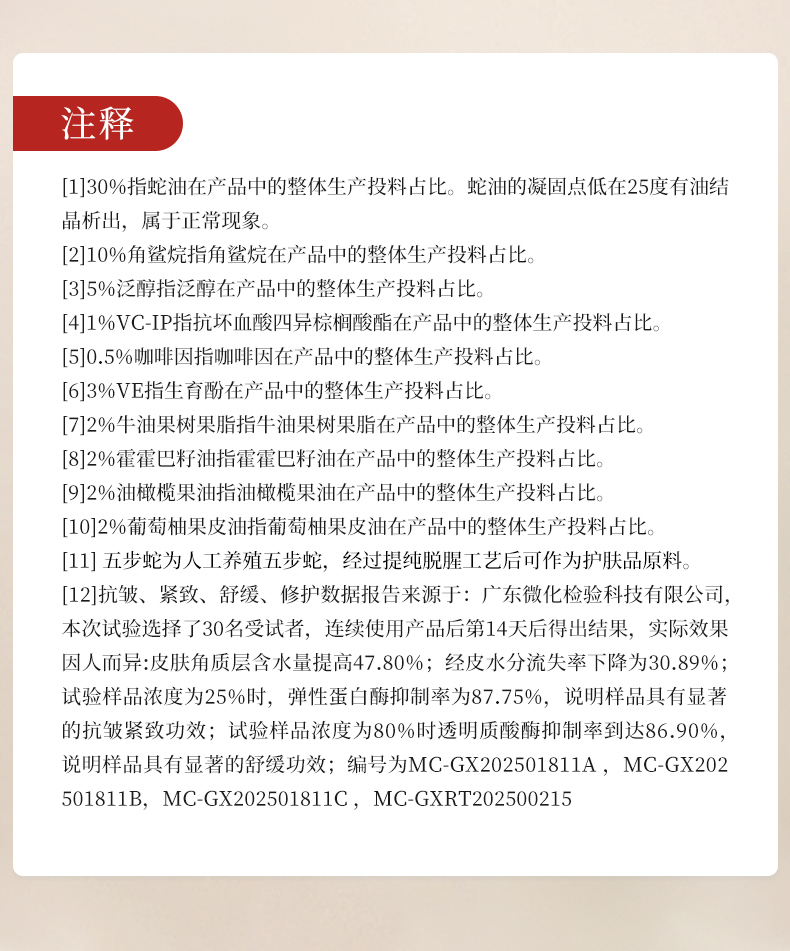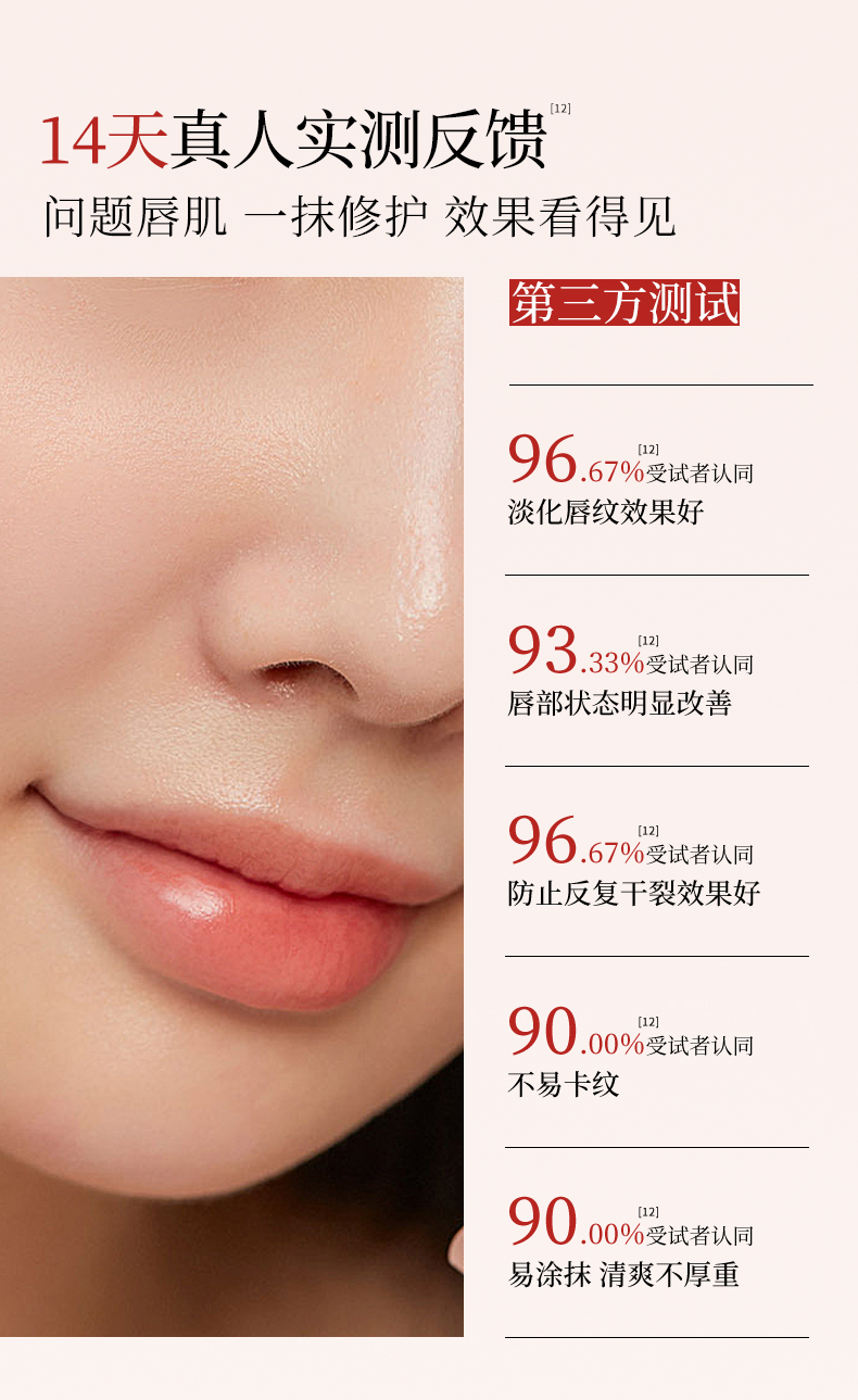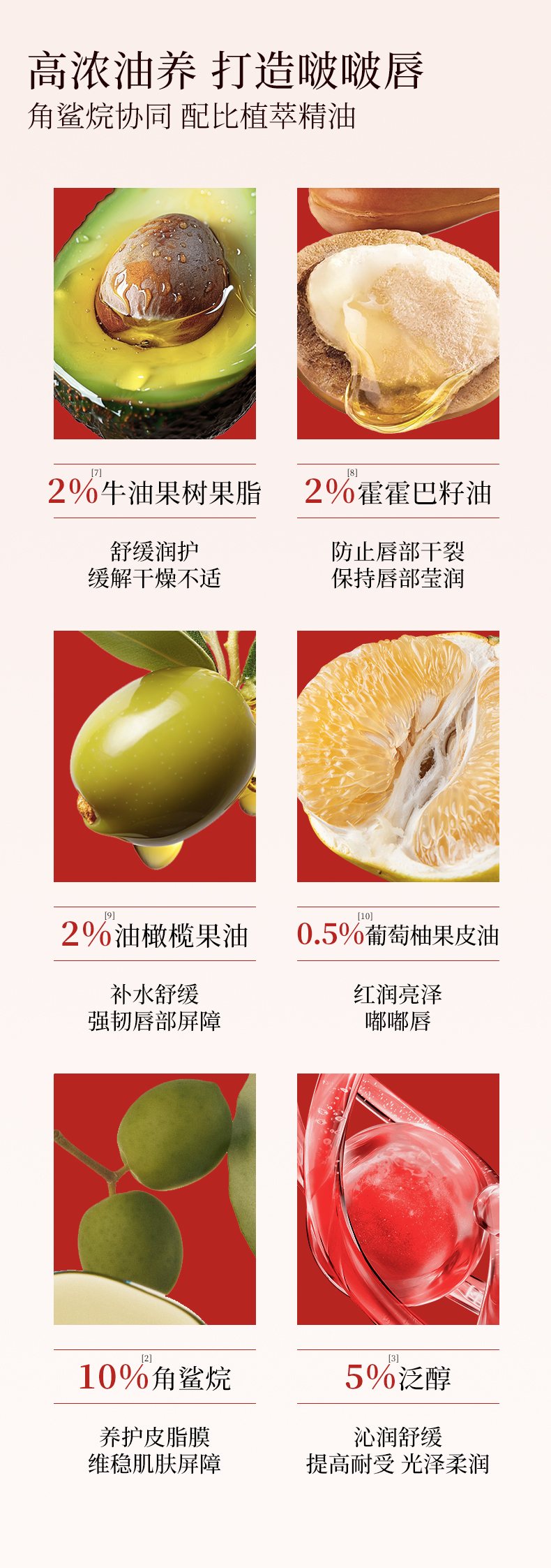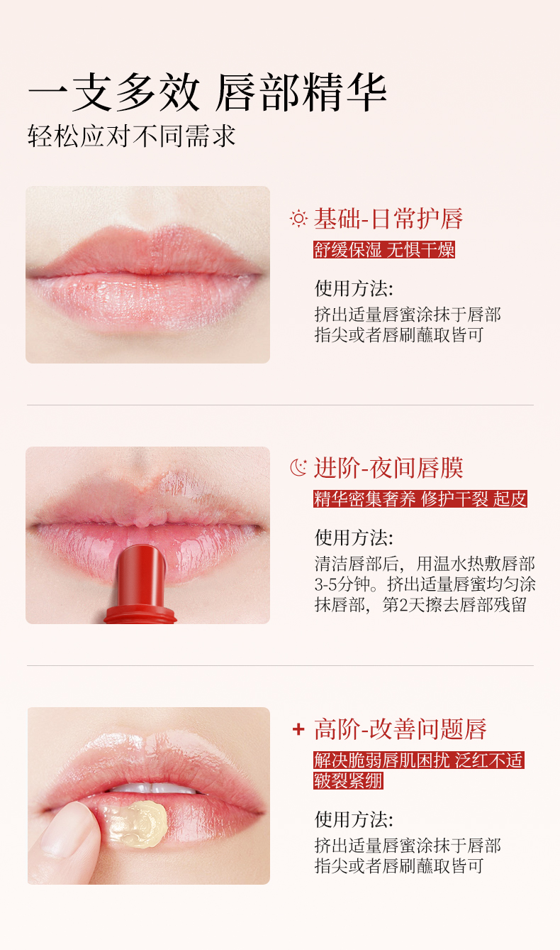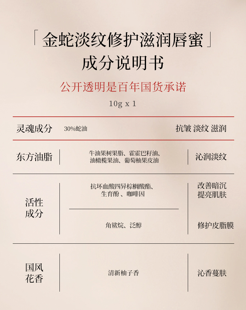 金蛇淡纹修护唇蜜,特别针对干燥脱皮、唇纹加深、暗沉无光等问题唇。唇蜜核心添加30%高倍蛇油精华,搭配超声波萃取专利技术,能最大化锁住蛇油活性,让修护力更具爆发力。原料选用人工养殖五步蛇,经九道工序提纯脱腥,安全无负担;复配10%角鲨烷与5%泛醇,可快速修护唇部屏障,减少经皮水分流失。唇蜜堪称全能选手,1%VC-IP与3%VE协同焕亮,改善暗沉;0.5%咖啡因搭配牛油果树果脂、霍霍巴籽油,让唇部更显丰盈饱满;2%油橄榄果油复配葡萄柚果皮油,进一步强韧屏障、舒缓不适。10g大容量搭配温和无添加配方,斜口设计贴合唇部轮廓,晶莹油蜜质地一触即化,裹挟着东方馥郁的柚子清香,日常快速补水舒缓,晚上还可以厚敷作为唇膜,能密集修护干裂起皮!