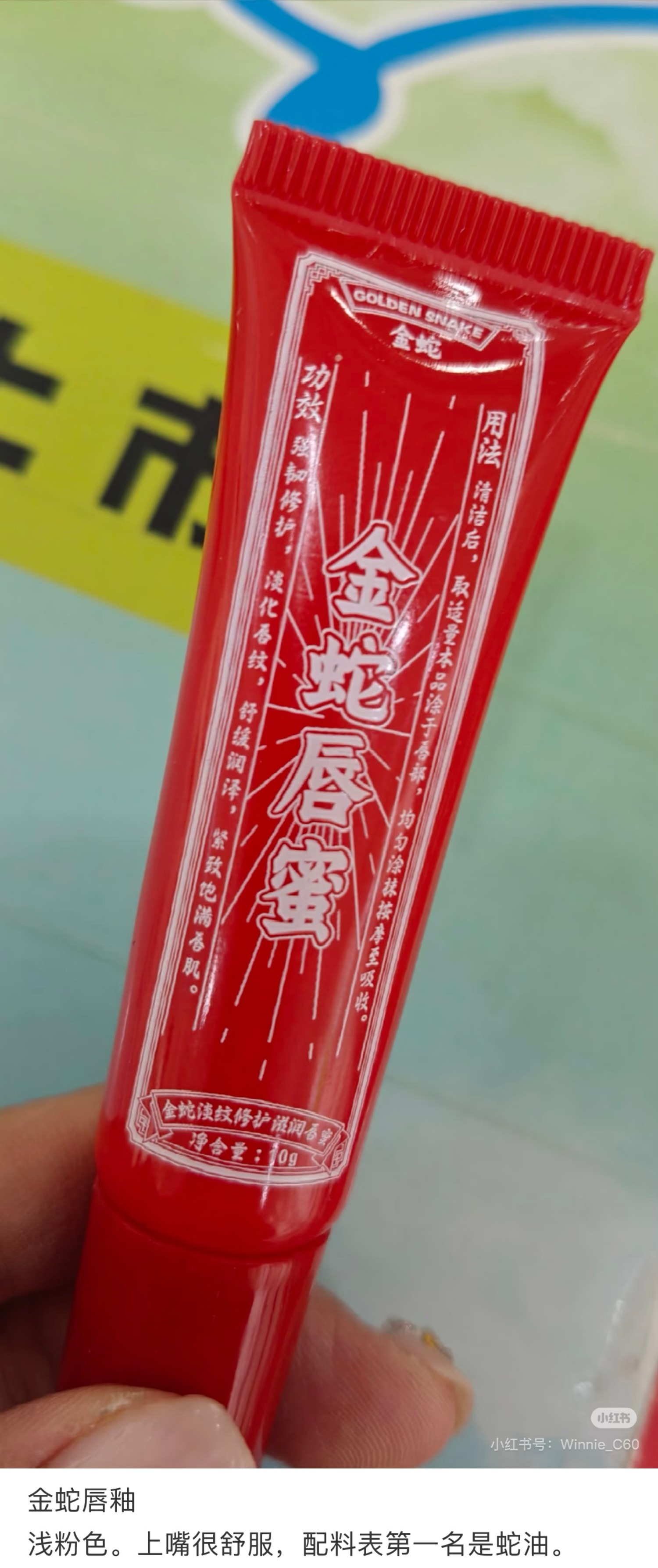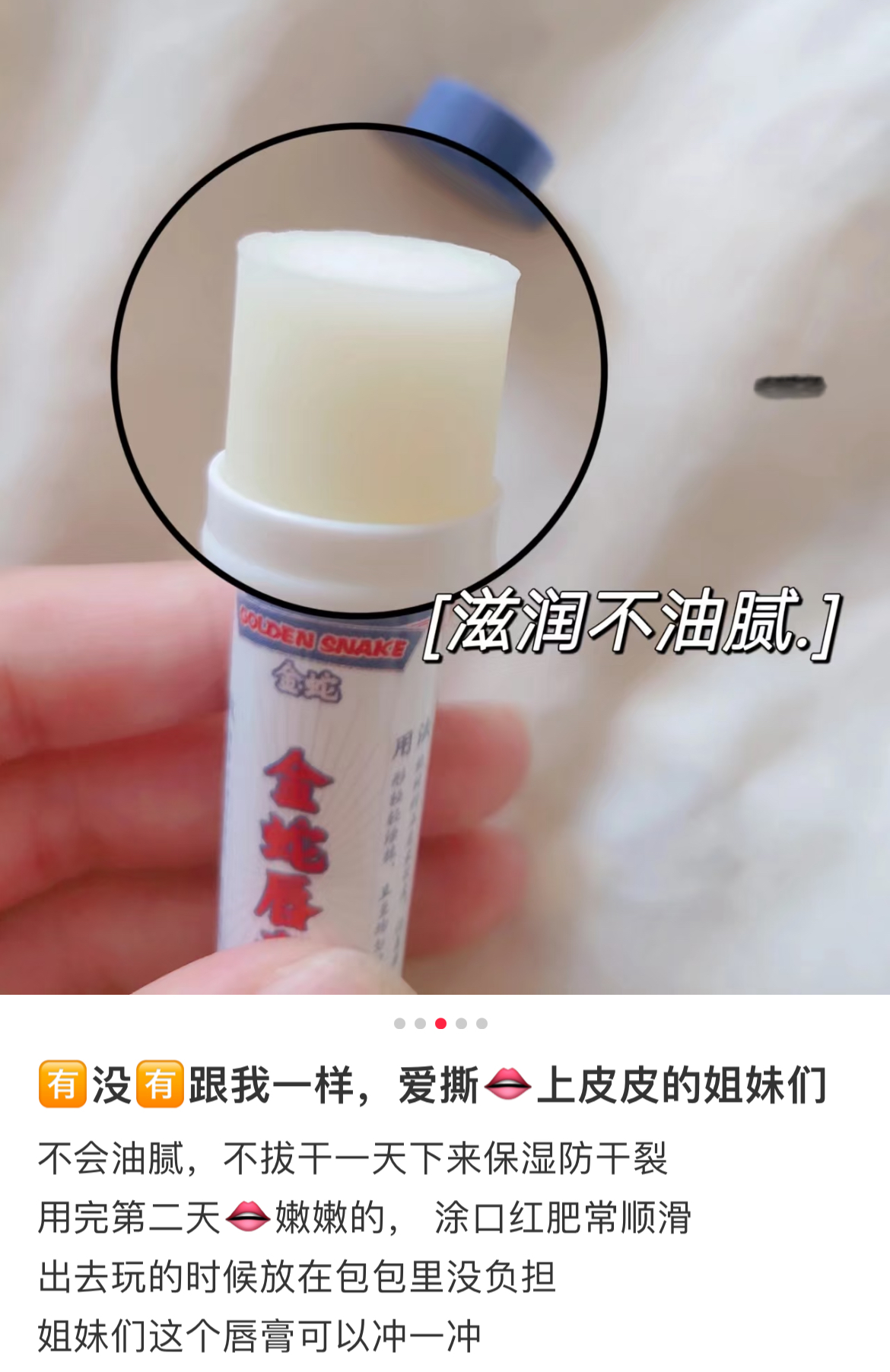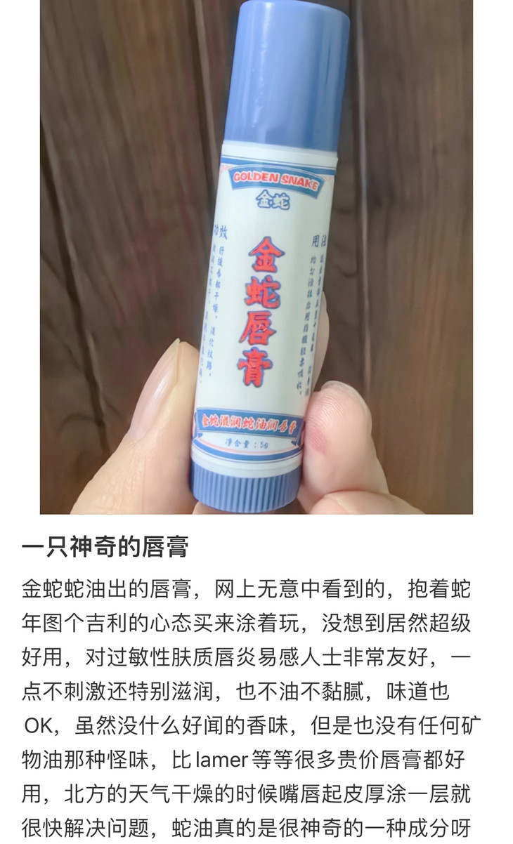 蛇油,自古以来便是干皮人的传奇救星,早在几百年前,古人们便智慧地利用它来理疗烫伤,以及干燥、多皱、粗糙等皮肤问题。在两千年前的《神农本草经》和明代李时珍所著的《本草纲目》中,均详细记载了蛇油治疗皮肤干裂冻裂的神奇功效。而现代科学研究进一步证实,蛇油中所含的滋养成分与人体皮下脂肪成分极为相似,能够轻松渗透肌肤,提供深度滋养。金蛇蛇油的唇膏和唇蜜,虽然包装非常朴素,没想到也非常好用,它将蛇油与多种植物精油巧妙融合,油润细腻。而且品牌坚持8大无添加,大小朋友都可以放心用。