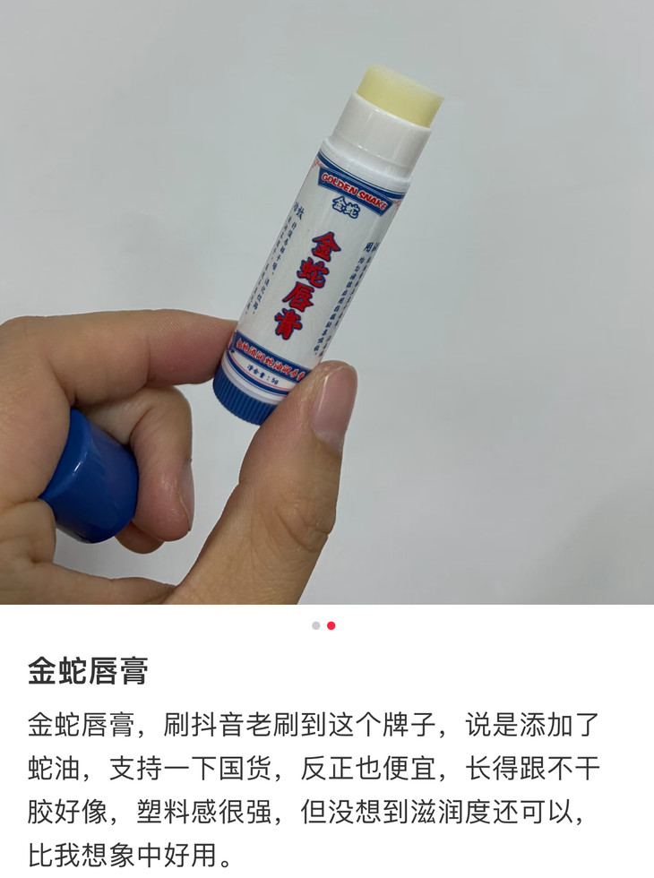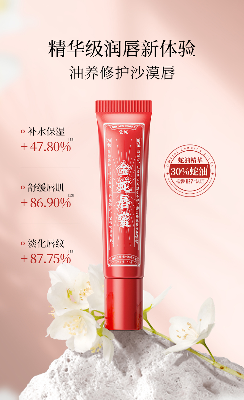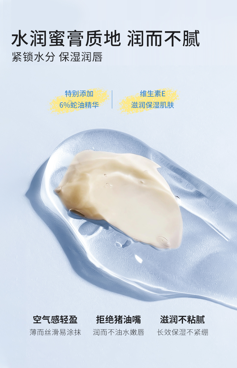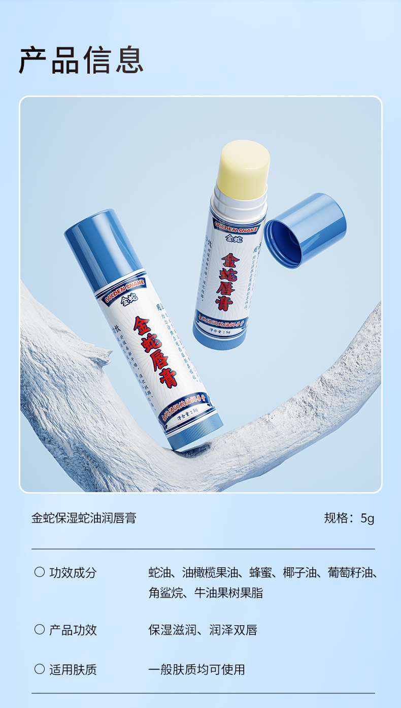 蛇油,自古以来便是干皮人的传奇救星,早在几百年前,古人们便智慧地利用它来理疗烫伤,以及干燥、多皱、粗糙等皮肤问题。在两千年前的《神农本草经》和明代李时珍所著的《本草纲目》中,均详细记载了蛇油治疗皮肤干裂冻裂的神奇功效。而现代科学研究进一步证实,蛇油中所含的滋养成分与人体皮下脂肪成分极为相似,能够轻松渗透肌肤,提供深度滋养。金蛇蛇油的唇膏和唇蜜,虽然包装非常朴素,没想到也非常好用,它将蛇油与多种植物精油巧妙融合,油润细腻。而且品牌坚持8大无添加,大小朋友都可以放心用。