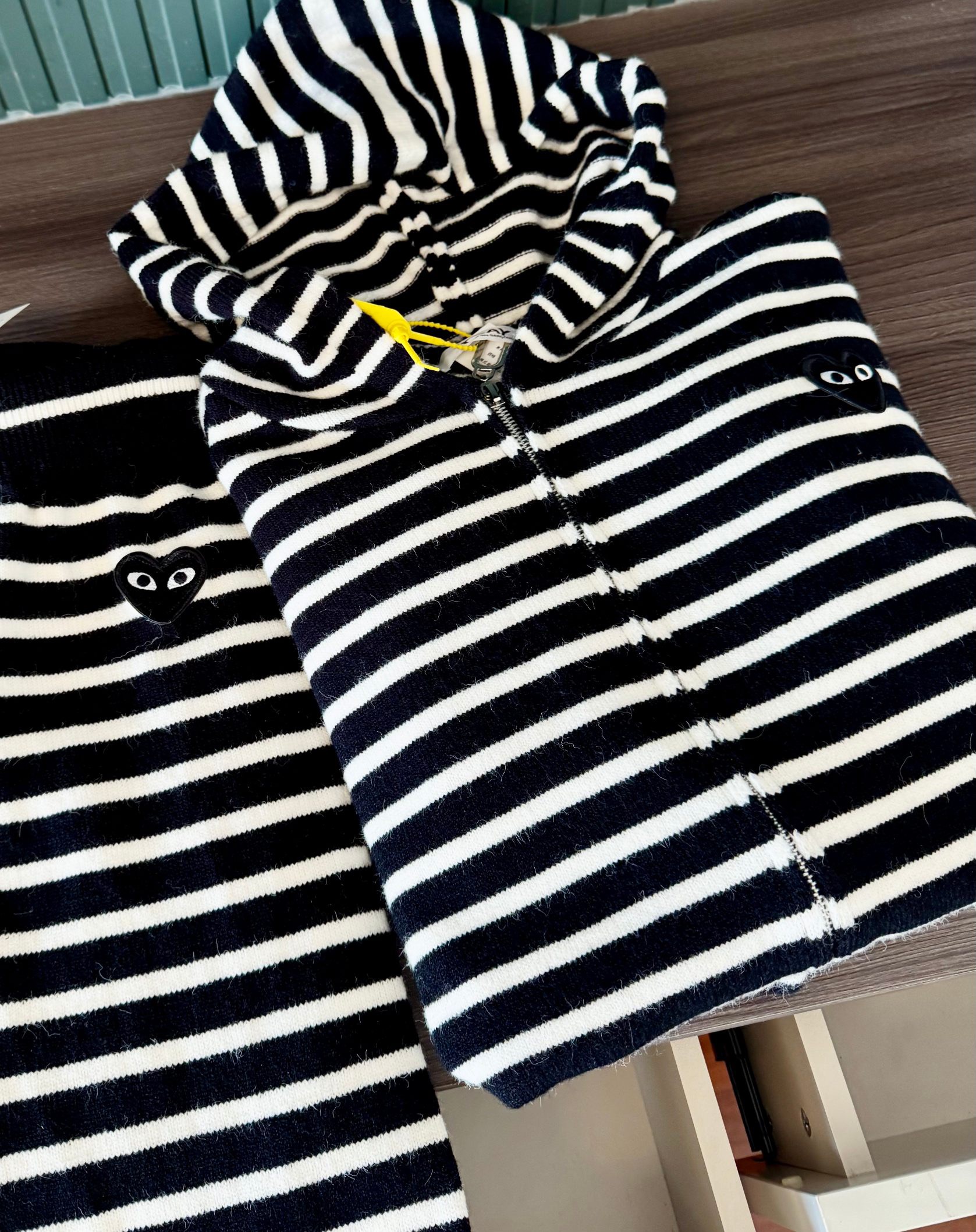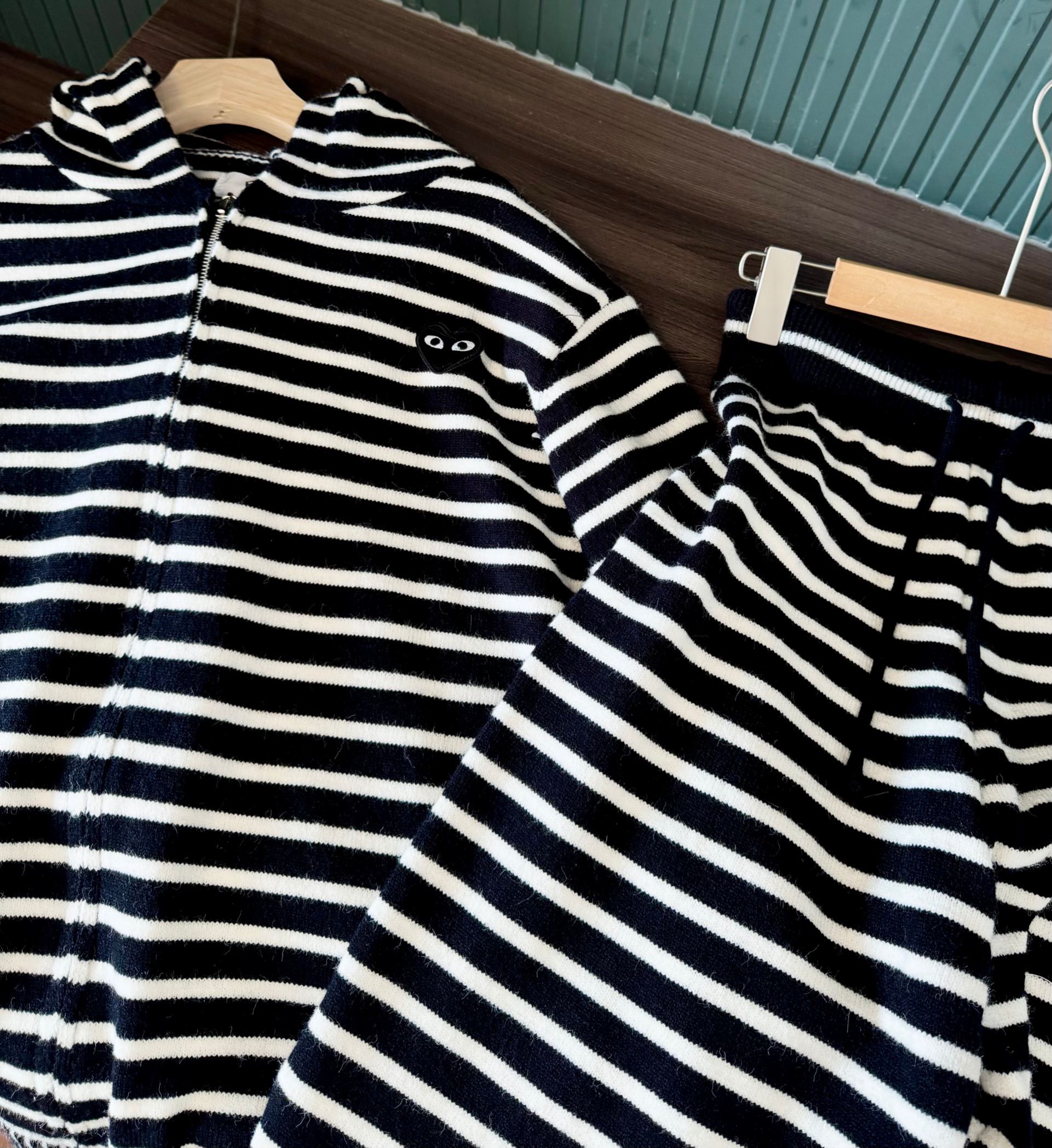 套装给大家加了件时髦货有喜欢的吗? 连帽+撞色条纹+拉链几乎集齐了今年的时髦元素!但是又把它们很好地结合在了一起有细节又不显繁琐时髦精们jue对不能放过它!让我眼前一亮的款!!碰撞在一起就是有种意想不到的艺术感还带着点学院风中间试了很多纱线总感觉有点不对zui终还是选择了定染定染出来的颜色就很正搭配起来很显高]因为颜色已经很好看了再选择细条纹多少有点让人眼花缭乱粗条纹就会好很多看起来更加大气也能更好的发挥颜色的优势 略宽松的就是小个子姐妹们的天菜狠显比例而且不怎么挑身材胖瘦都能穿出美感 料子的手感敲好 摸起来软软糯糯的贴肤穿也不扎