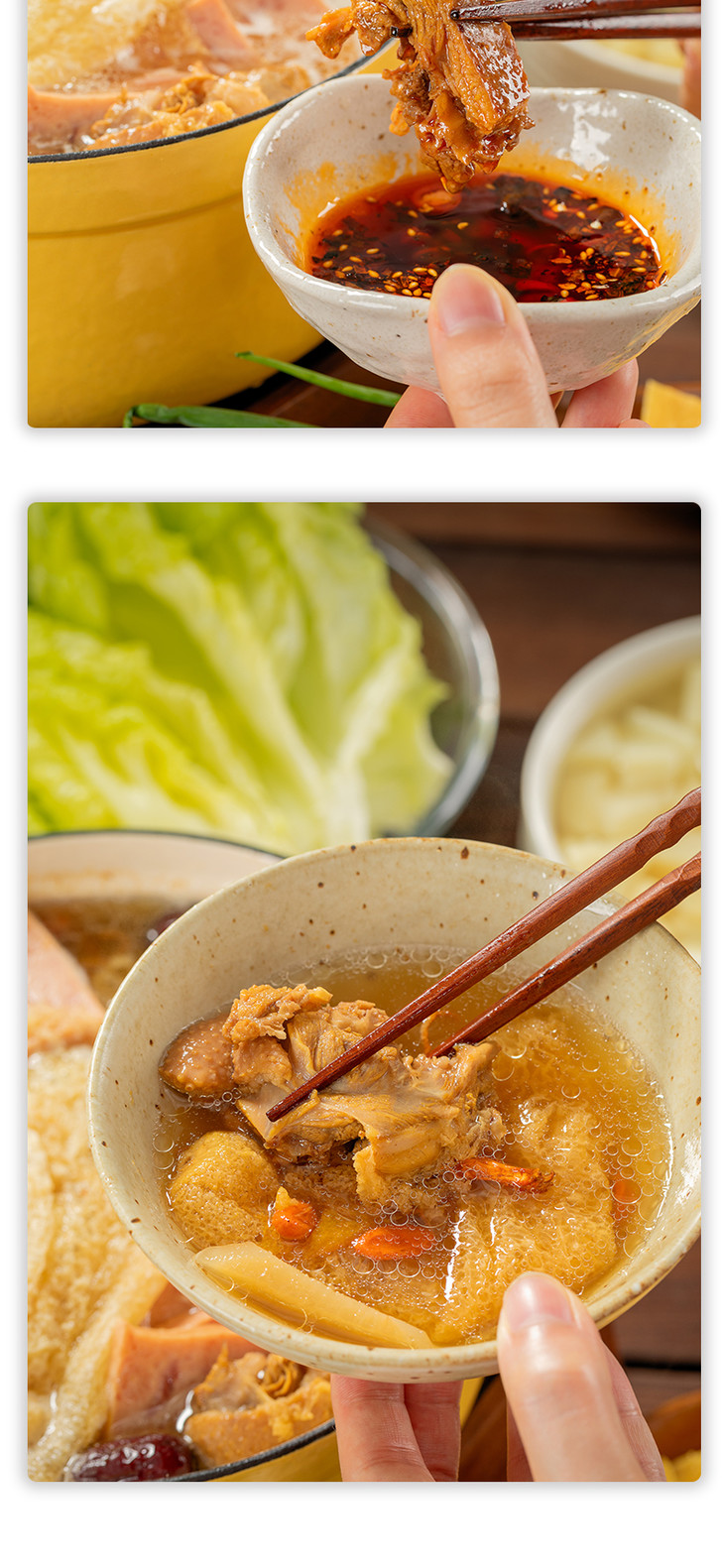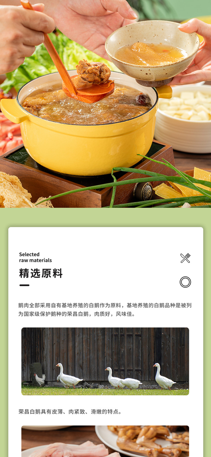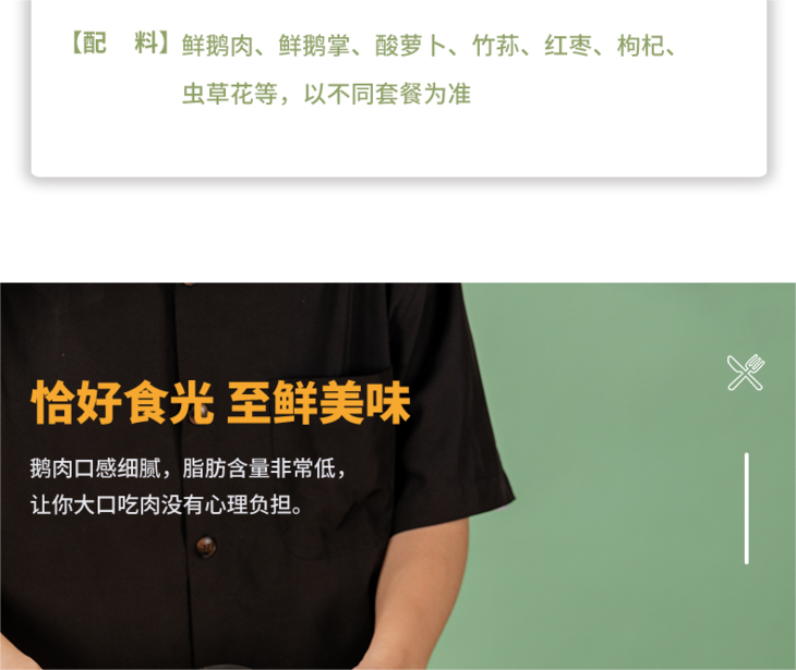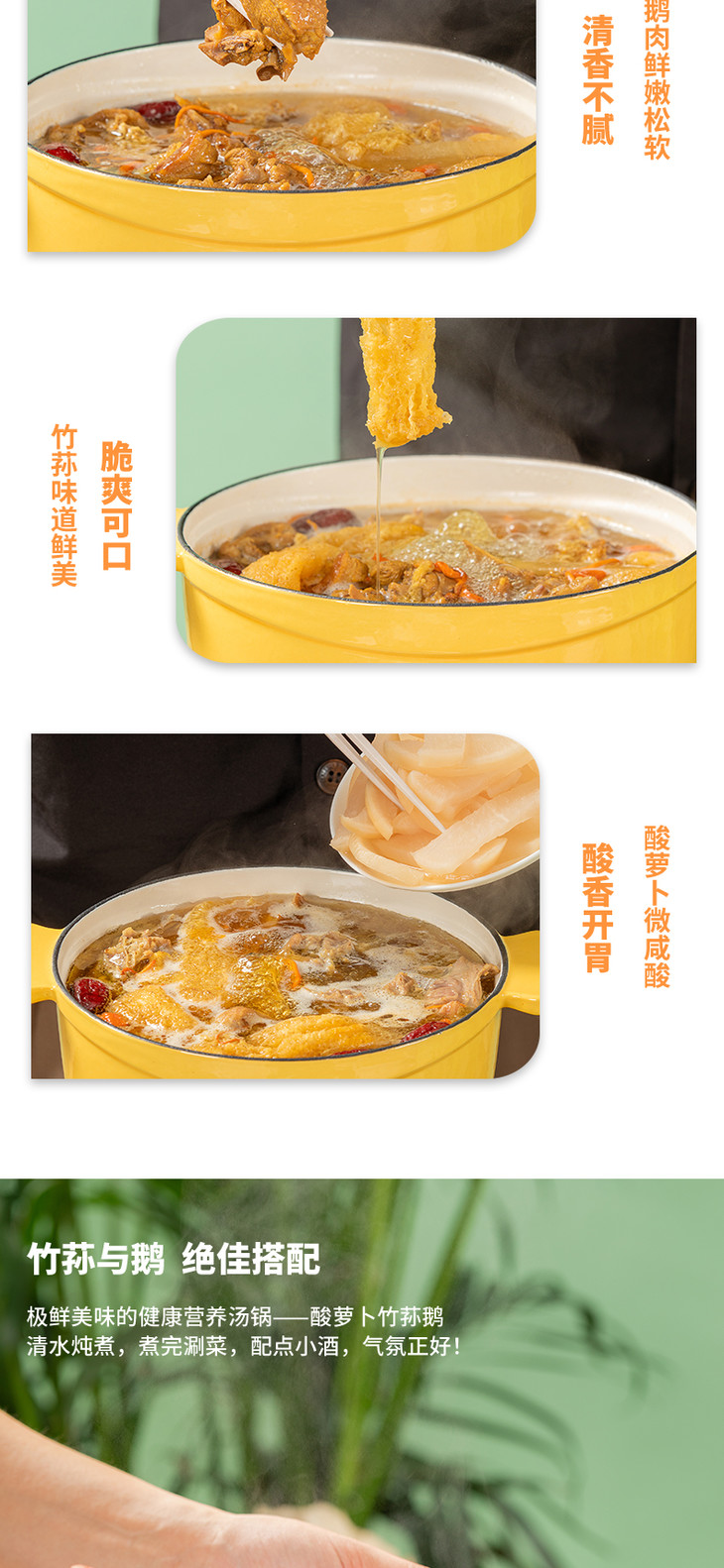 【产品配料】鹅肉,竹荪,鹅掌,虫草花,酸萝卜,红枣等