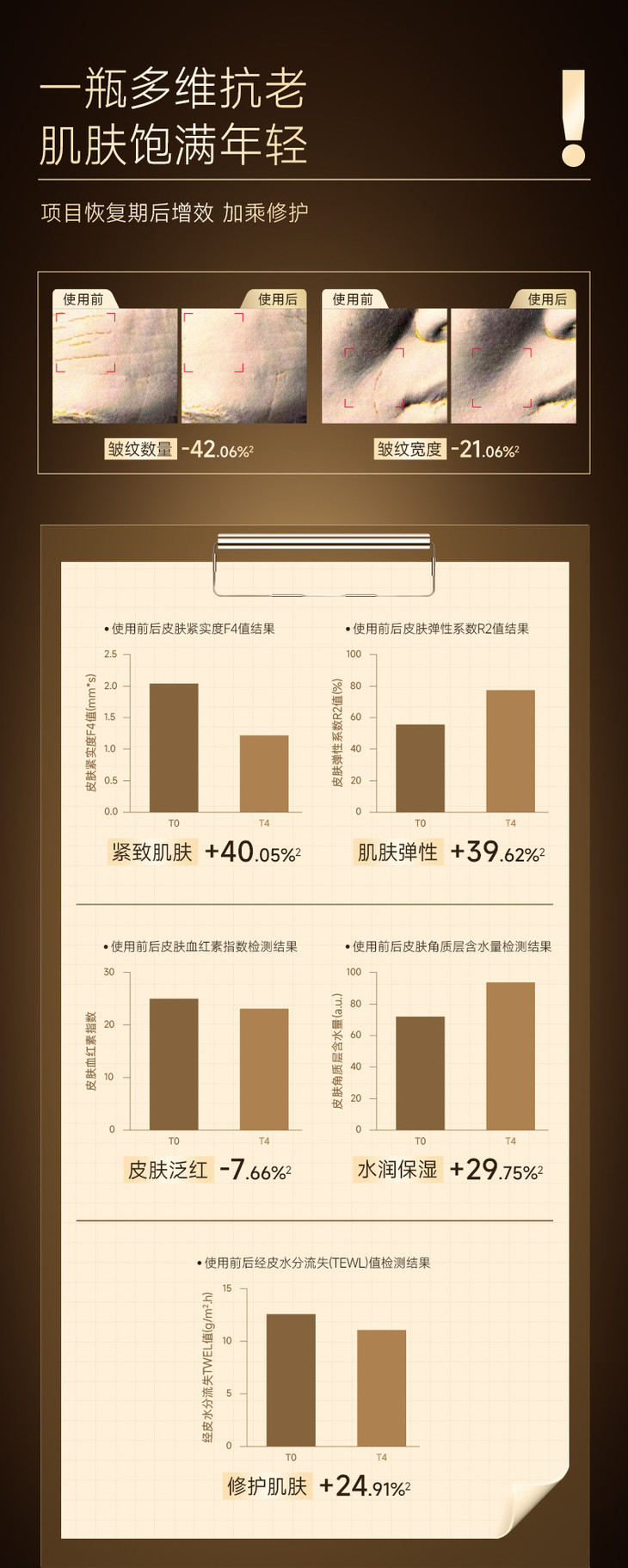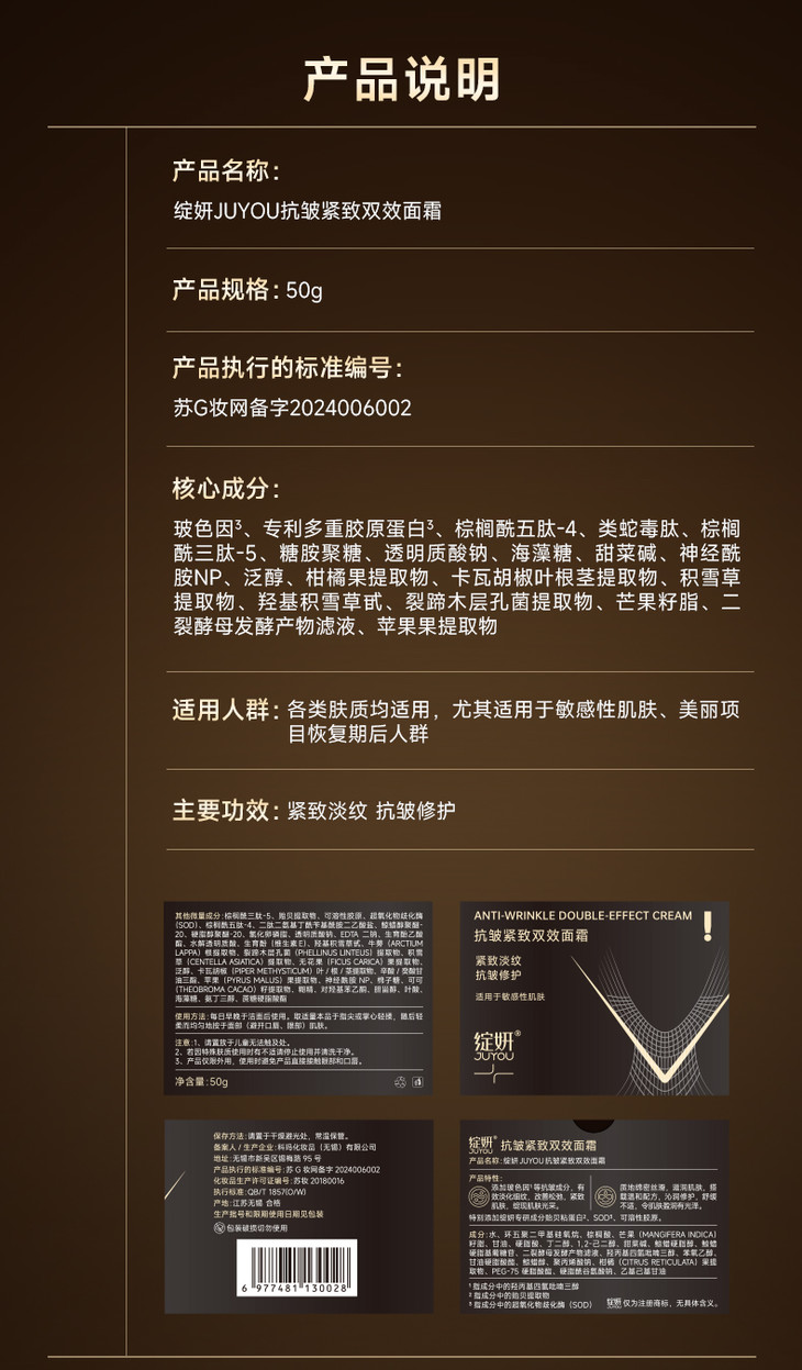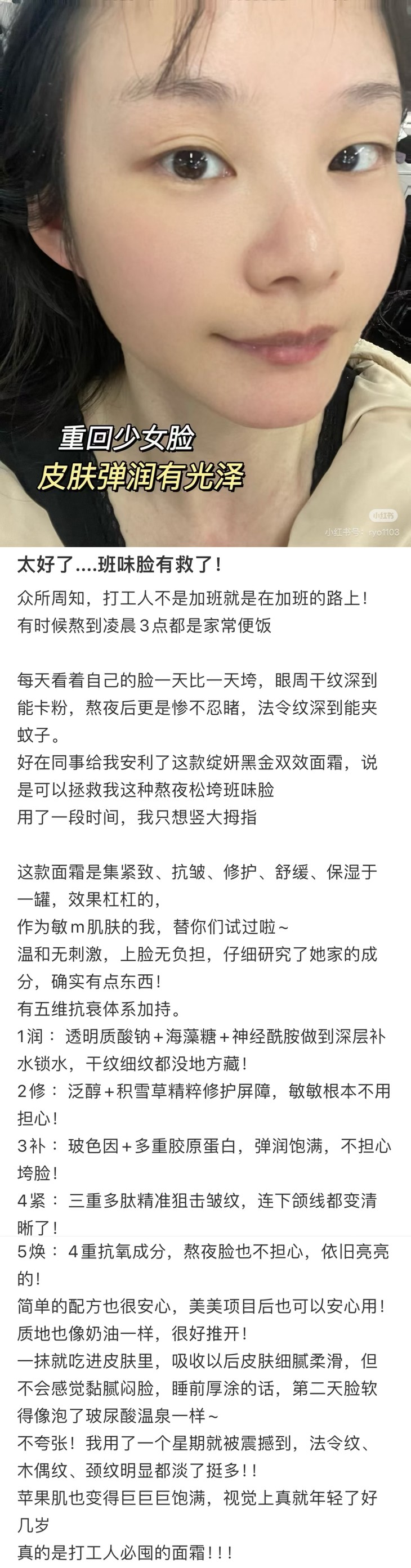 作为绽妍旗下的高端线,黑金多效面霜的抗老成分真的很厉害哦,三大核心构筑起立体护肤屏障!源自法国的黄金玻色因,凭借小分子结构直抵肌底,深度激活胶原蛋白生成机制,从根源改善肌肤松弛,显著提升轮廓紧致度,令细纹与皱纹逐渐隐匿,重现弹润光泽;品牌专利多重胶原蛋白更是与人体肌肤高度同源,能够实现“无缝对接”,快速填补流失胶原,重塑饱满嘭弹;重组贻贝粘蛋白则以超强抓水力持续为肌肤注入水分,打造全天候水润肌。还有三重抗皱多肽组合——棕榈酰五肽-4、类蛇毒肽、棕榈酰三肽-5,如同精密的“细胞信号指挥官”,精准调控胶原蛋白合成,加速新陈代谢,淡化已有纹路的同时,更有效预防新生皱纹,让肌肤由内而外焕发细腻平滑。