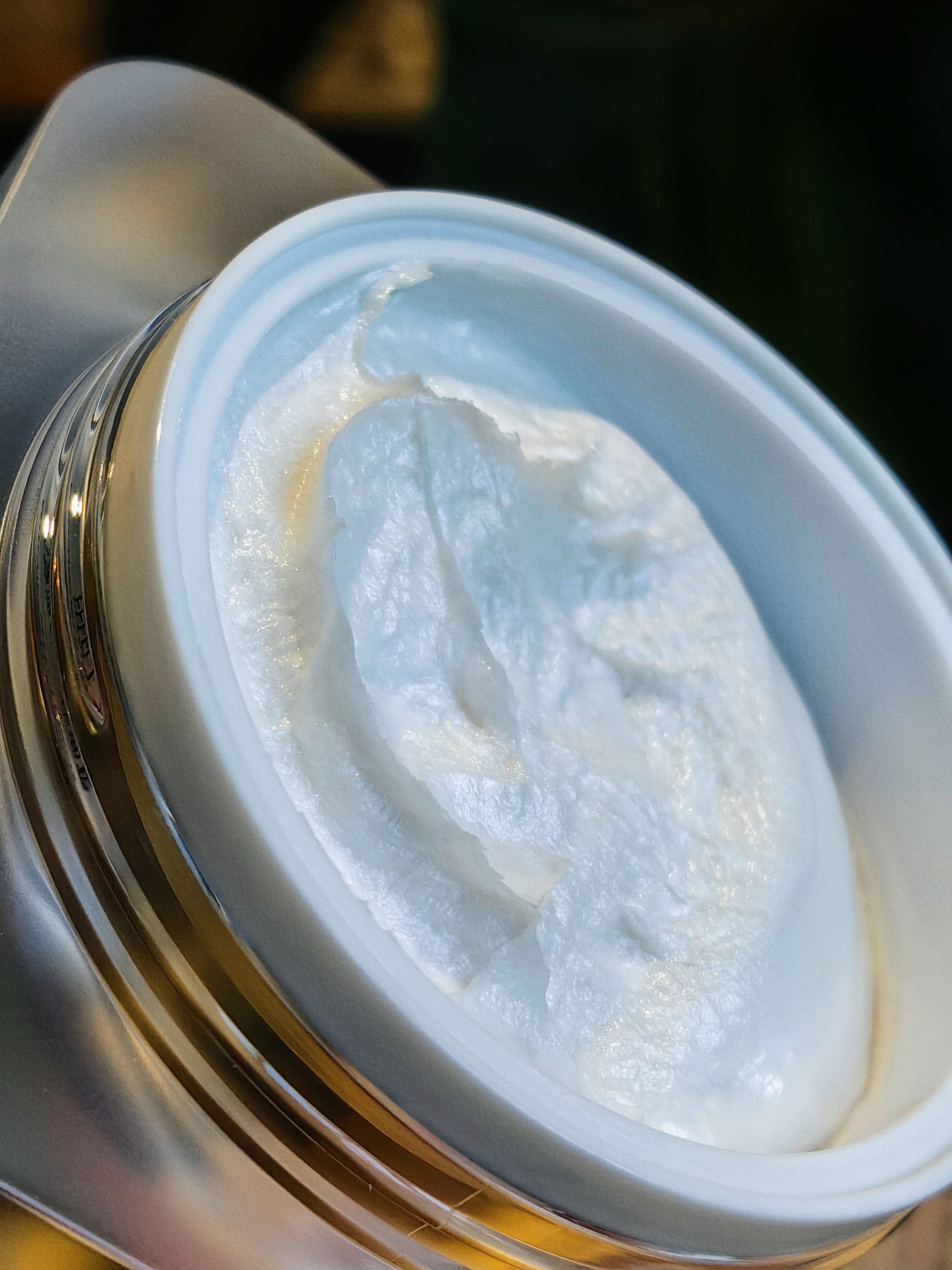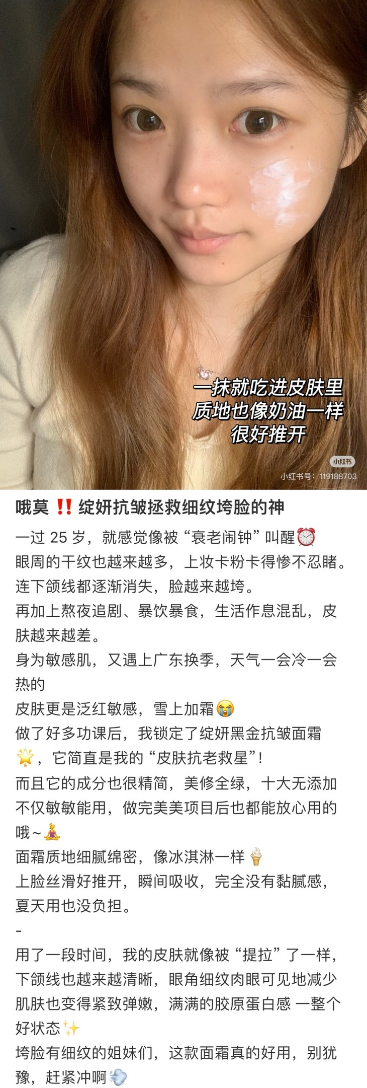 黑金系列的罐罐也是蛮美貌的,有着和200块都不到的身价完全不附的高级。绵密丝滑的乳霜质地,触肤即融,一抹推开,留下沁润修护的舒适肤感,完全不会黏腻,但非常非常润滑,细腻度和光泽感真的大提升,和润百颜玻胶霜有一拼!可以早晚用在精华后,配合轻柔按摩,作为护肤步骤的“黄金封层”,将保湿、修护、抗衰进行到底,有基础抗老需求的老粉,超推荐这罐的,把脖子也带上!
