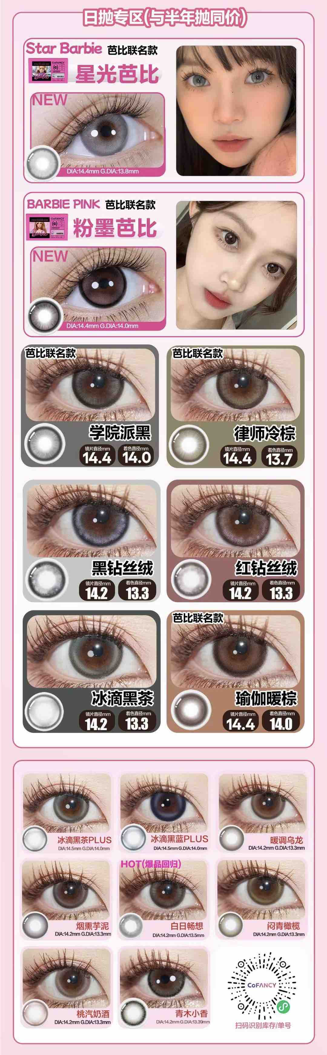可糖双旦芭比活动王炸来袭!找我买就是优惠一些啦!赠品也拿到手软哦!活动 128/2盒;218/4盒;338/6盒 赠品全有(日抛半年抛可以混搭选)备注款式度数哈