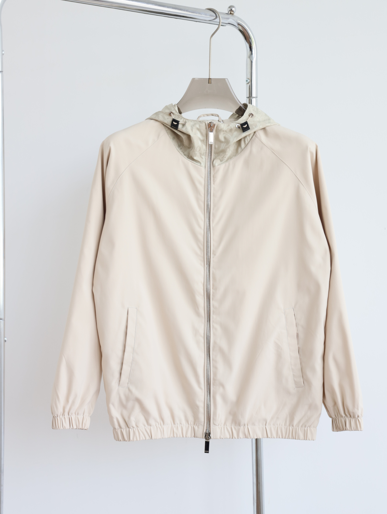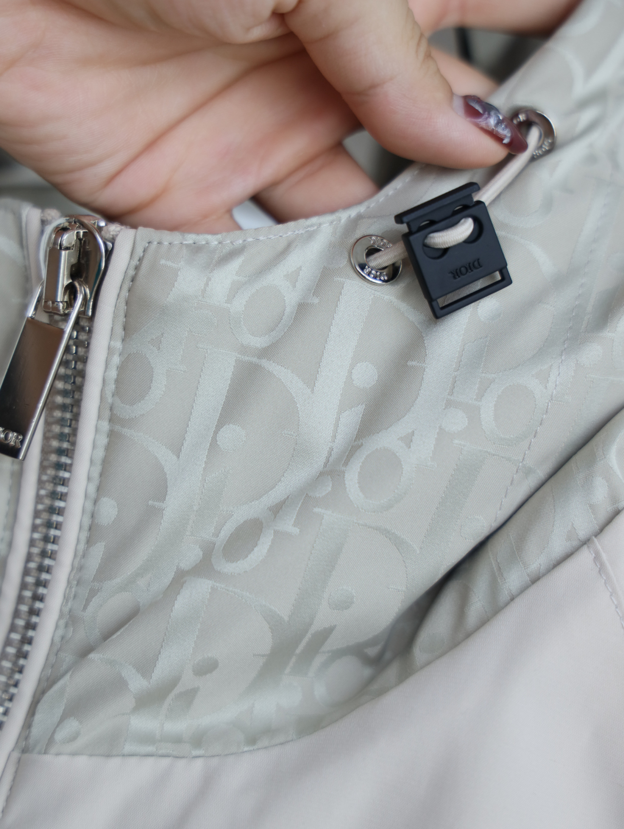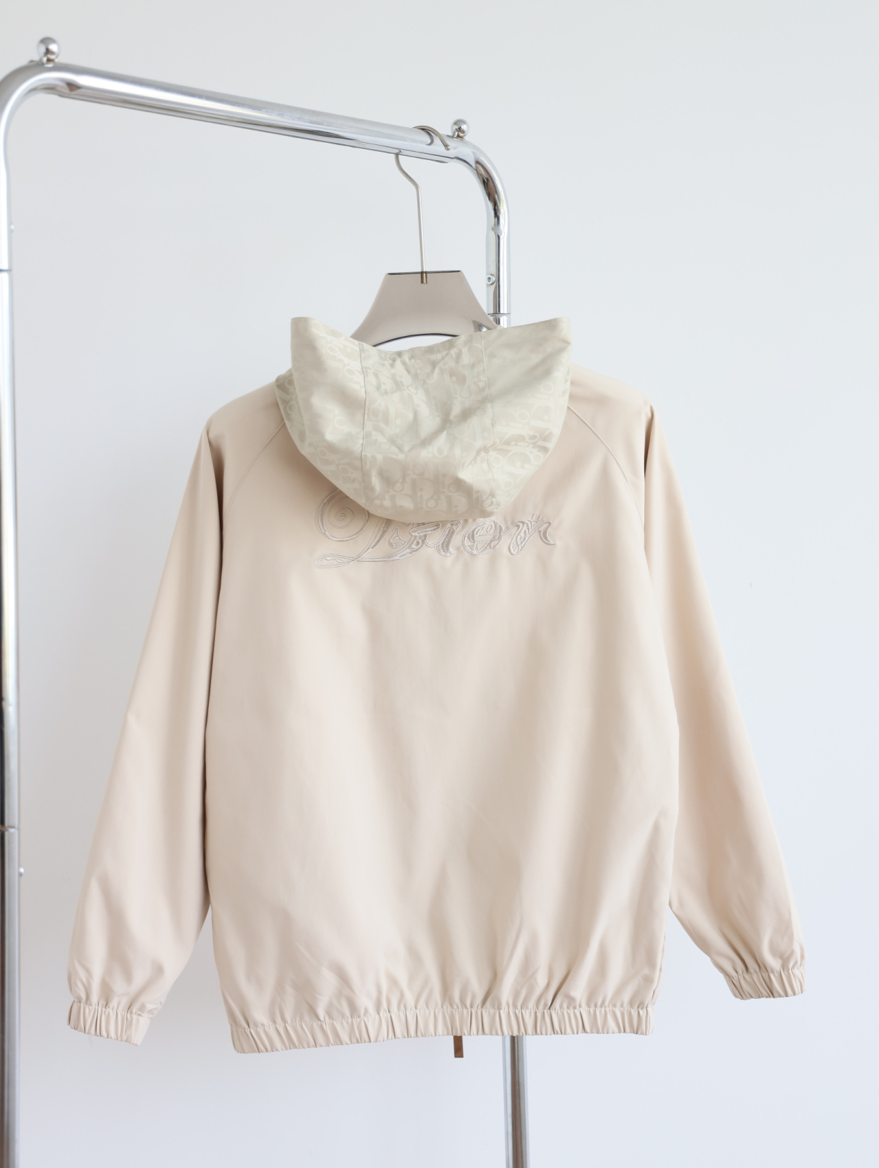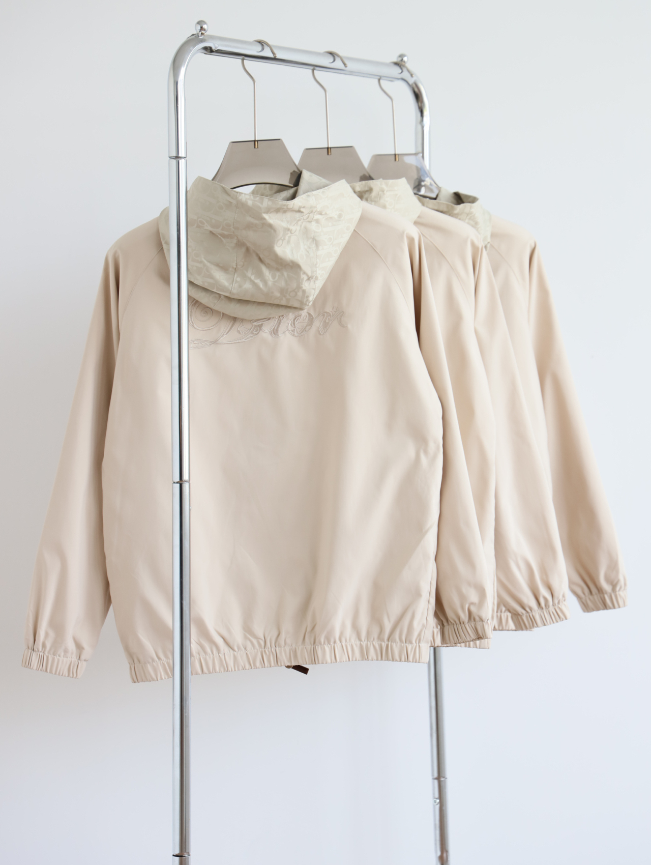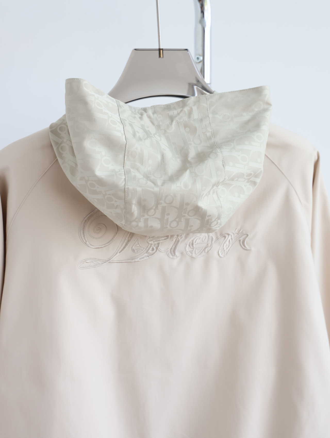 卡其色单色,连帽是西D老花的样色,大身纯色,后背也是同色系刺绣印花