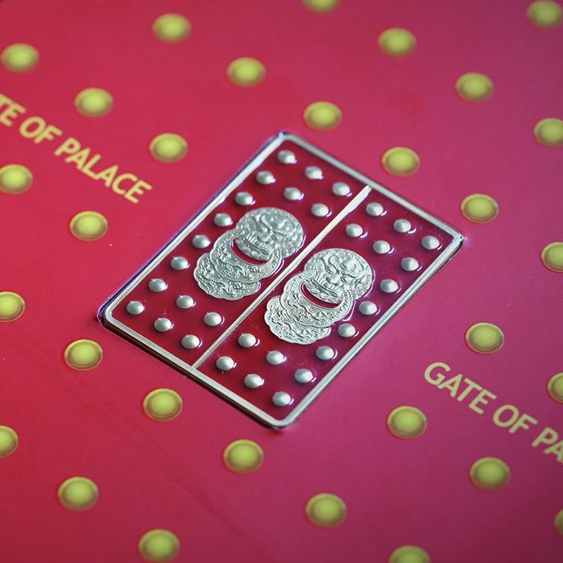 首先,为了更好表现宫门的朱红色的效果,其果断放弃了常用的彩印技术,而采用了复杂的珐琅彩工艺!