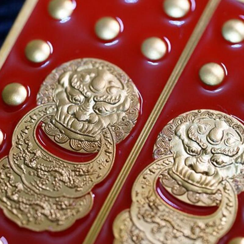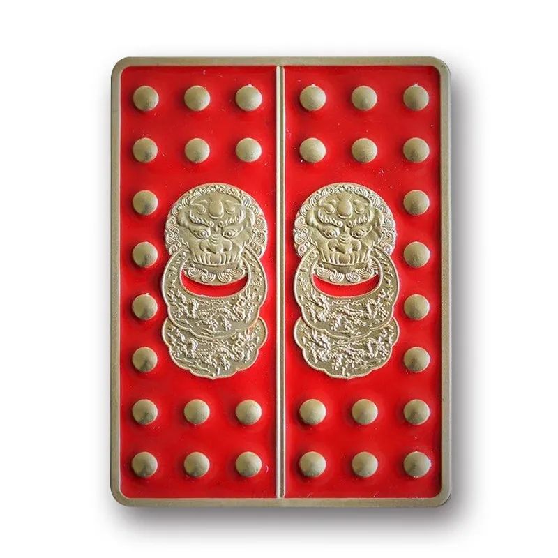 另外,这枚币整体采用了鎏金的工艺,使得正面的门钉和铺首大气磅礴,和红色的珐琅相得益彰!