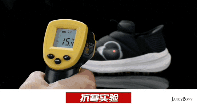 往鞋子上狂喷冷却剂模拟极寒天气状态,鞋子表面已经降温到-15.4°C了。