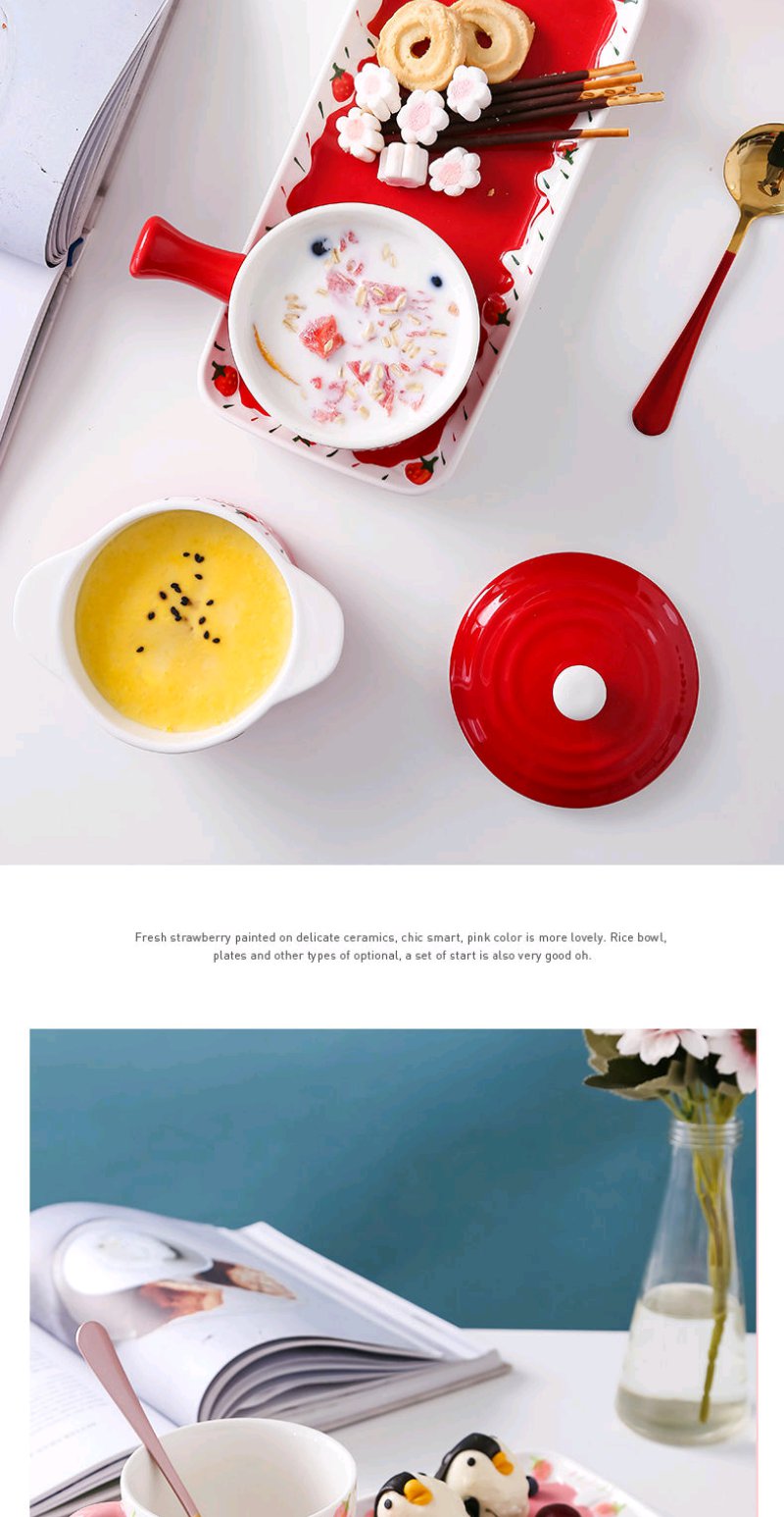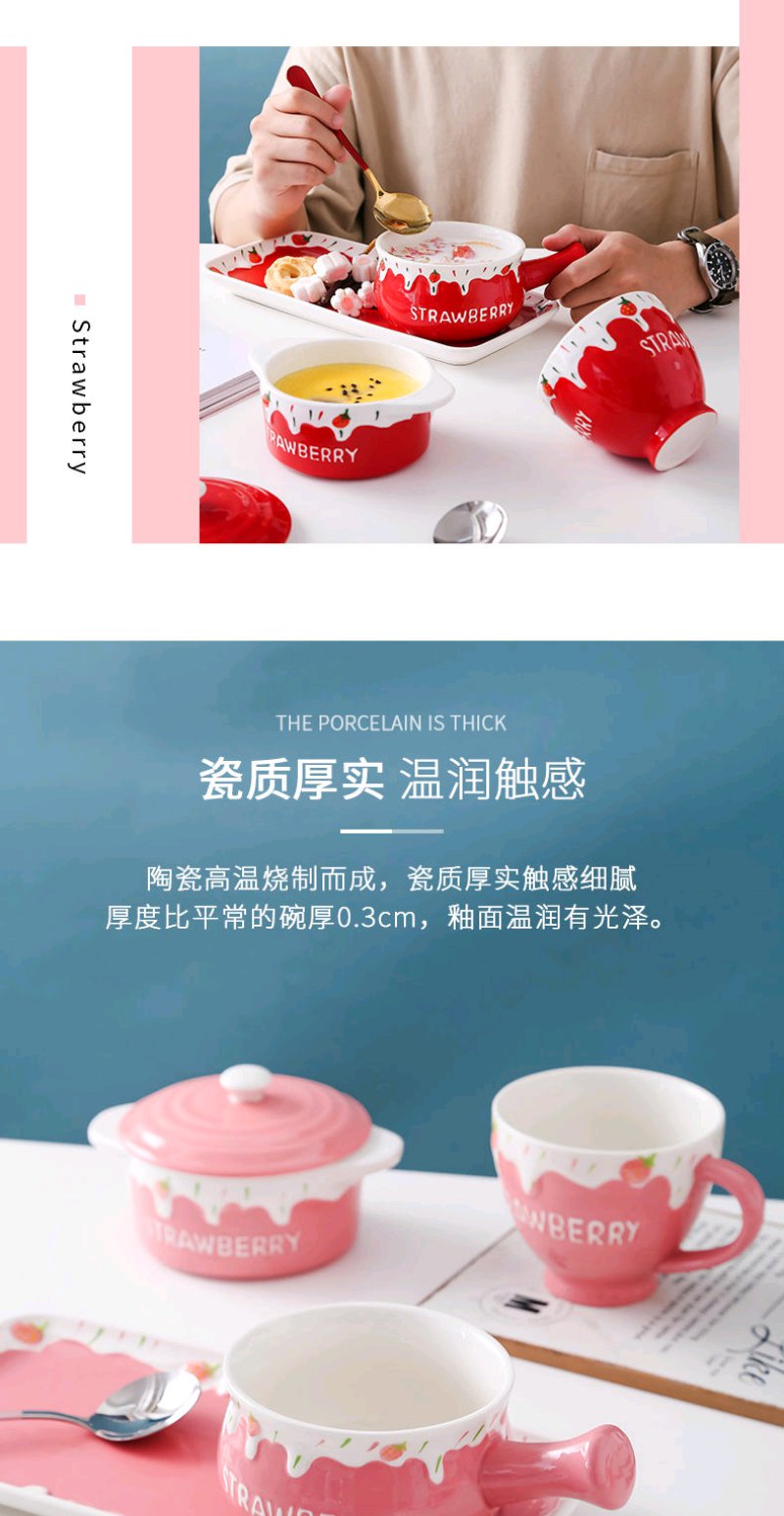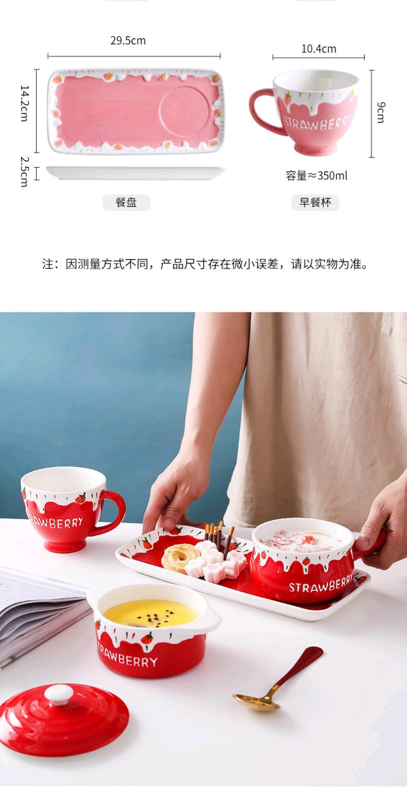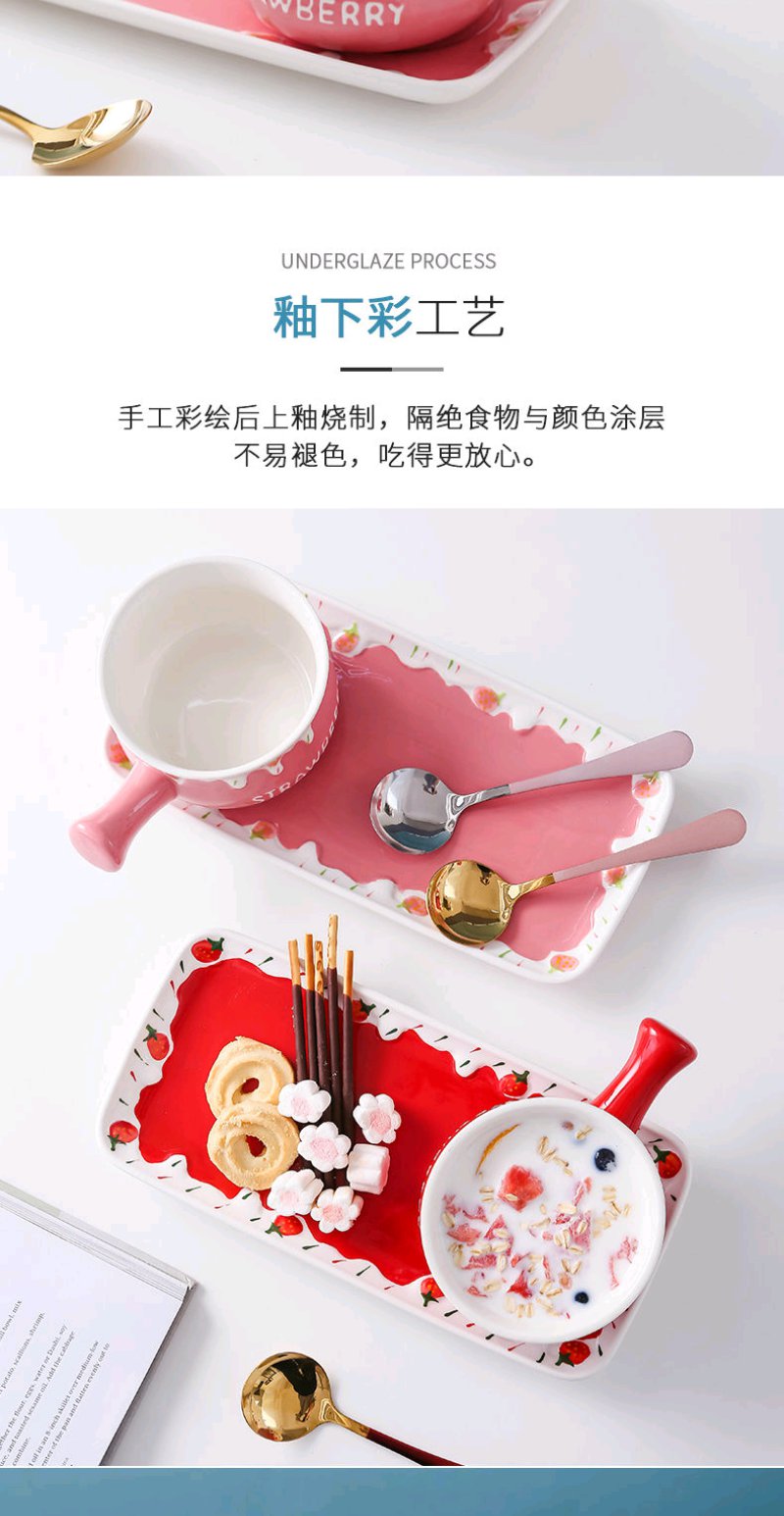 wa'g'h草莓陶瓷早餐碗盘组合 创意可爱少女心单柄碗手柄甜品碗一人食套装