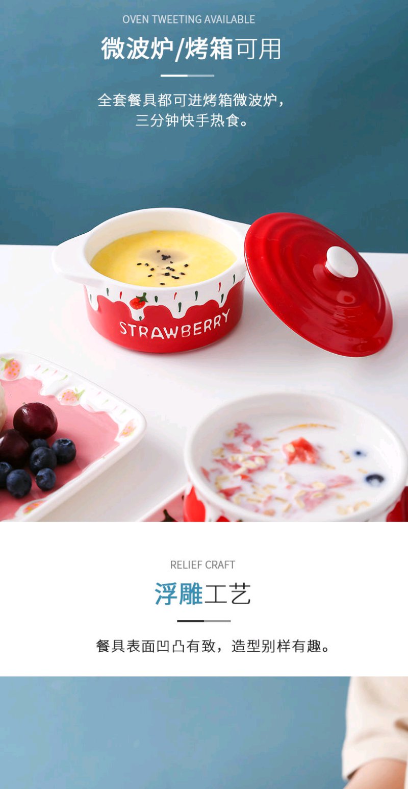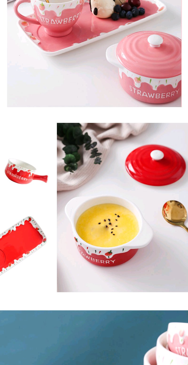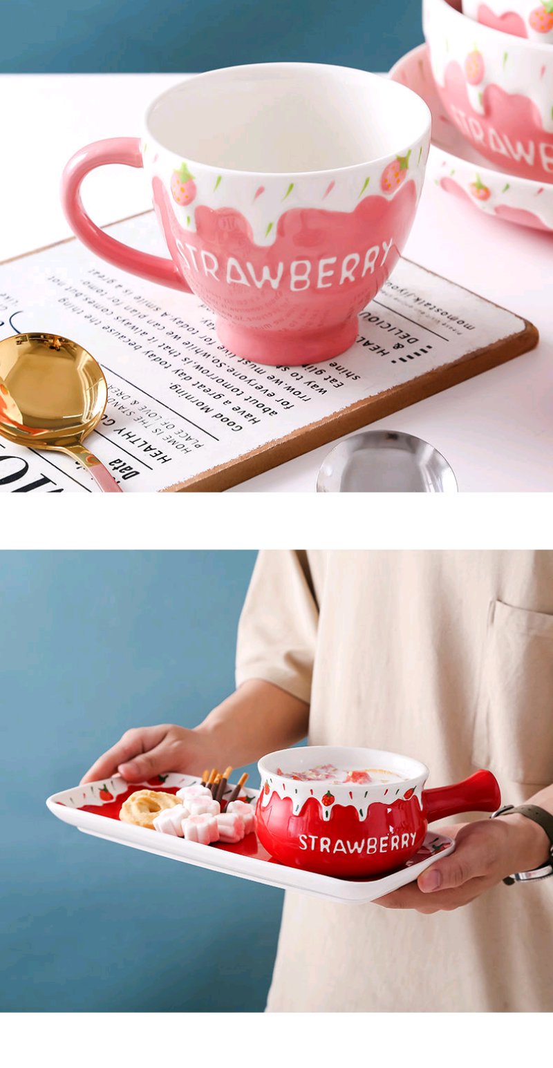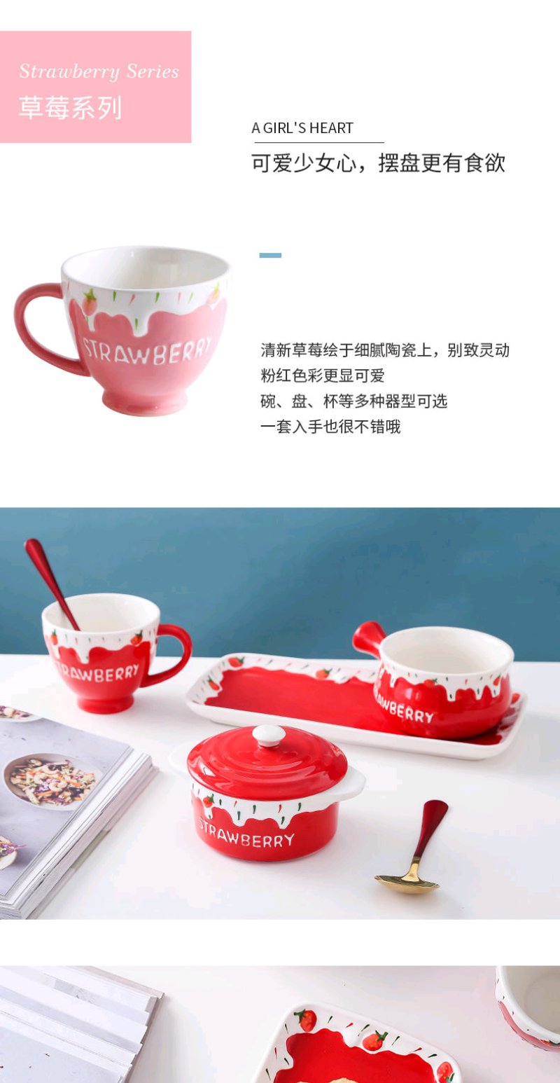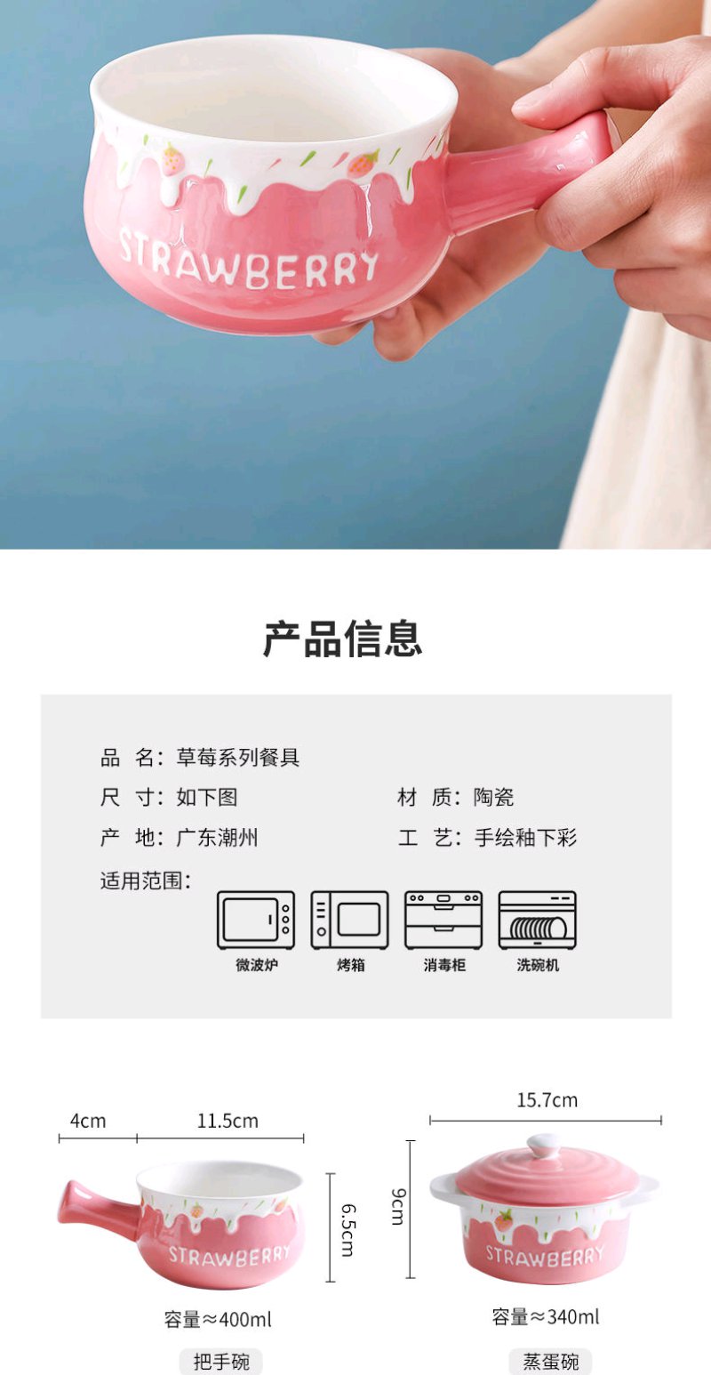 wa'g'h草莓陶瓷早餐碗盘组合 创意可爱少女心单柄碗手柄甜品碗一人食套装