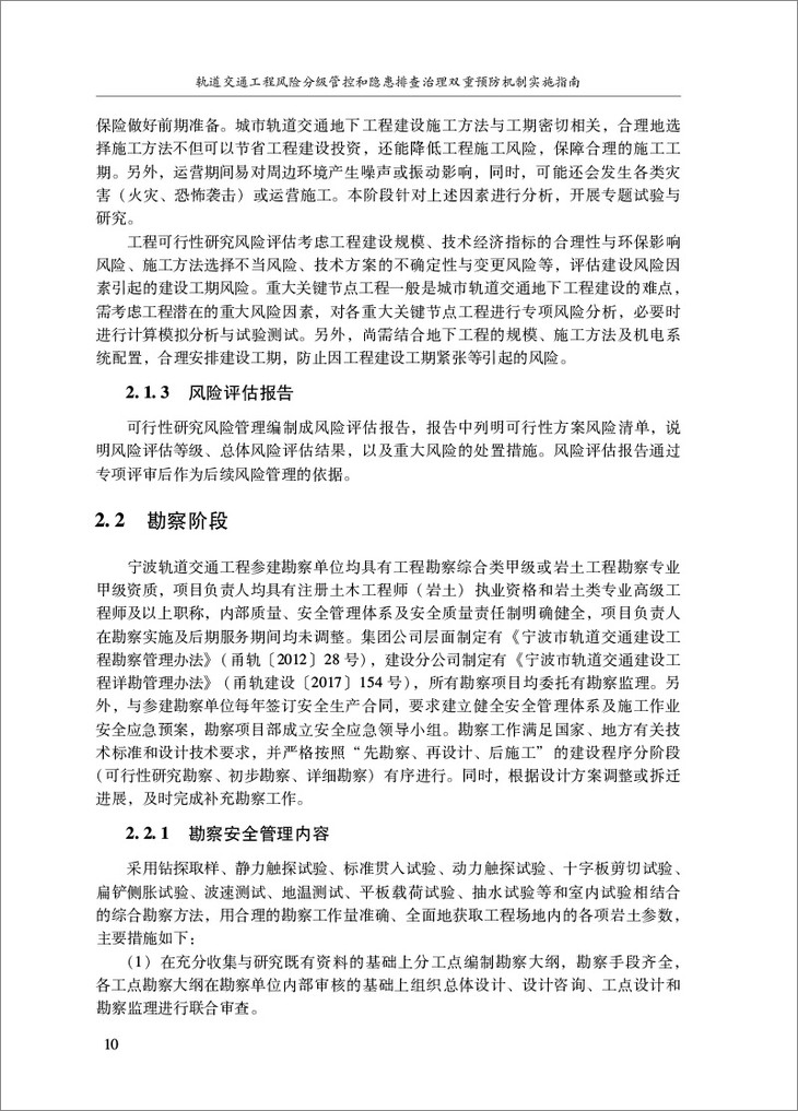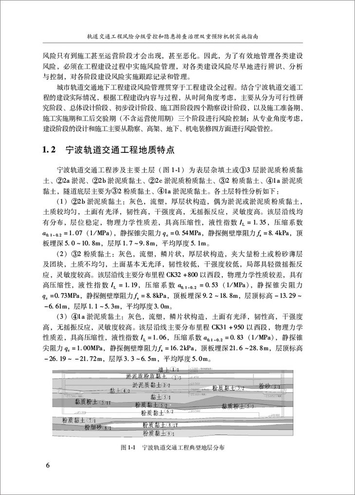 当前宁波市正全力发展轨道交通,工程施工安全特别是自身结构安全和周边环境保护面临极大挑战:宁波软土地层具有“天然含水量高、压缩性高、灵敏度高、触变性高、流变性高、强度低、透水性低” 等特点,淤泥质土地质改良难度大、成本高;地下工程施工变形和沉降难以控制;工程地下水位高、江河密布、道路纵横交错、老旧建筑物基础复杂、地下暗埋多条管线、社会企事业单位建设活动频繁;既有运营铁路、公路、地下线路需要精细保护……类似地质条件的地铁城市的安全管理都压力极大。轨道交通工程建设者将如何开展风险管理,如何形成一套有效的风险控制方法,这是必须面对和认真解决的难题,安全事故的预防机制建设是当务之急。宁波轨道交通工程建设者积极响应国家、省市号召,自2018年年初开始深入“风险分级管控”和“隐患排查治理”双重预防机制建设试点工作,针对基坑、盾构、高架、机电安装工程各专业试点经验总结形成本书,对轨道交通工程建设构建双重预防机制具有较强指导和借鉴意义。
