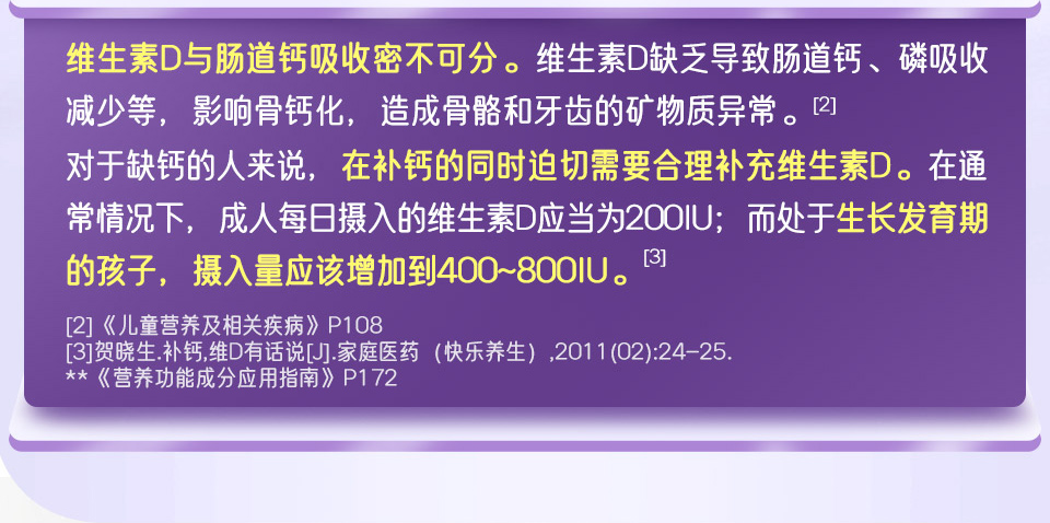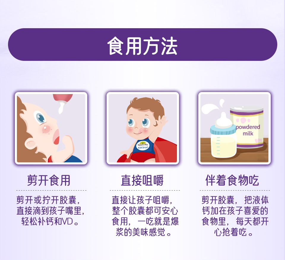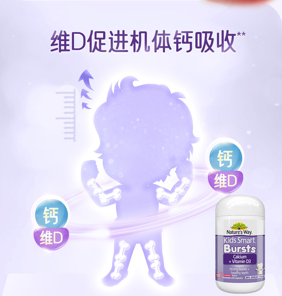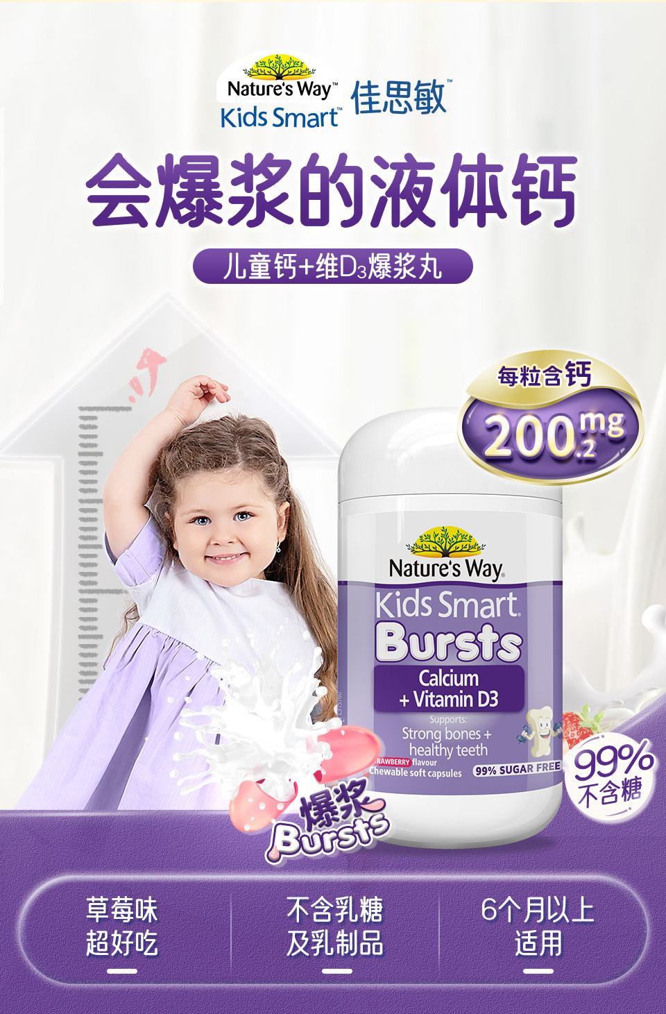 Nature's Way 儿童钙元素+维生素D3草莓营养咀嚼胶囊,钙质对于孩子的骨骼成长和健康是很重要的。钙能维持神经肌肉正常的兴奋性,缺钙时,神经肌肉的兴奋性增高,易出现手足抽搐的现象。幼儿在发育期,每天需钙、磷各1克以上,钙与磷的吸收是否良好,直接影响骨的钙化。维生素D能促进钙和磷的吸收。在孩子的成长过程中,钙是身体中很重要不能缺少的矿物质成份。本产品能帮助孩子吸收他们一天所需的钙质。钙质对于孩子的骨骼成长和健康是很重要的;钙在人体内总量为1300g,约占人体重量的1.5%~0.75%,99%存在于骨骼。
