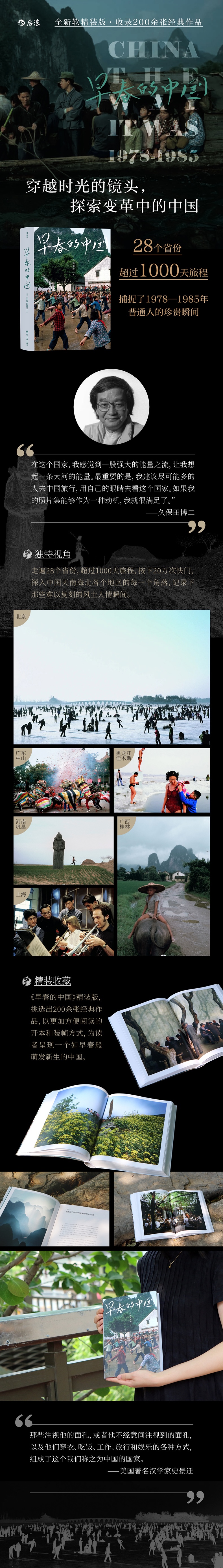 1978至1985年期间,日本摄影师久保田博二花了1000多天,几乎走遍了中国全部省份,拍摄了超过20万张彩色照片。他敏锐的政治学眼光注意到中国正处在一段历史的起点。他来到中国,和老百姓一起住人民公社、上旱厕、坐牛车,不动声色地观察中国的方方面面,用镜头记录中国人的衣着、饮食、工作、旅行、娱乐。他同时捕捉到深刻的传统元素和新的表达方式。本书以《早春的中国》精装版为基础,挑选出200余张尤为经典的作品,以更加方便阅读的开本和装帧方式,为读者呈现一个如早春般萌发新生的中国。