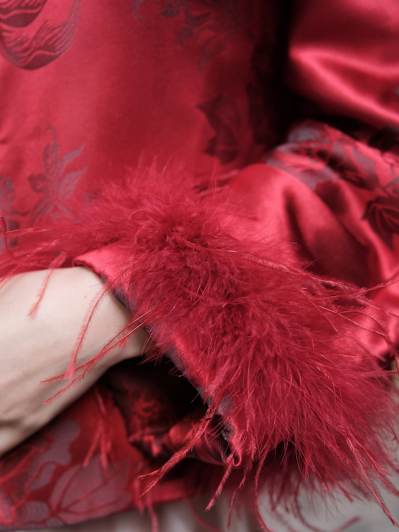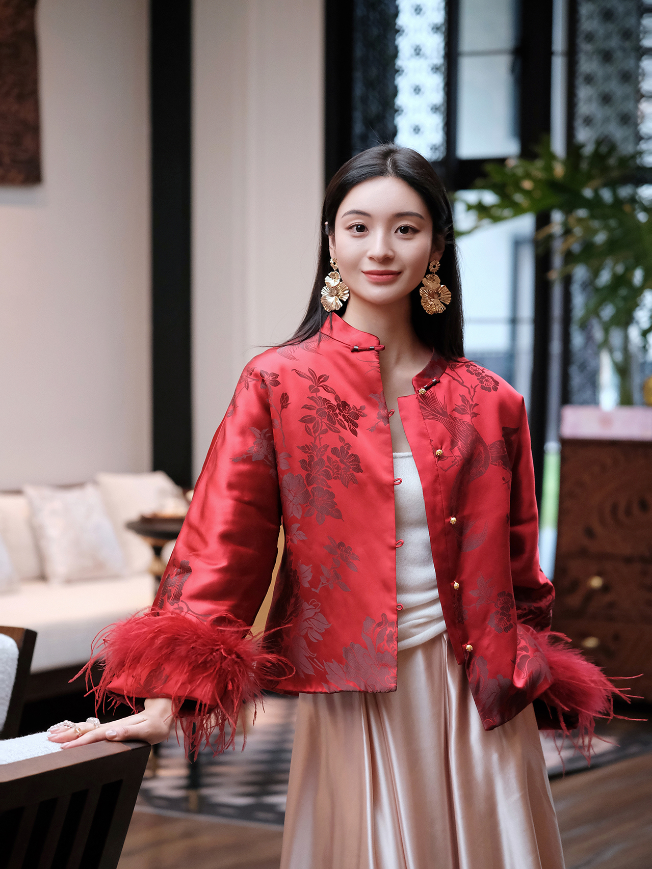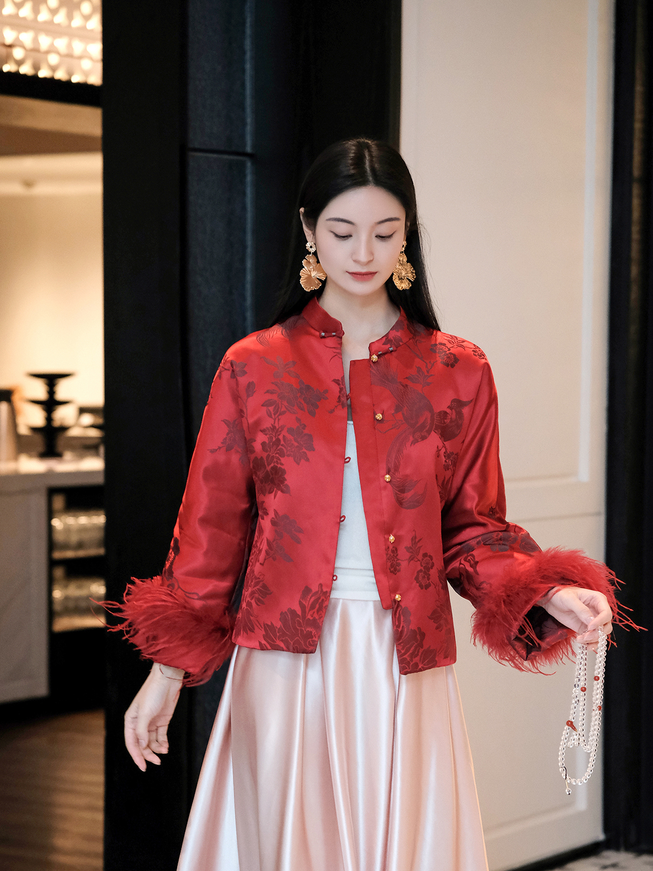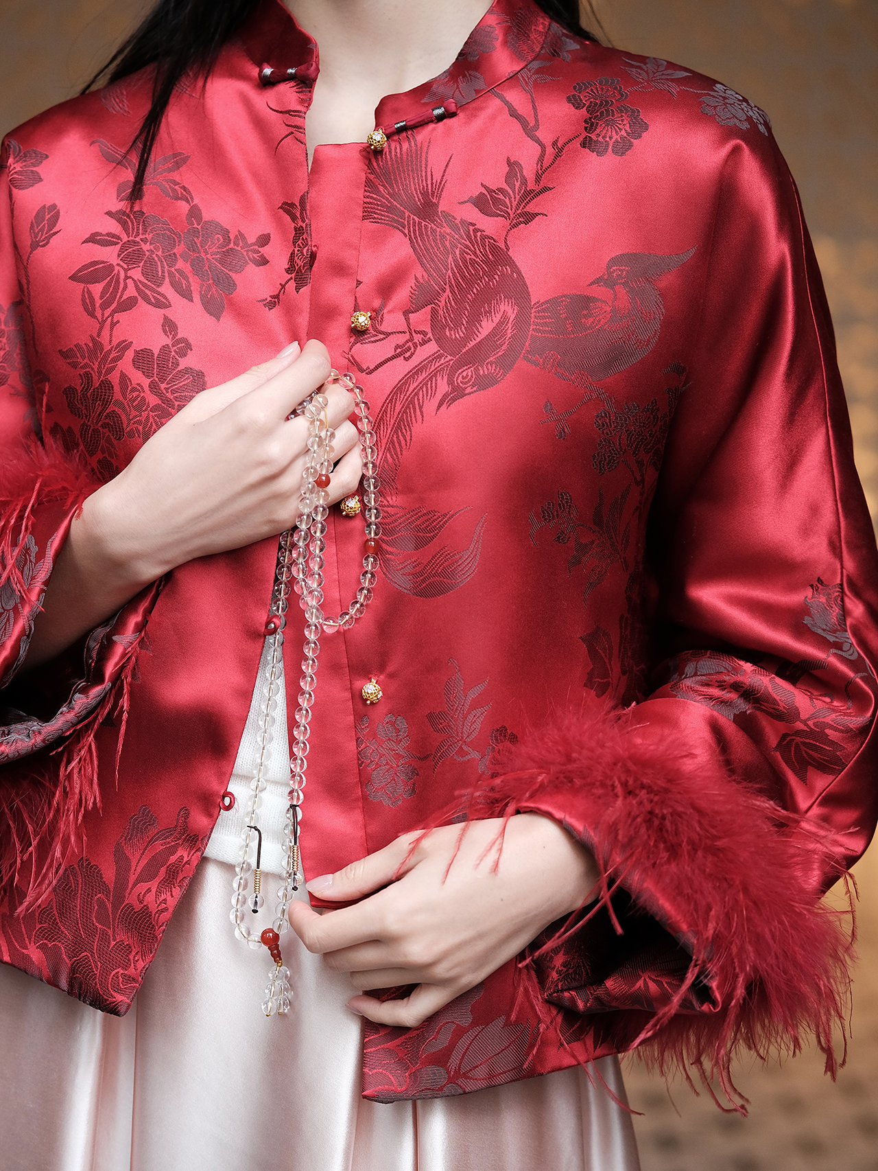 盛唐婧 | 新中式软缎提花驼鸟毛对襟外套-红色
