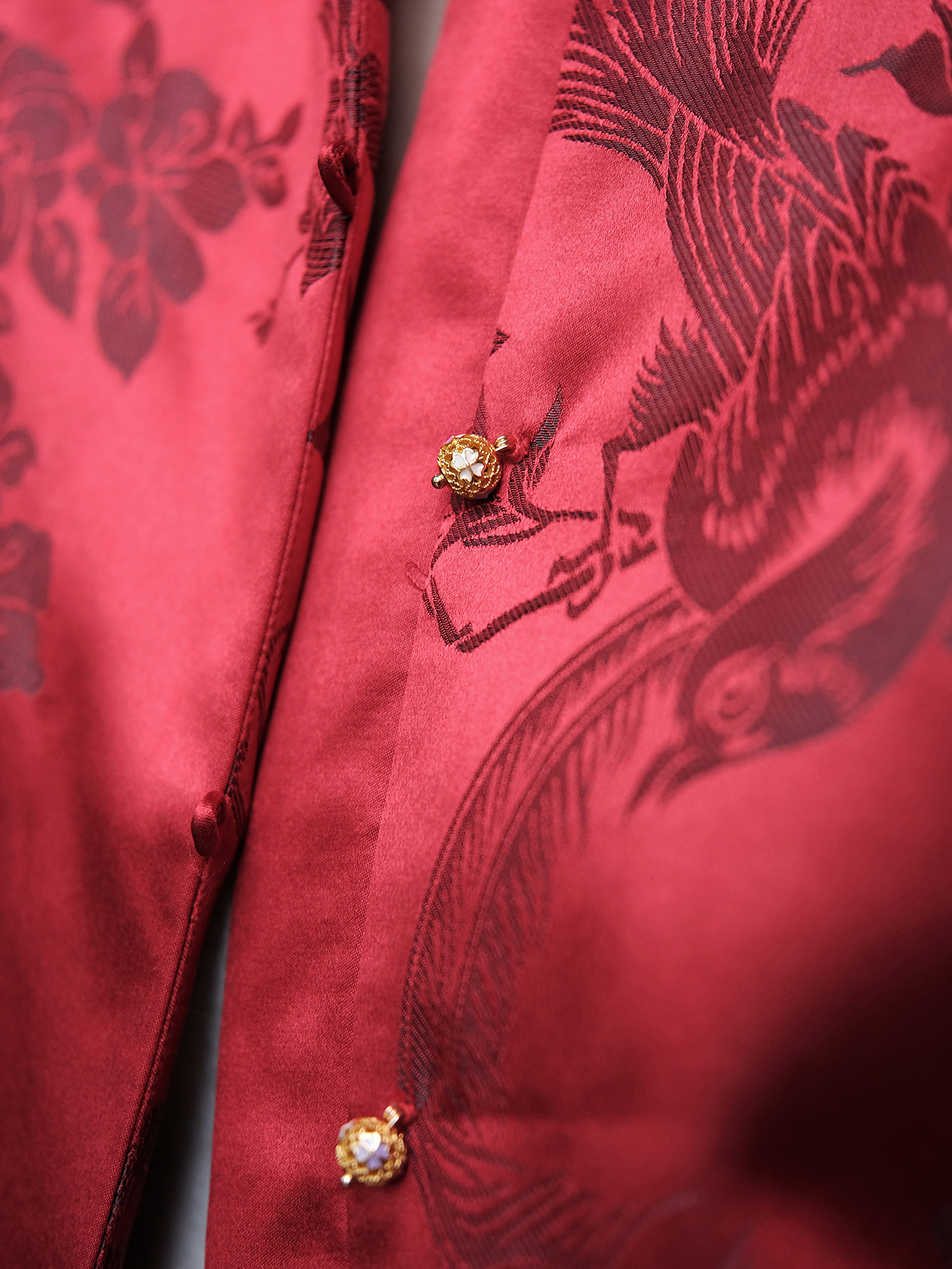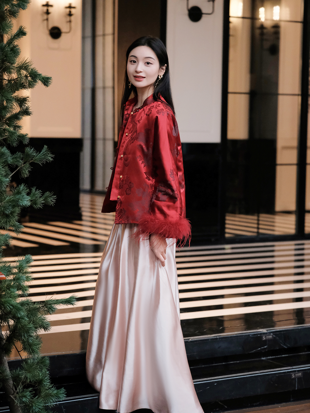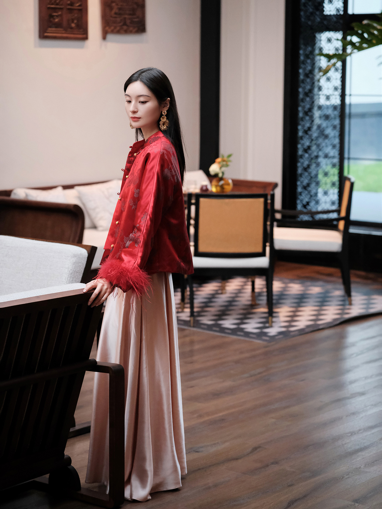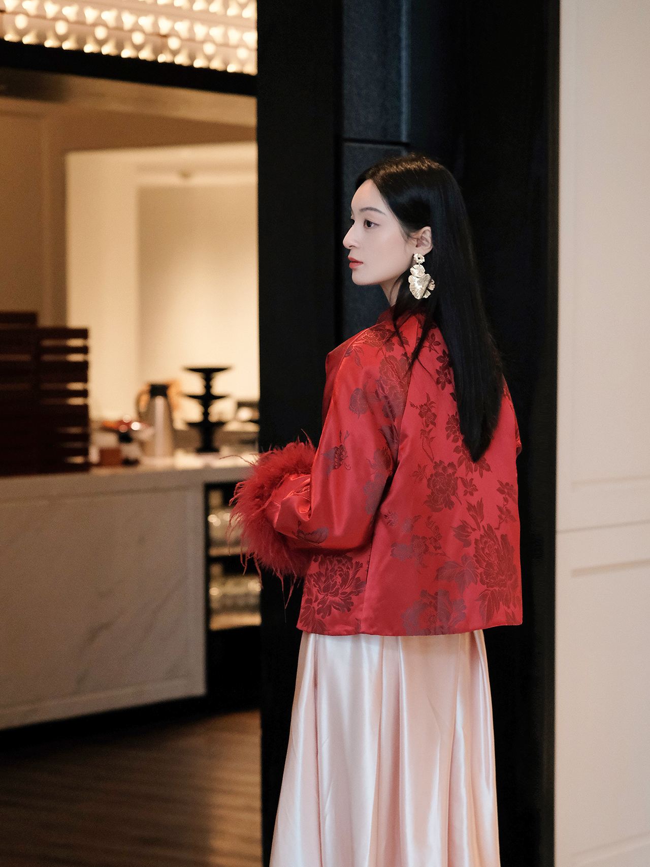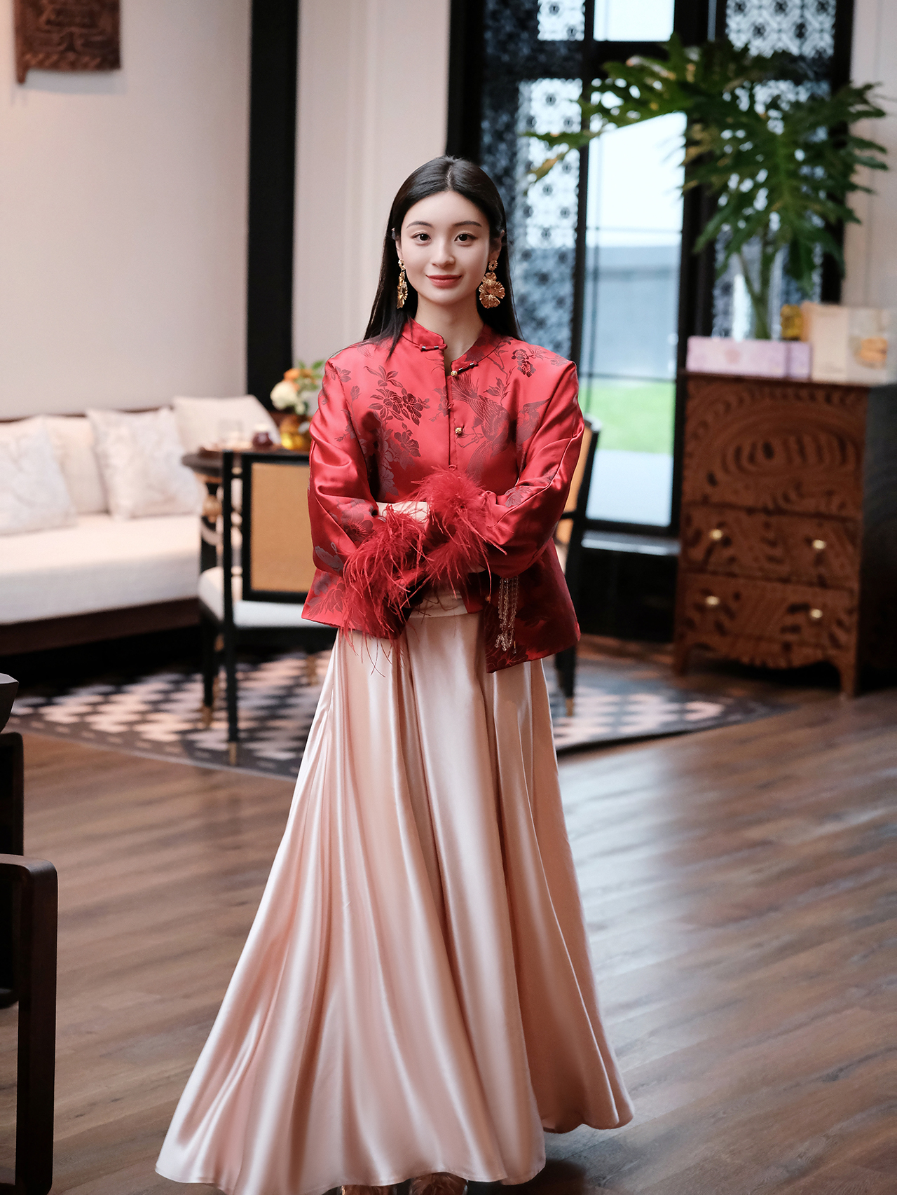 盛唐婧 | 新中式软缎提花驼鸟毛对襟外套-红色
