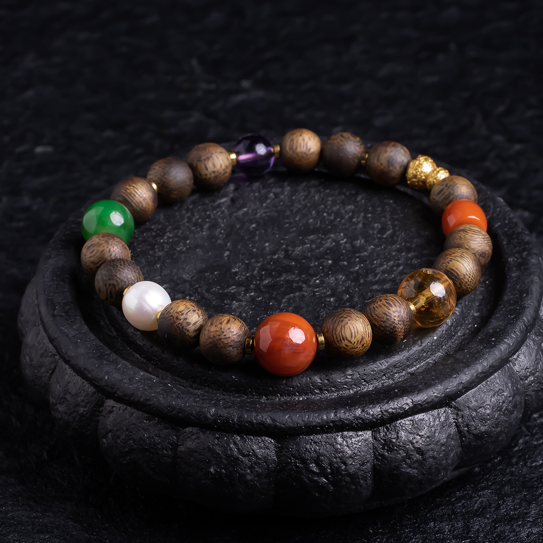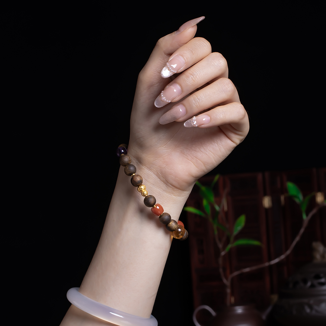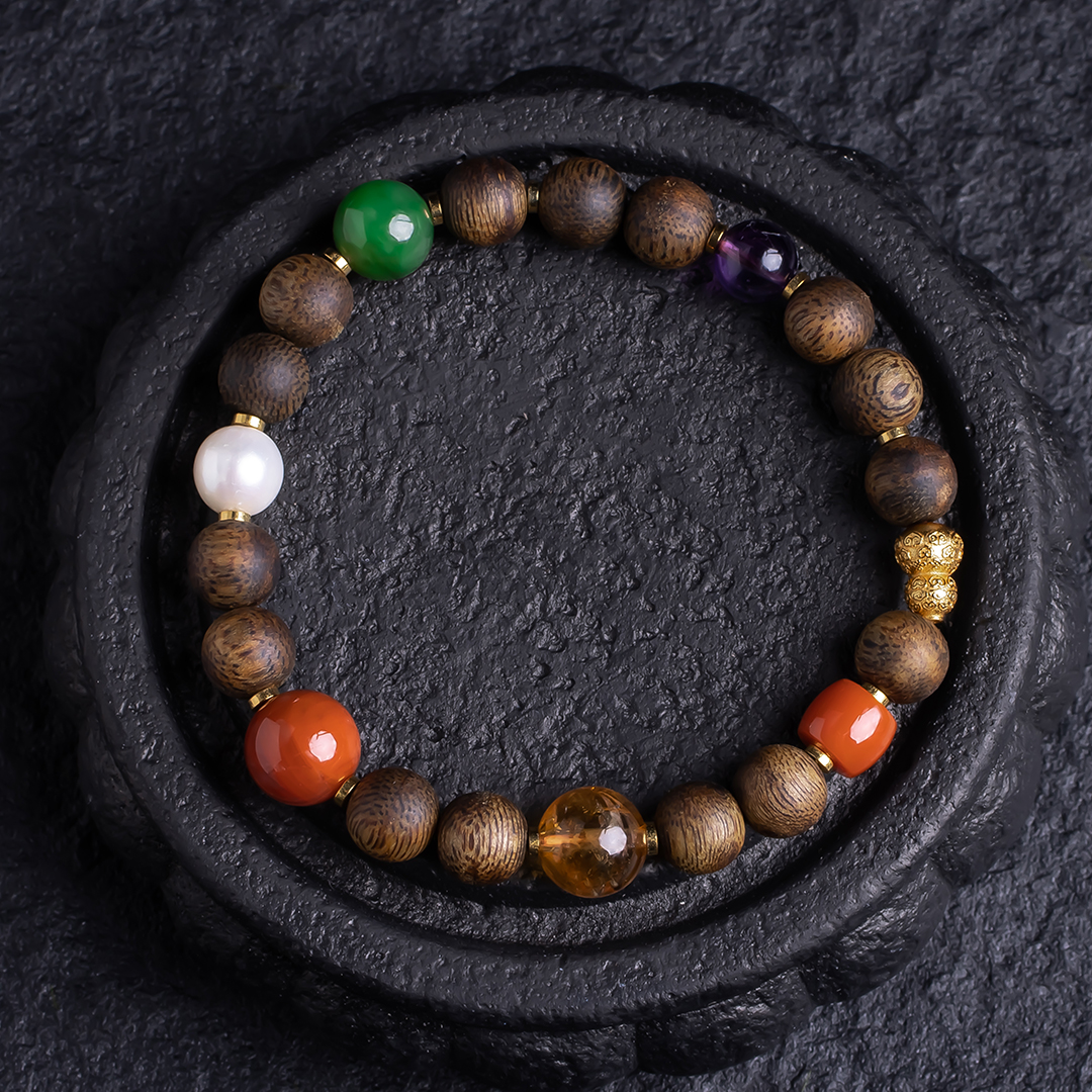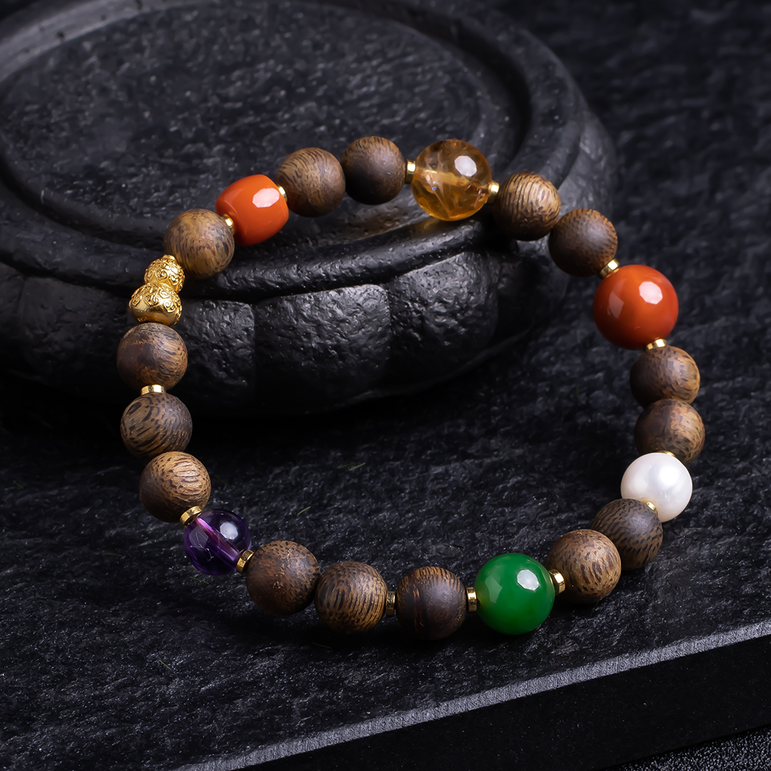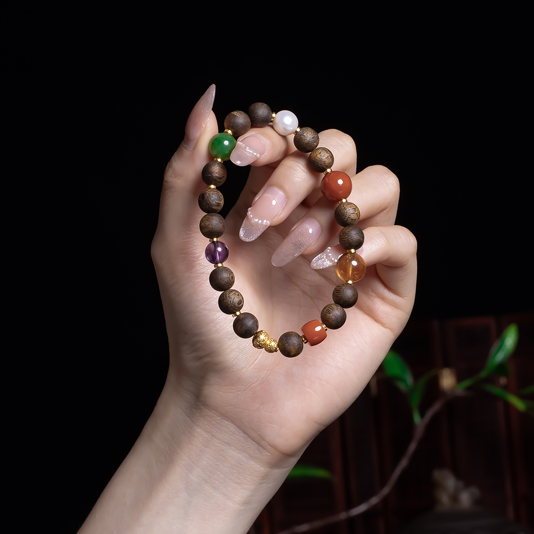XY0378沉香+南红碧玉水晶多宝手串,天然沉香约8.3mm,原色原味,香味自然清甜,多宝搭配,水晶南红的寓意大家懂,这里不能说,国潮多彩混搭风格,古典之中又带着时尚的活力。